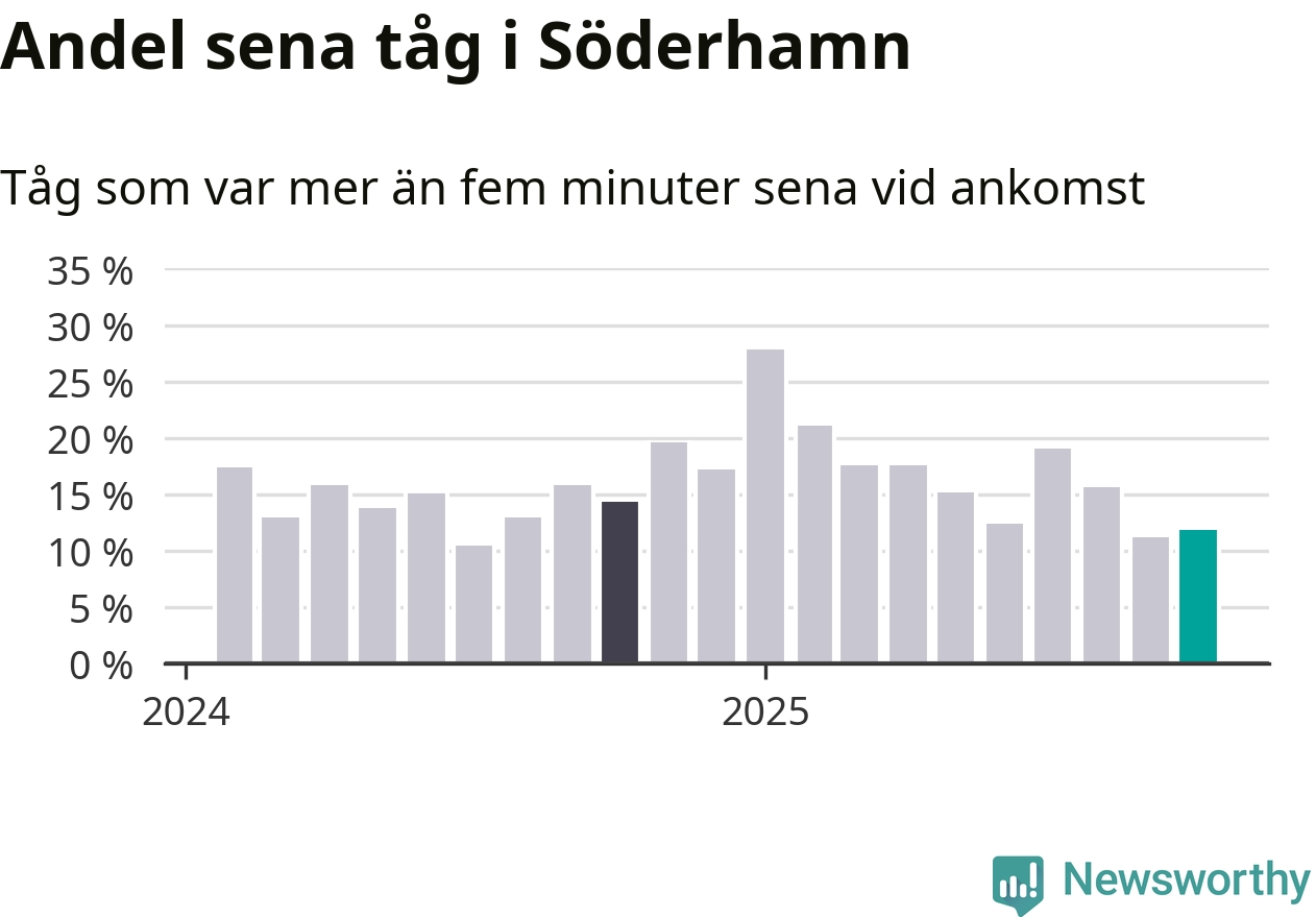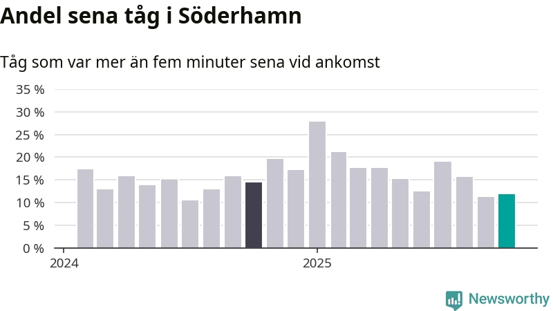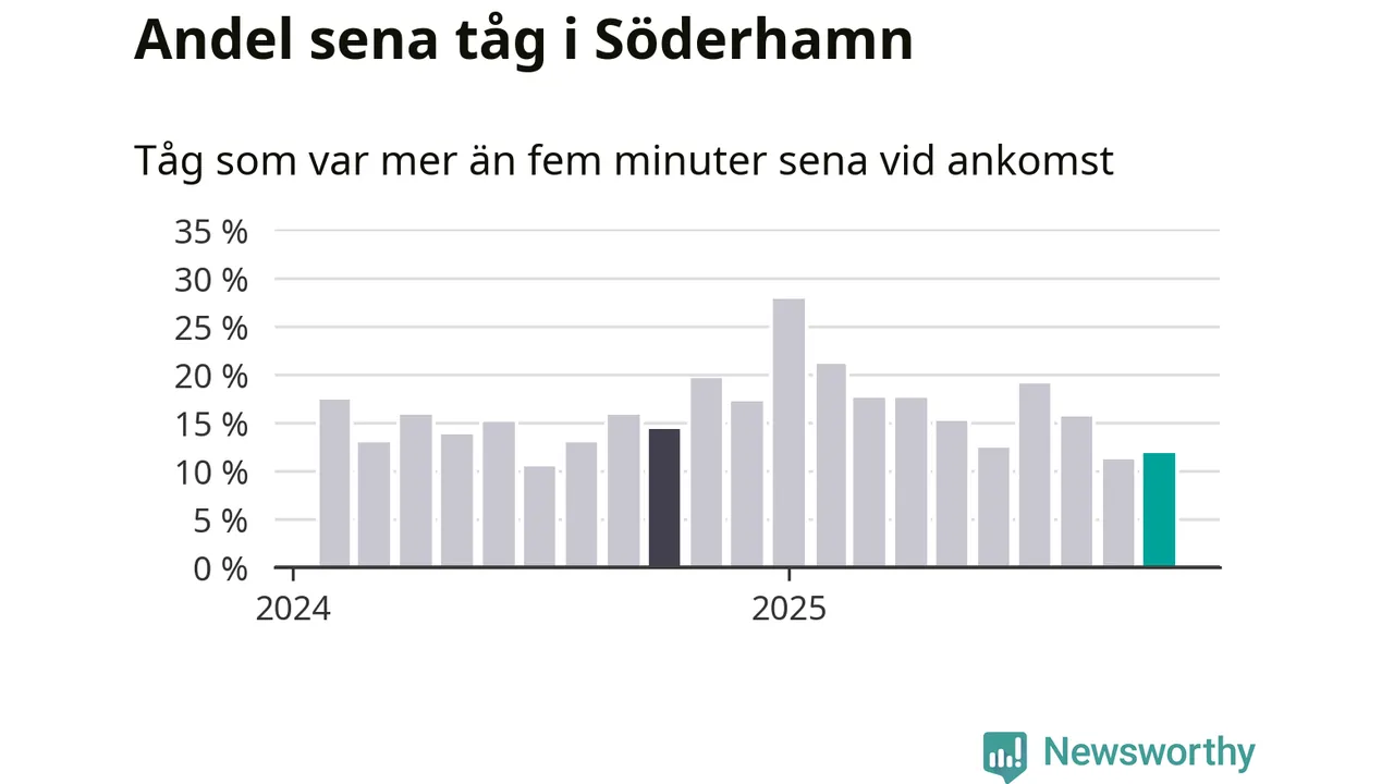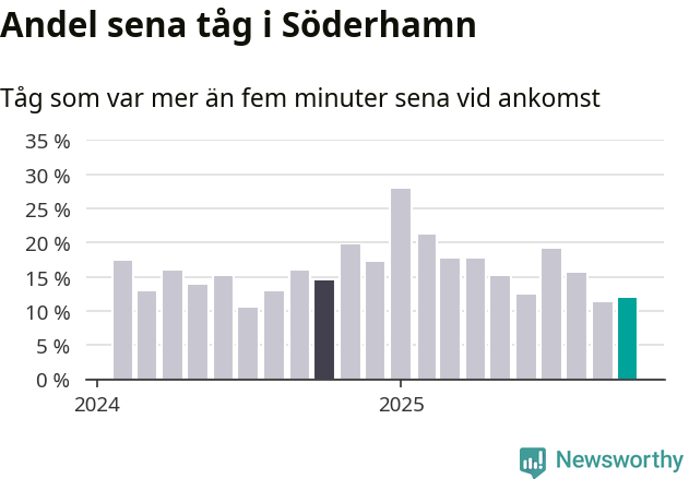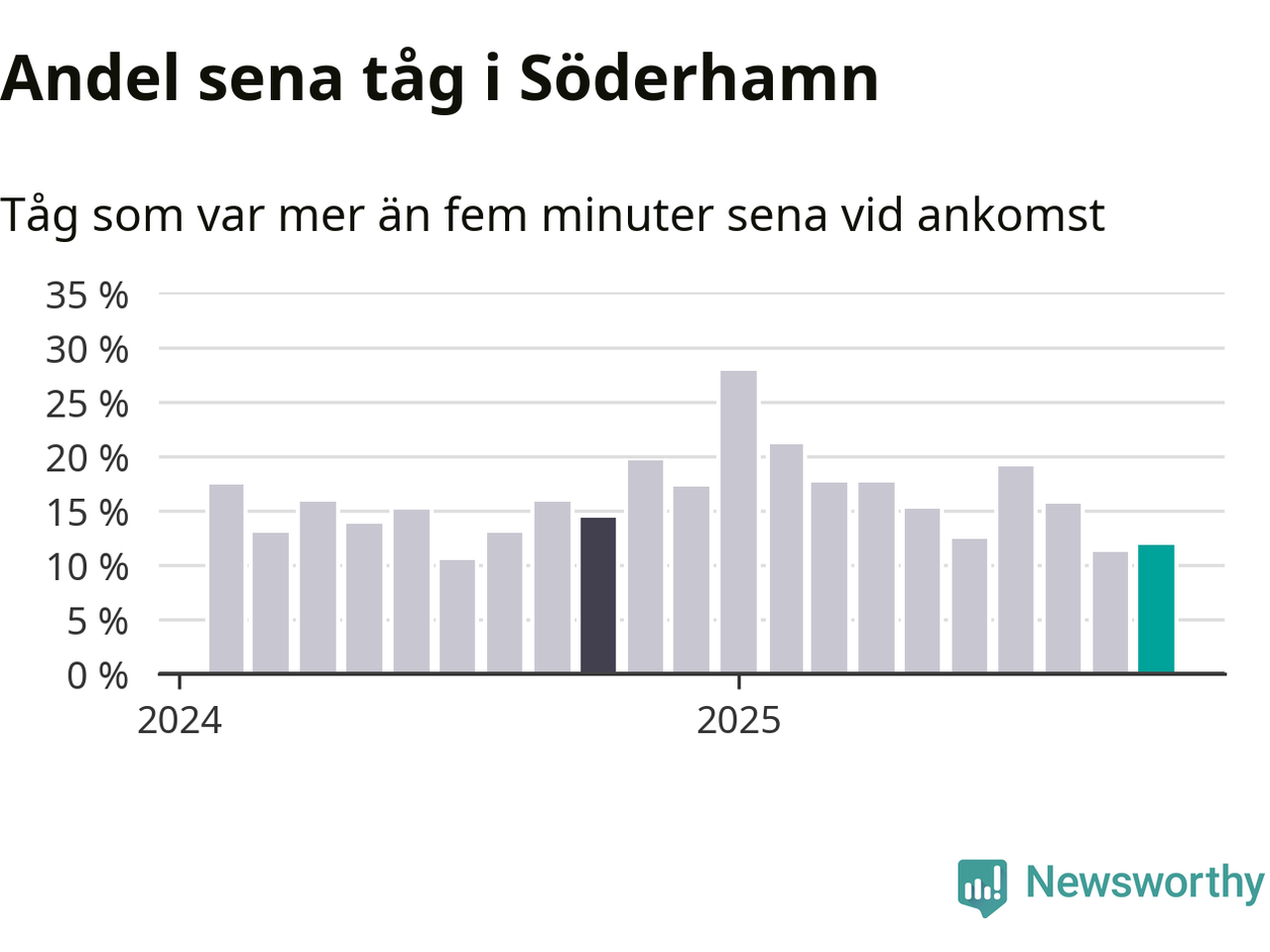 Tolv procent kan jämföras med elva procent månaden innan, och 14 procent i oktober 2024. Siffrorna bygger på realtidsinformation om tågavgångar och ankomster från Trafikverket, som Newsworthy löpande samlar in.