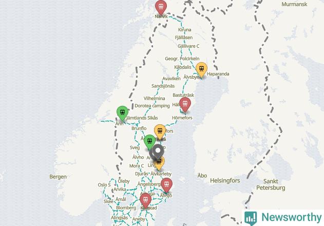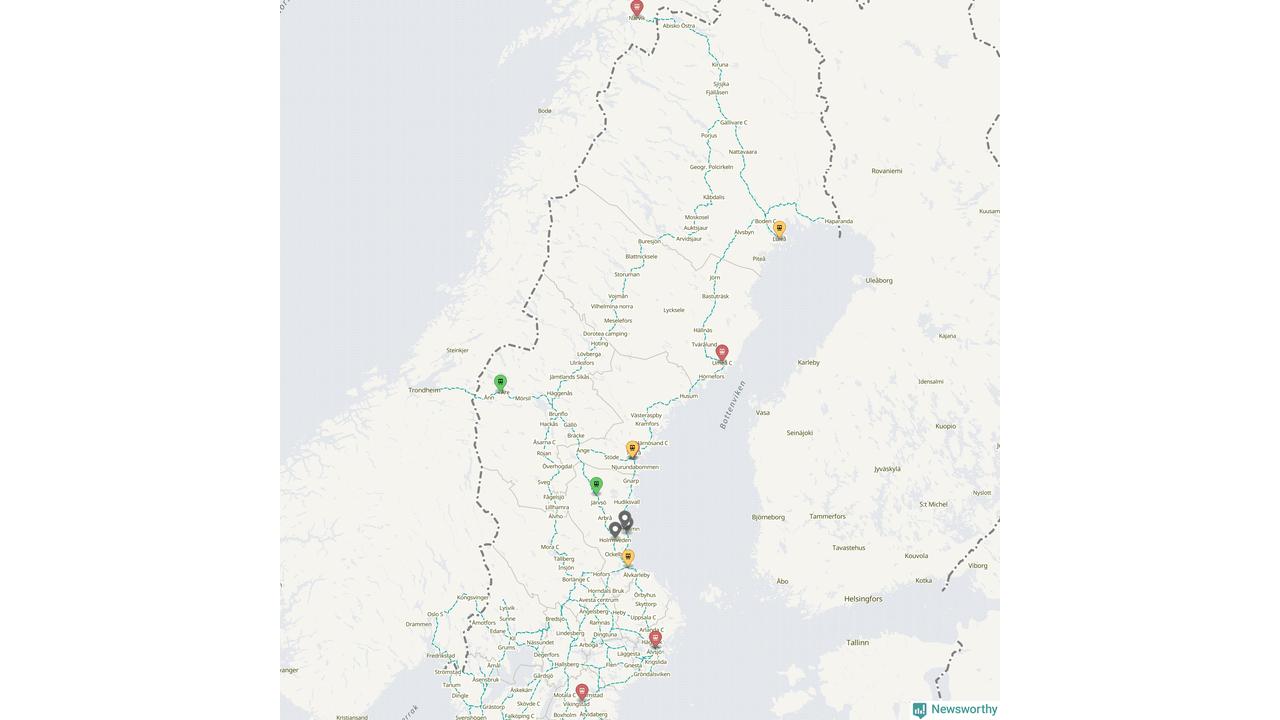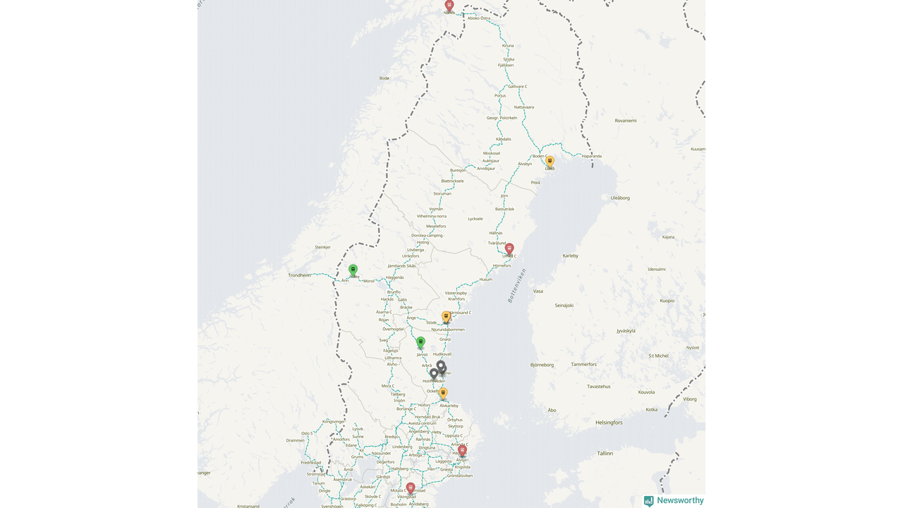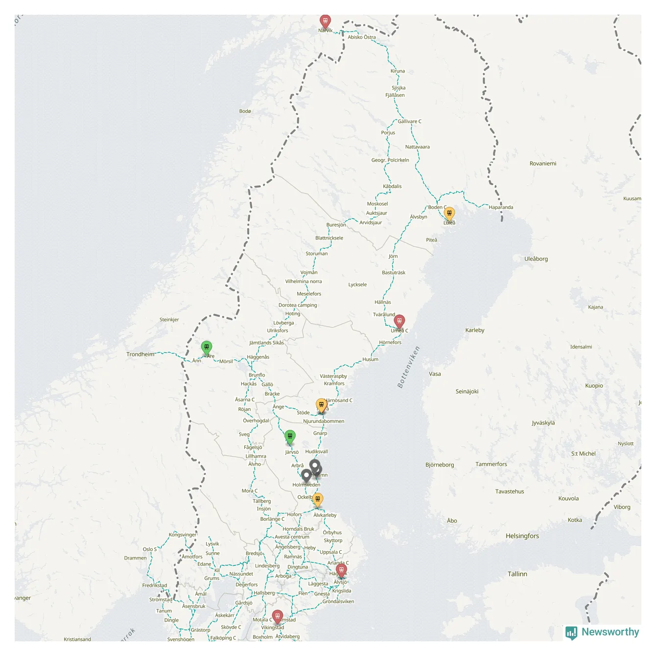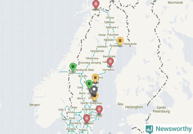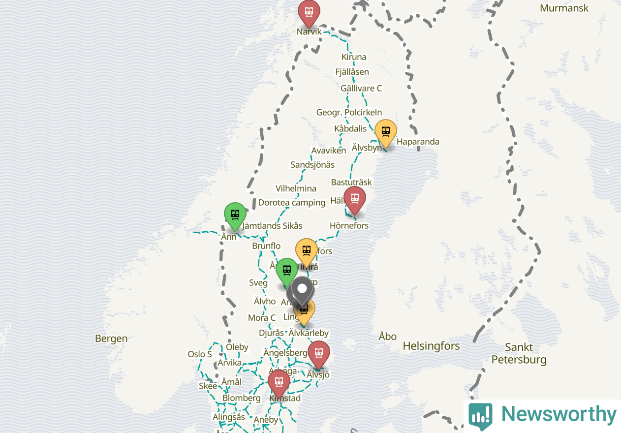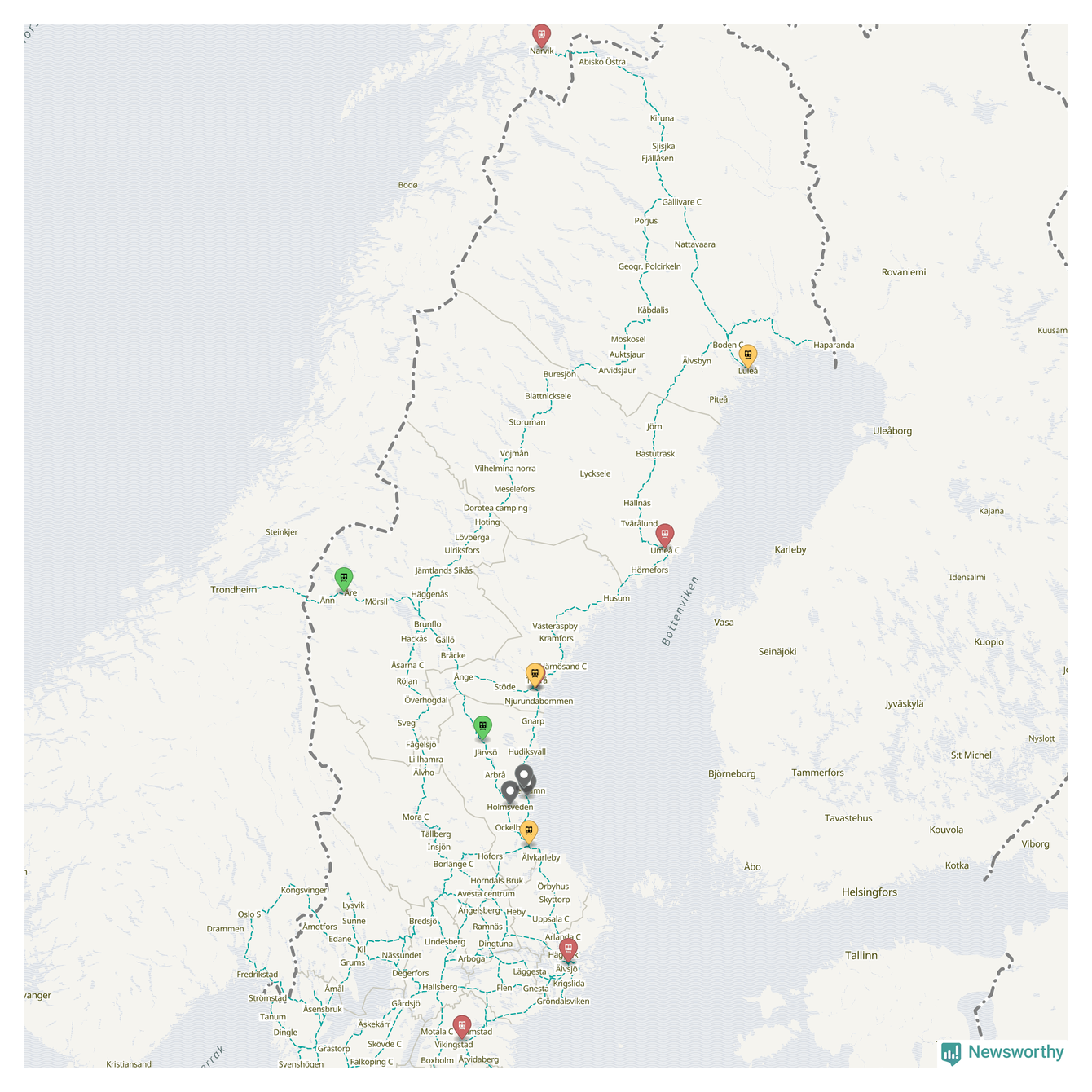 Kartdata från Mapbox, Newsworthy, OpenStreetMap och Trafikverket. Uppgifter om sträckor med passagerartrafik från jarnvag.net.