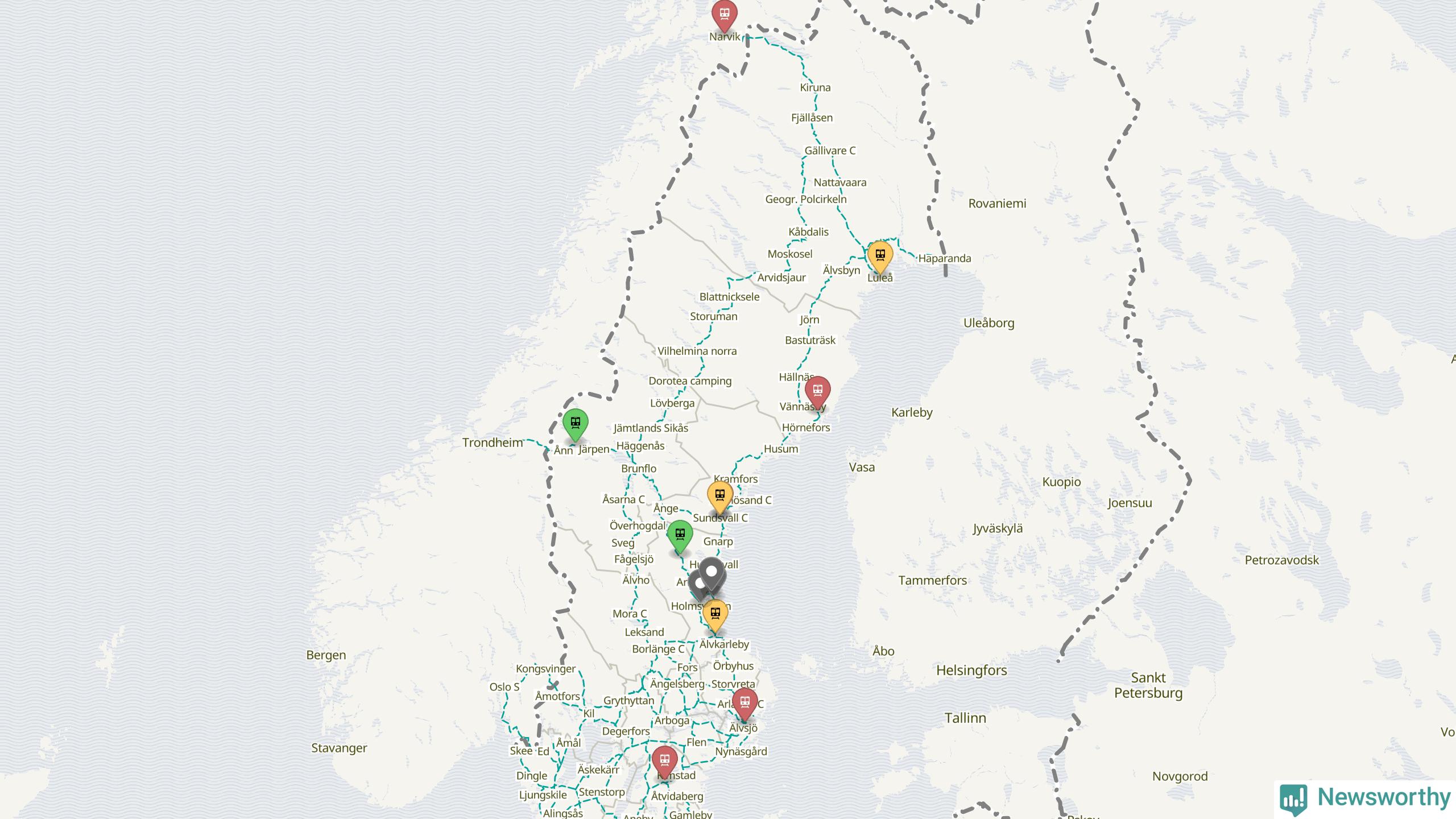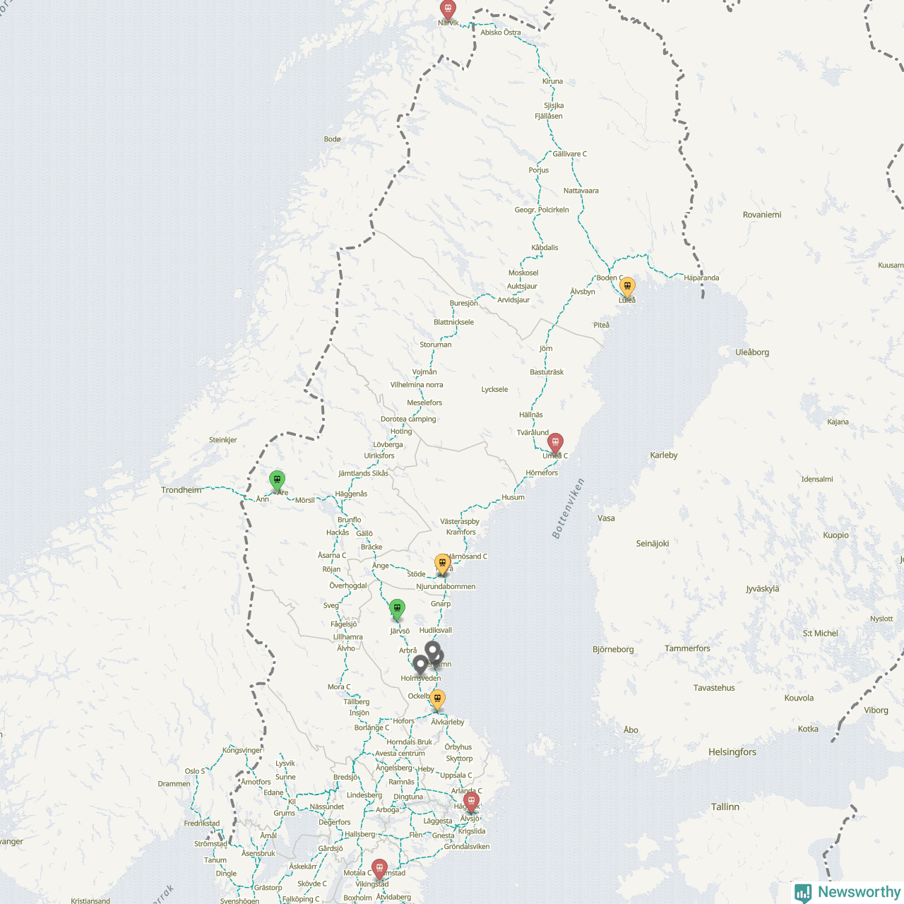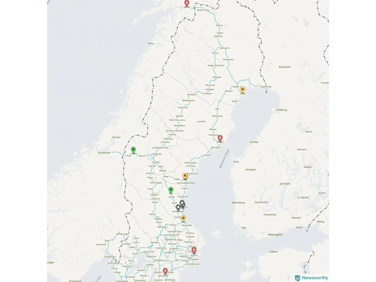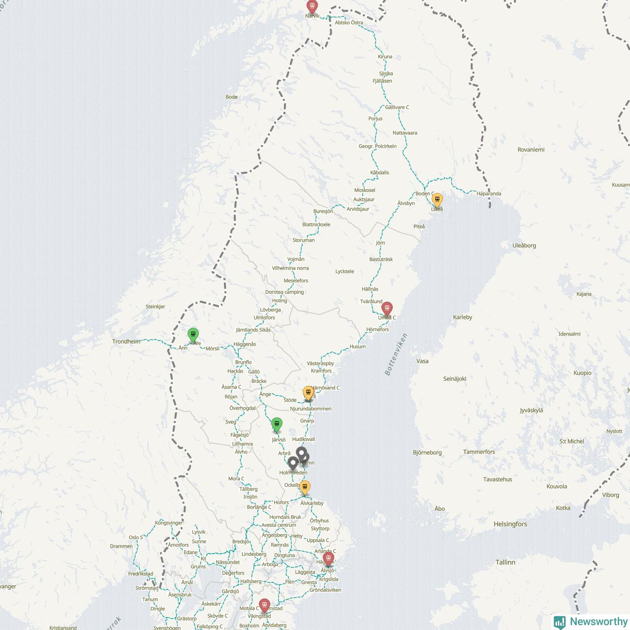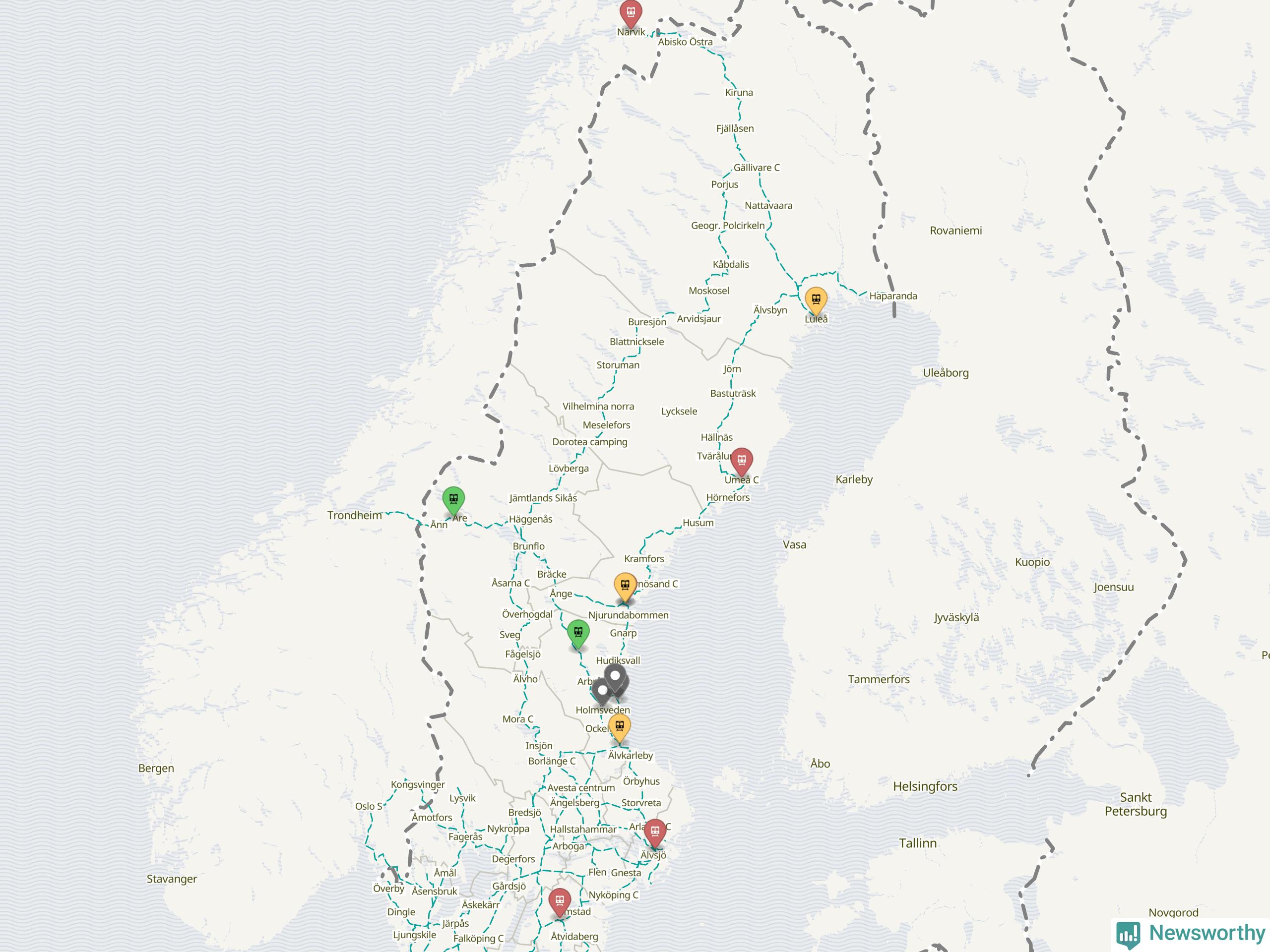 Kartdata från Mapbox, Newsworthy, OpenStreetMap och Trafikverket. Uppgifter om sträckor med passagerartrafik från jarnvag.net.