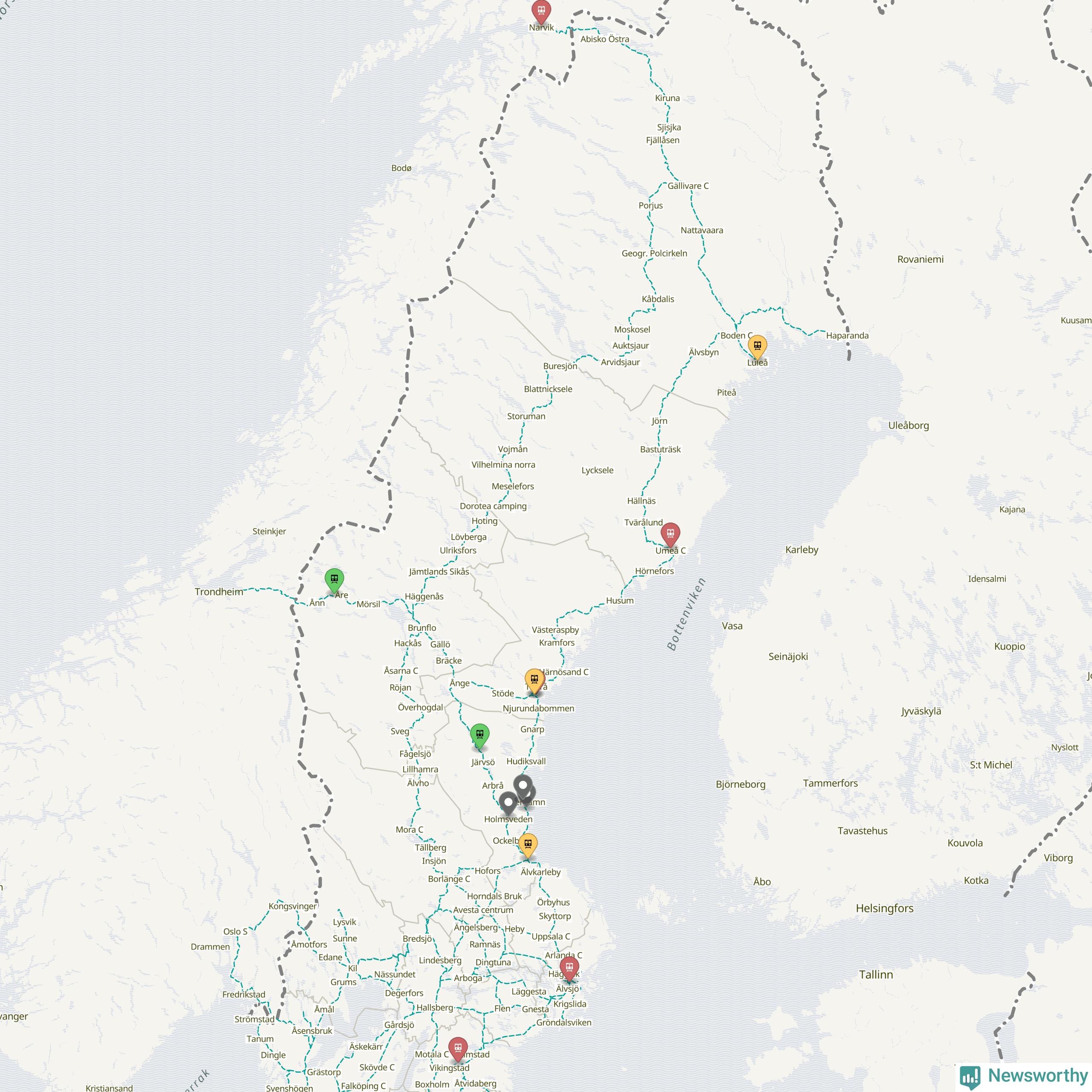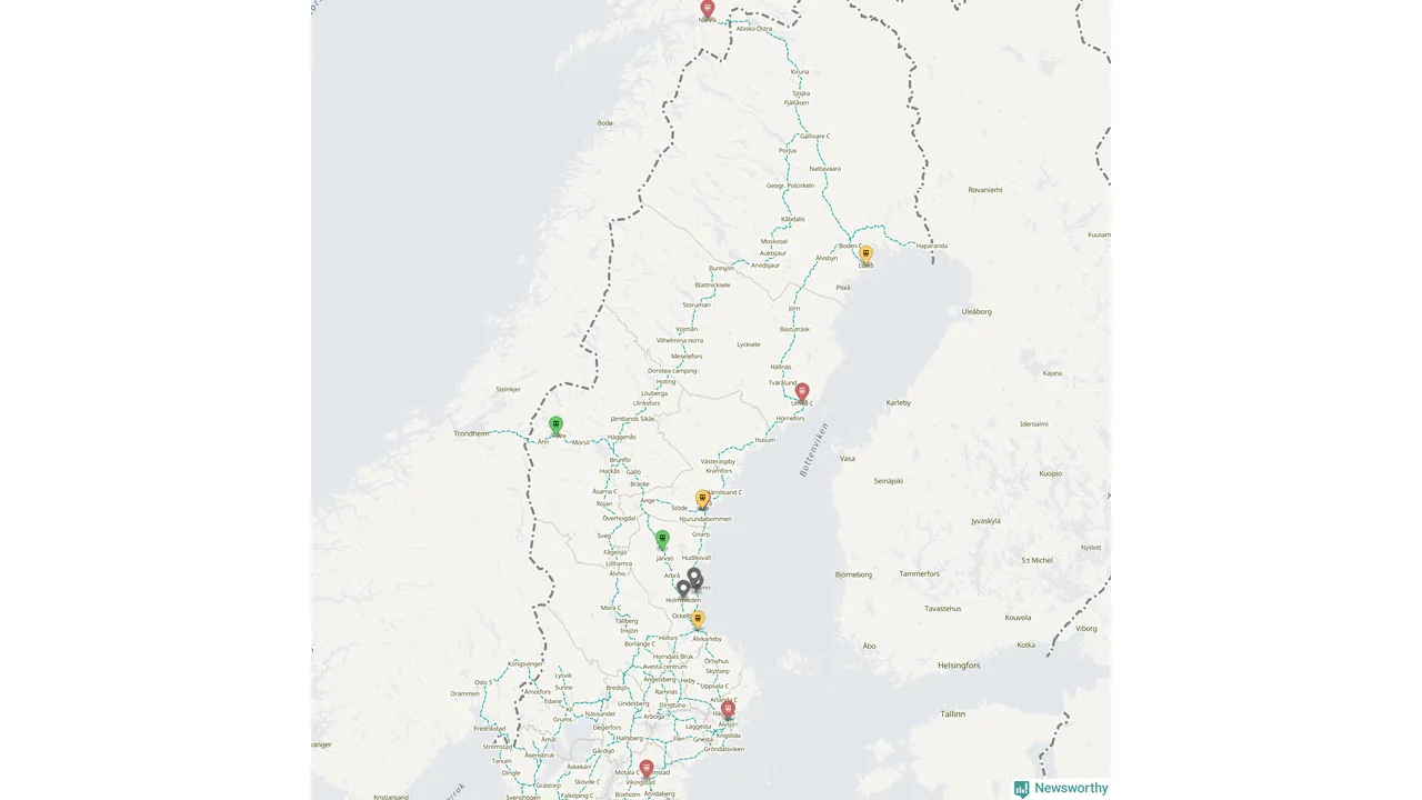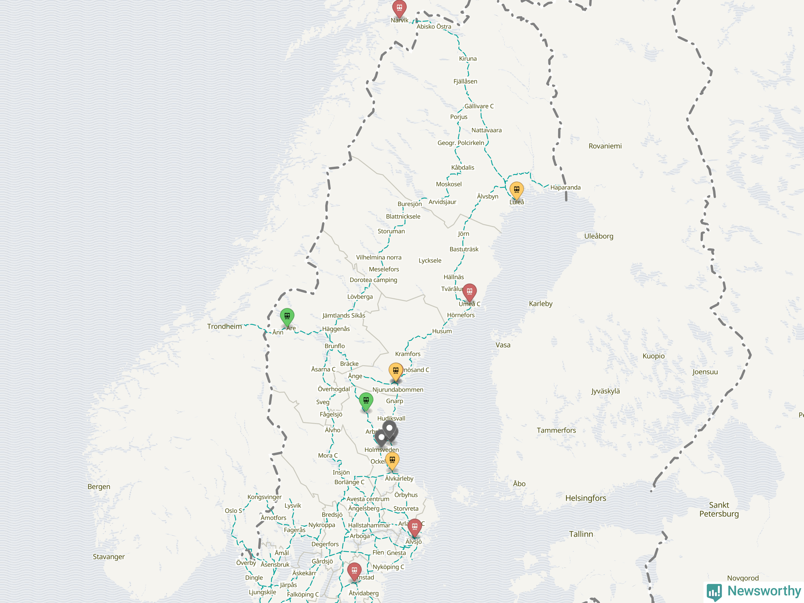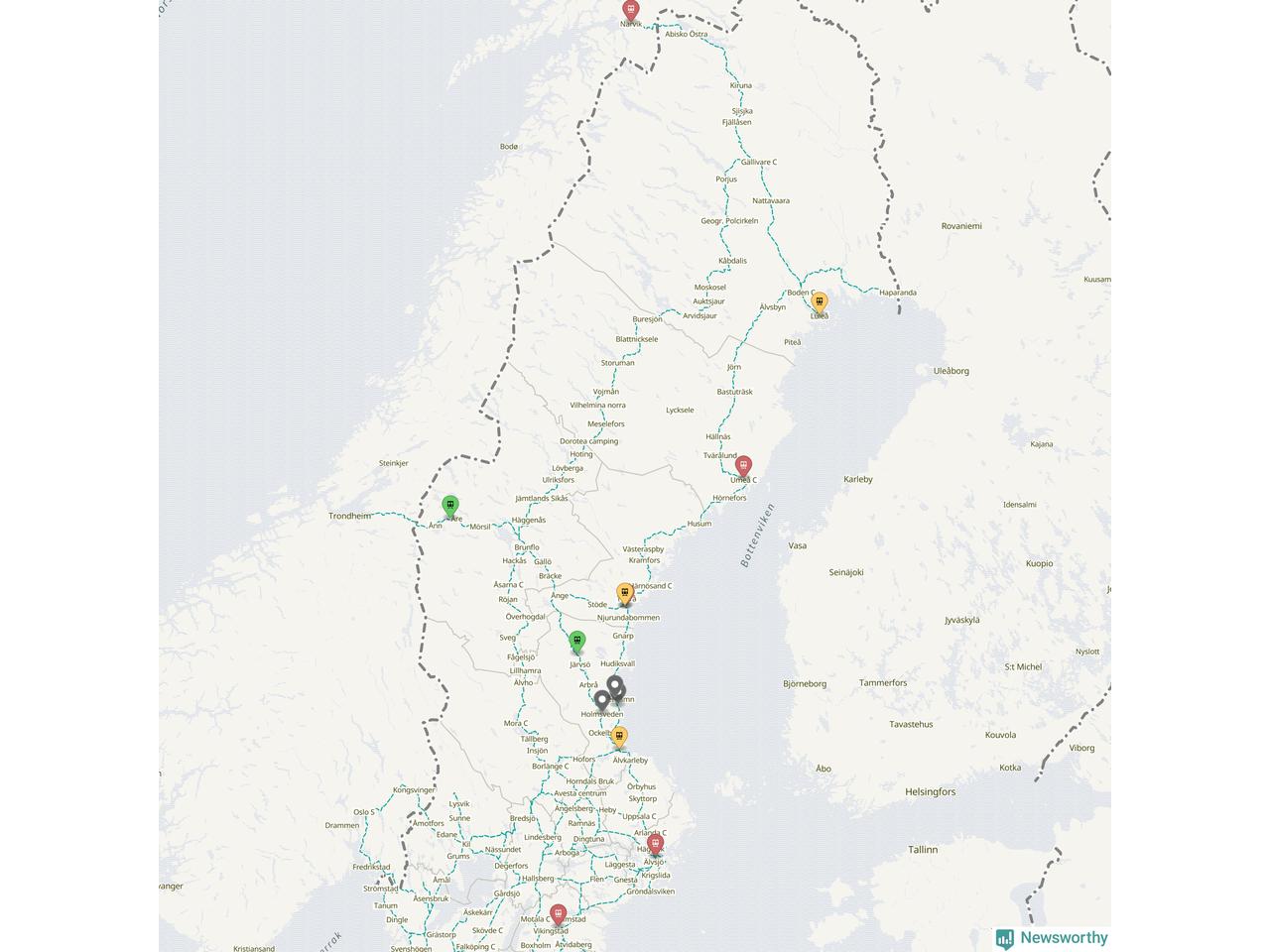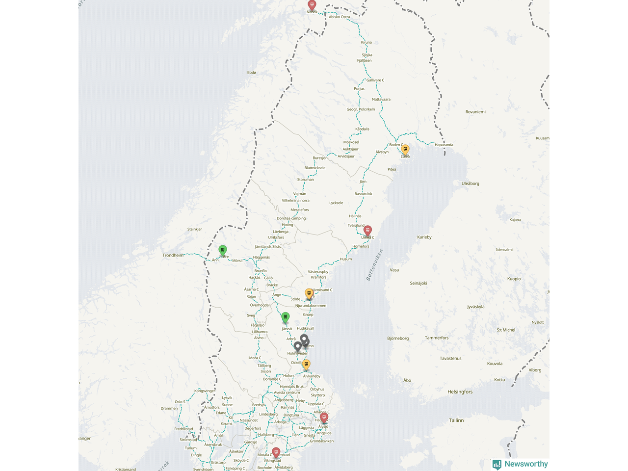 Kartdata från Mapbox, Newsworthy, OpenStreetMap och Trafikverket. Uppgifter om sträckor med passagerartrafik från jarnvag.net.
