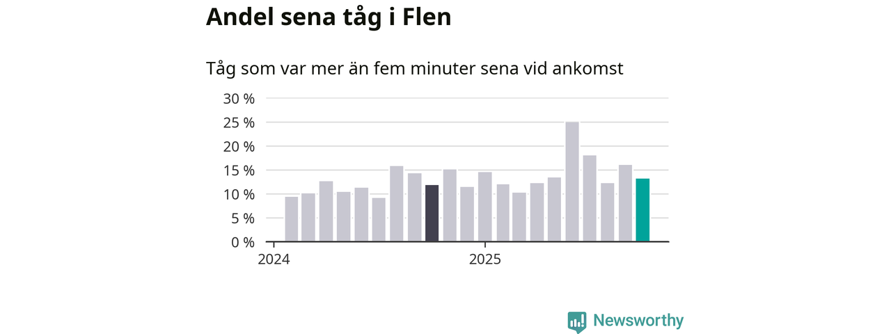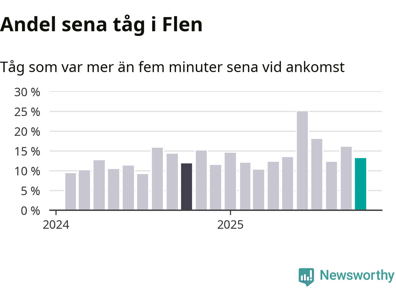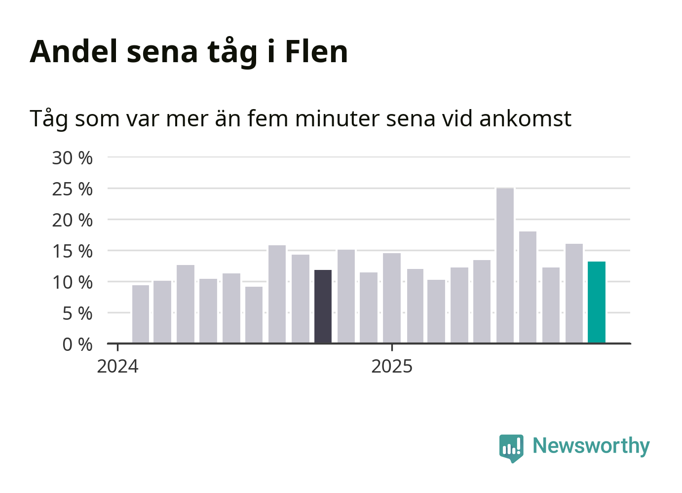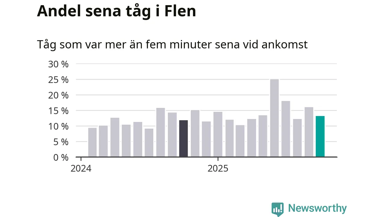 13 procent kan jämföras med 16 procent månaden innan, och tolv procent i oktober 2024. Siffrorna bygger på realtidsinformation om tågavgångar och ankomster från Trafikverket, som Newsworthy löpande samlar in.