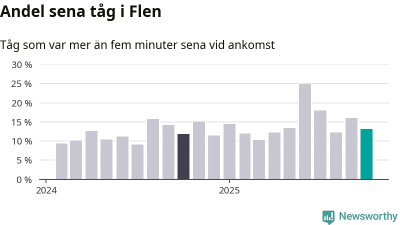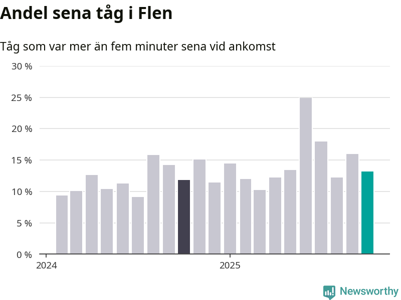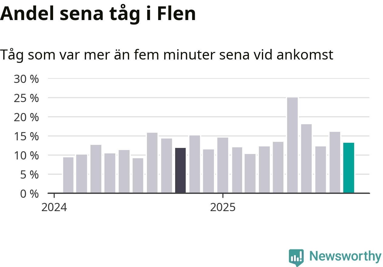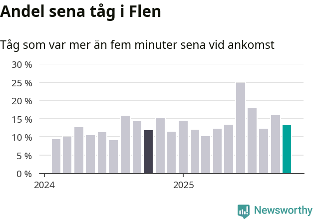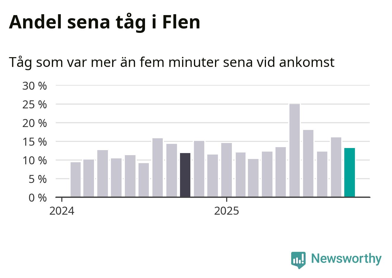 13 procent kan jämföras med 16 procent månaden innan, och tolv procent i oktober 2024. Siffrorna bygger på realtidsinformation om tågavgångar och ankomster från Trafikverket, som Newsworthy löpande samlar in.