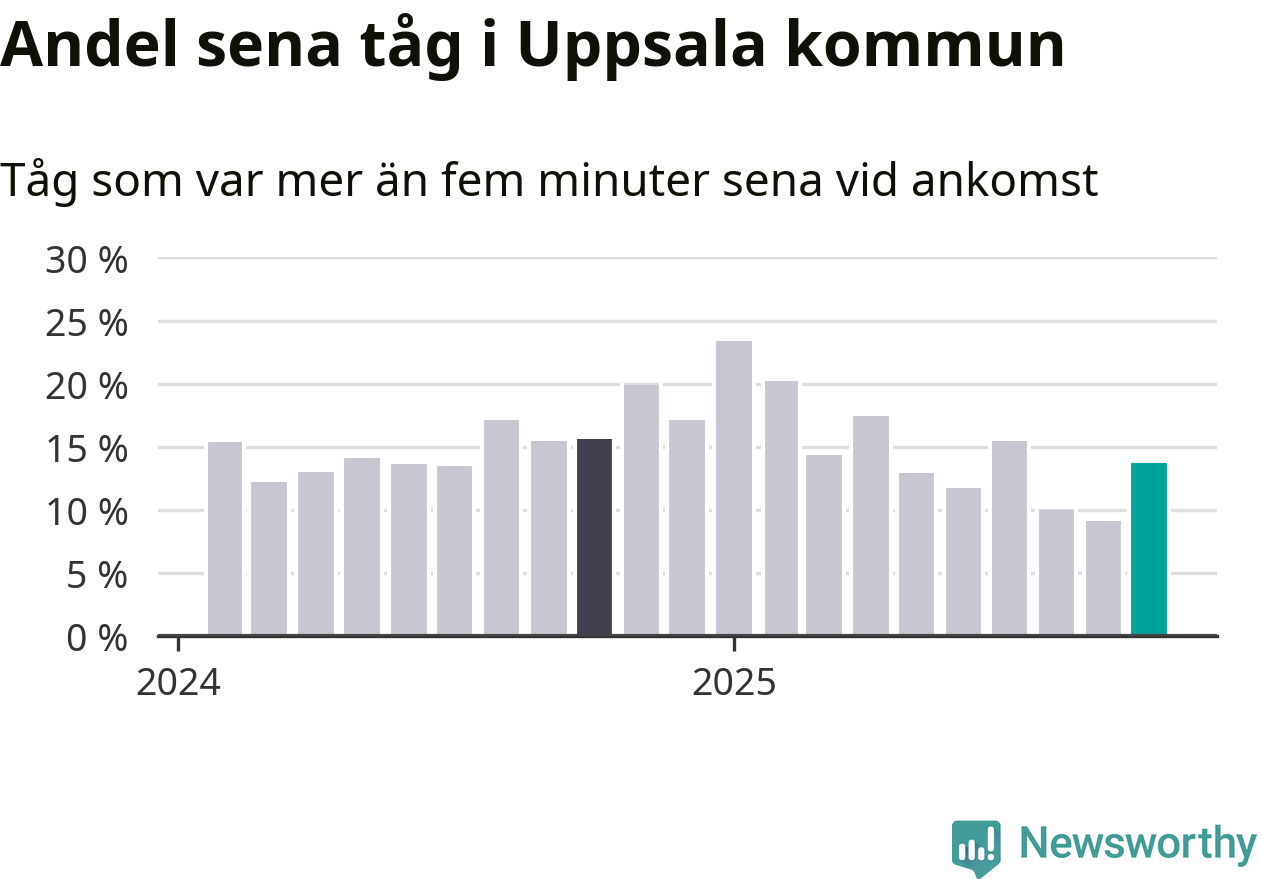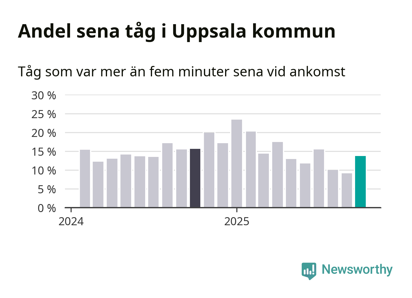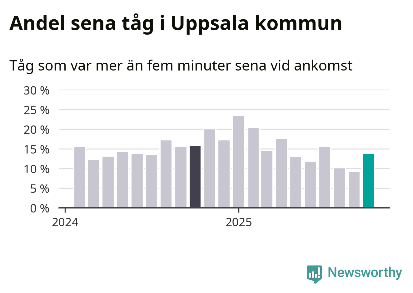 14 procent kan jämföras med nio procent månaden innan, och 16 procent i oktober 2024. Siffrorna bygger på realtidsinformation om tågavgångar och ankomster från Trafikverket, som Newsworthy löpande samlar in.