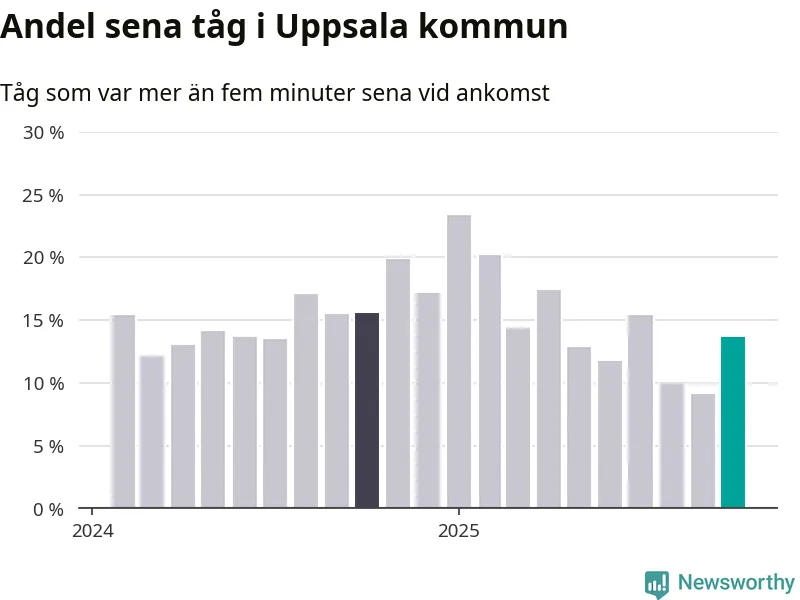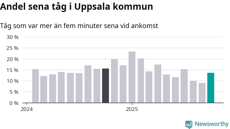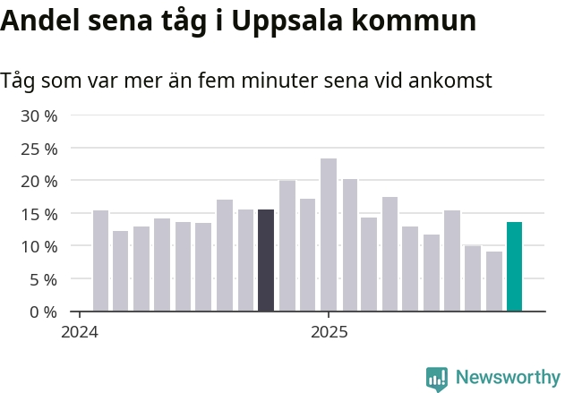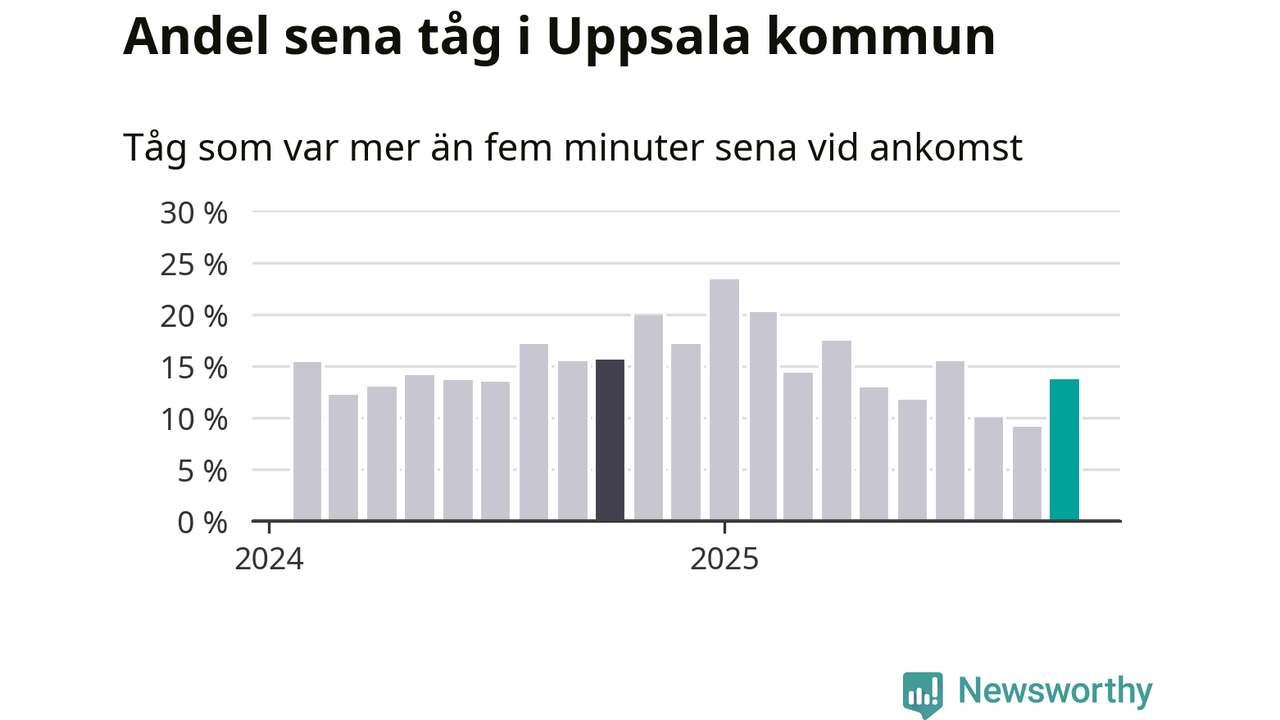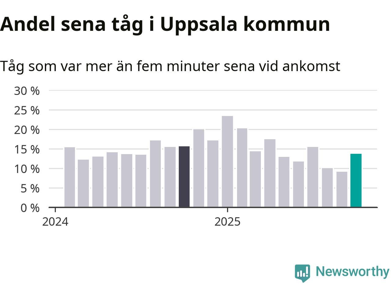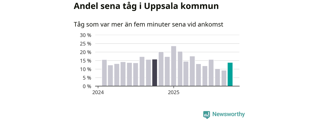14 procent kan jämföras med nio procent månaden innan, och 16 procent i oktober 2024. Siffrorna bygger på realtidsinformation om tågavgångar och ankomster från Trafikverket, som Newsworthy löpande samlar in.