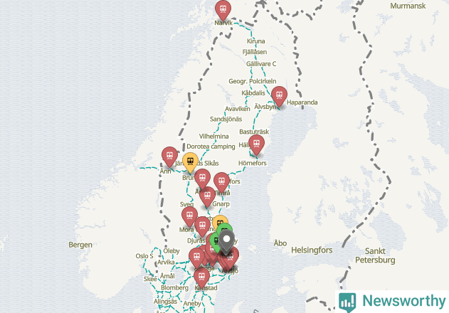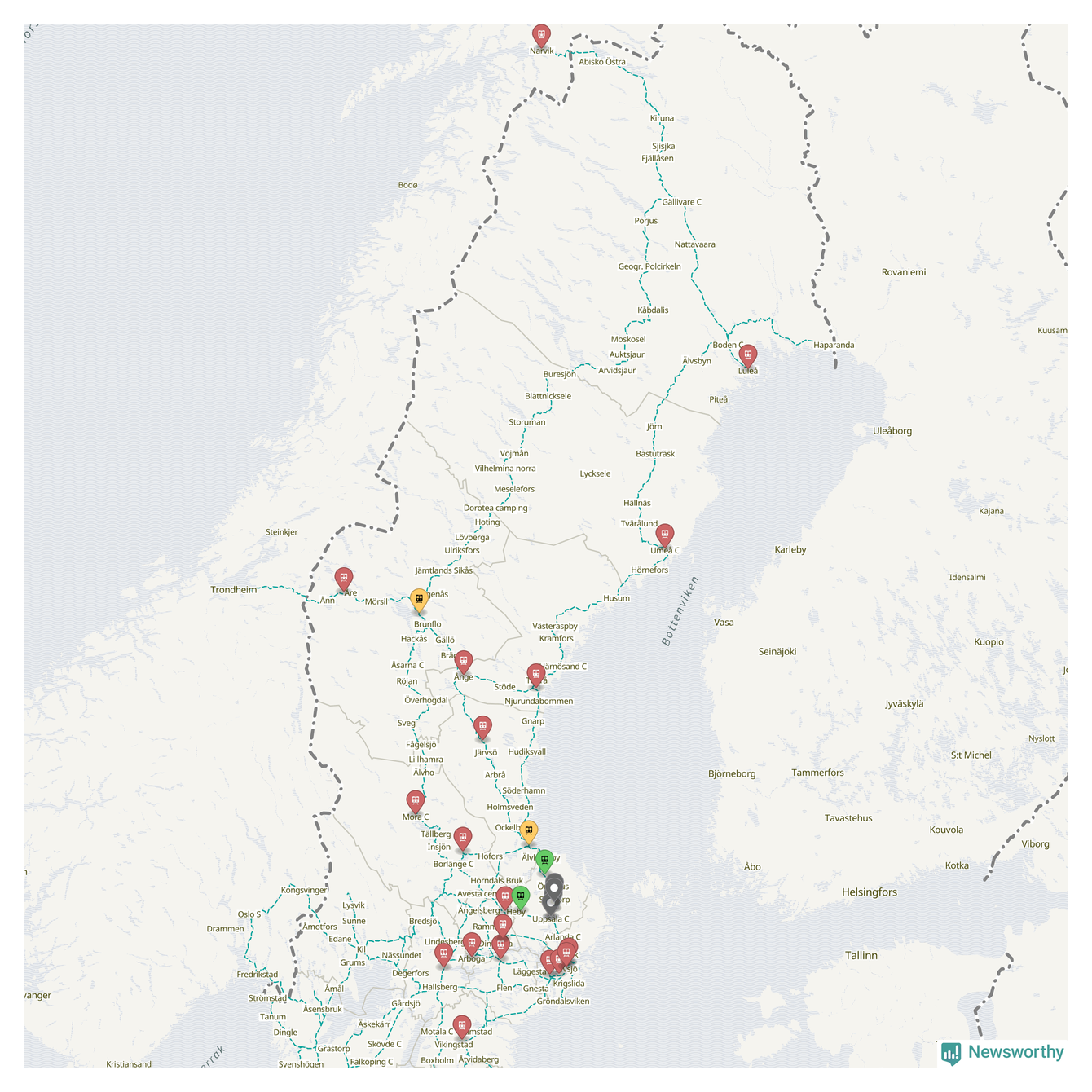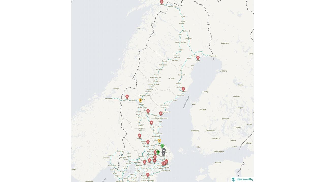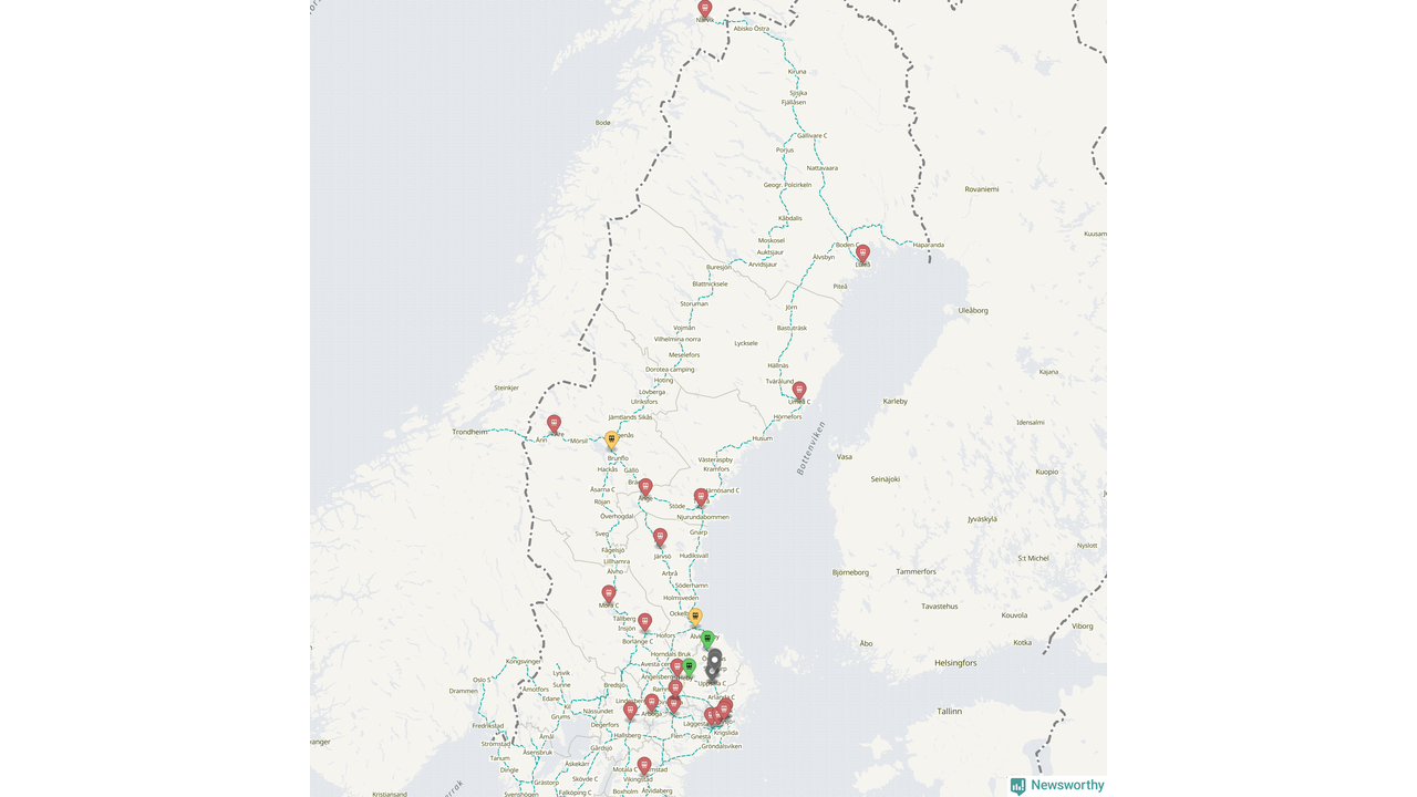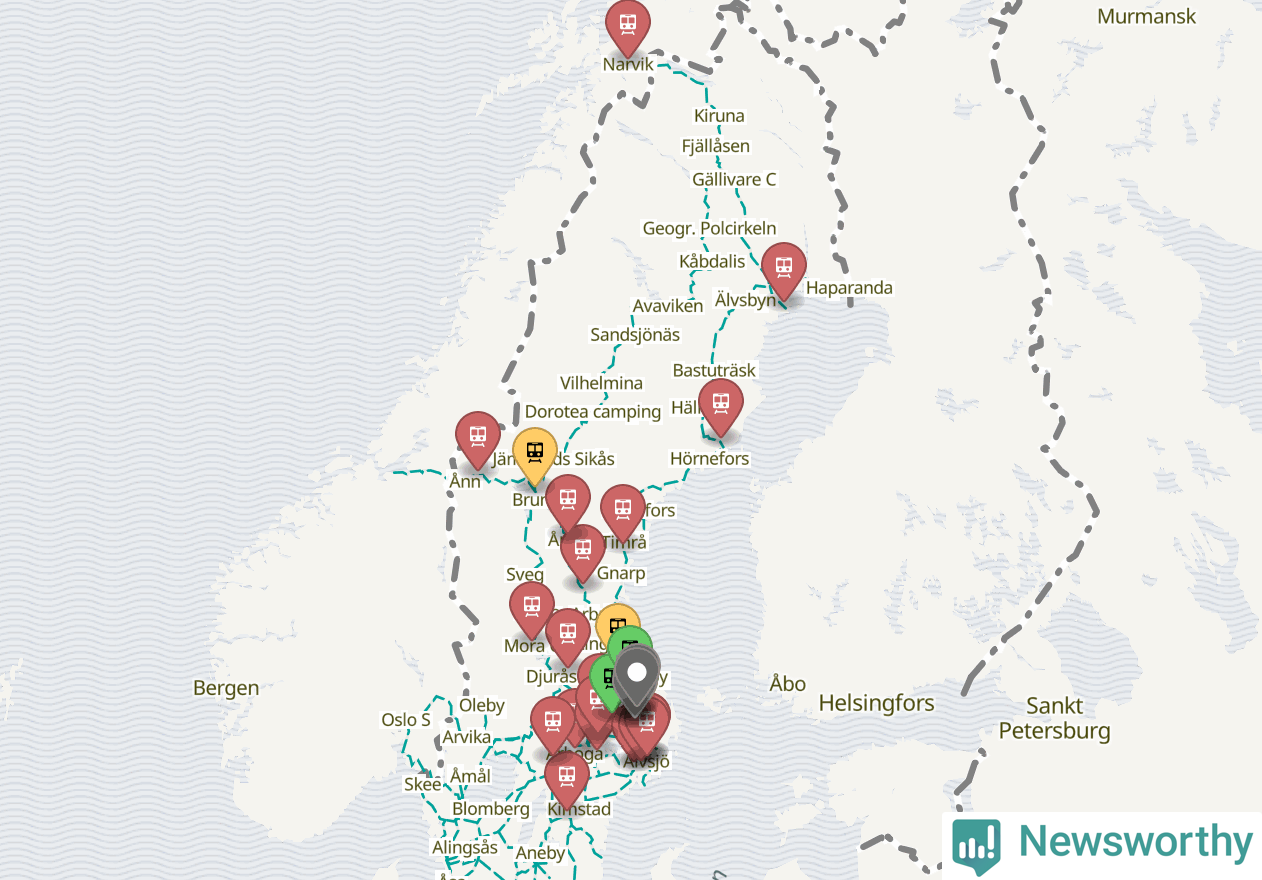 Kartdata från Mapbox, Newsworthy, OpenStreetMap och Trafikverket. Uppgifter om sträckor med passagerartrafik från jarnvag.net.