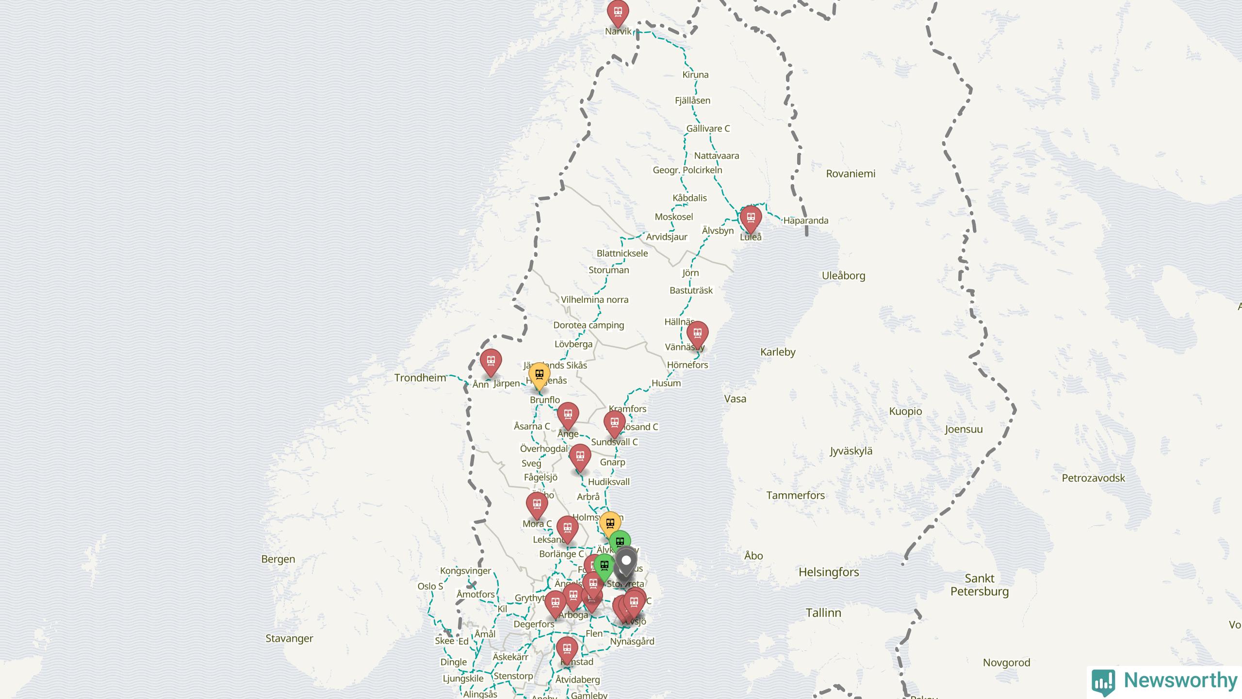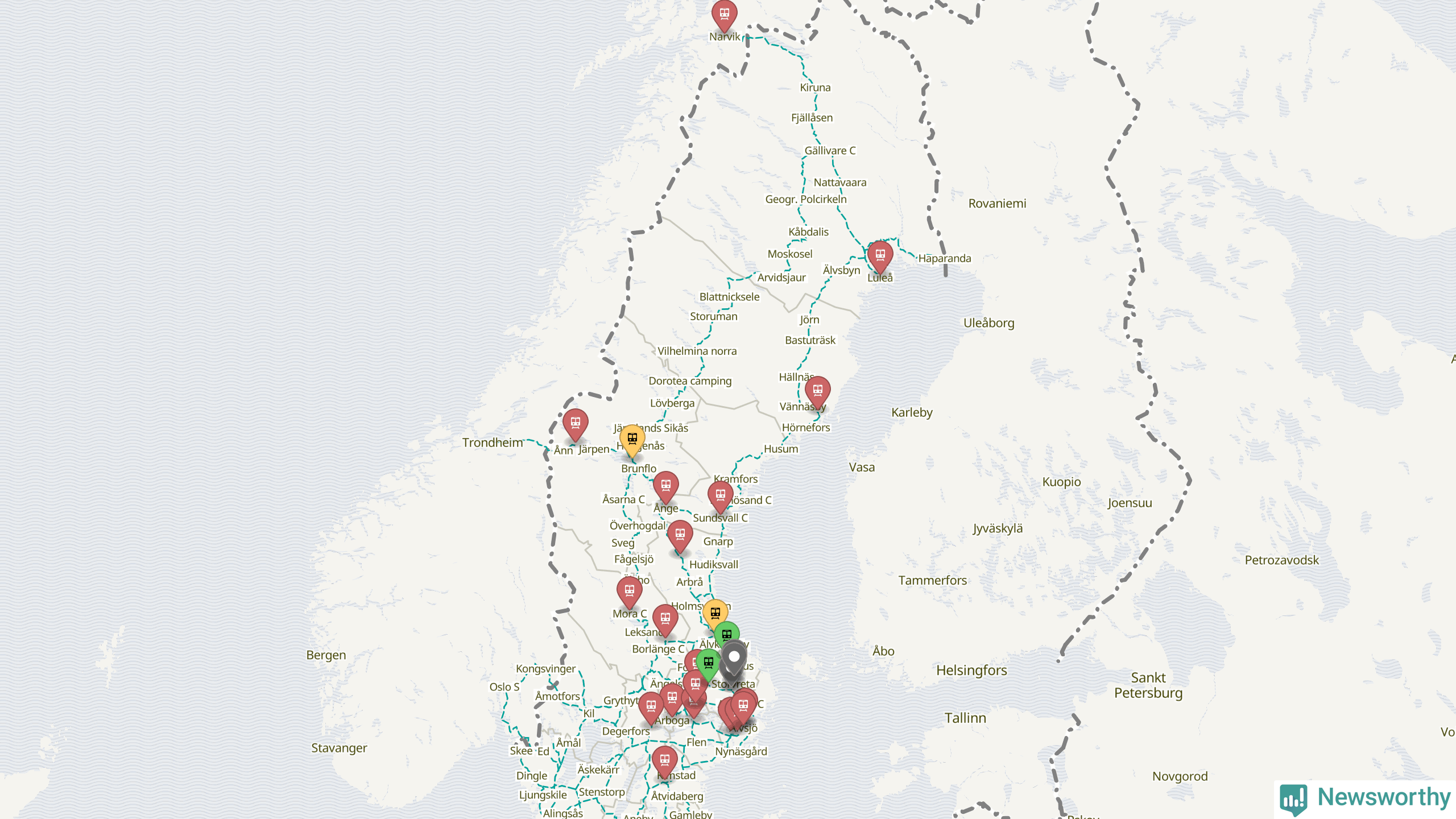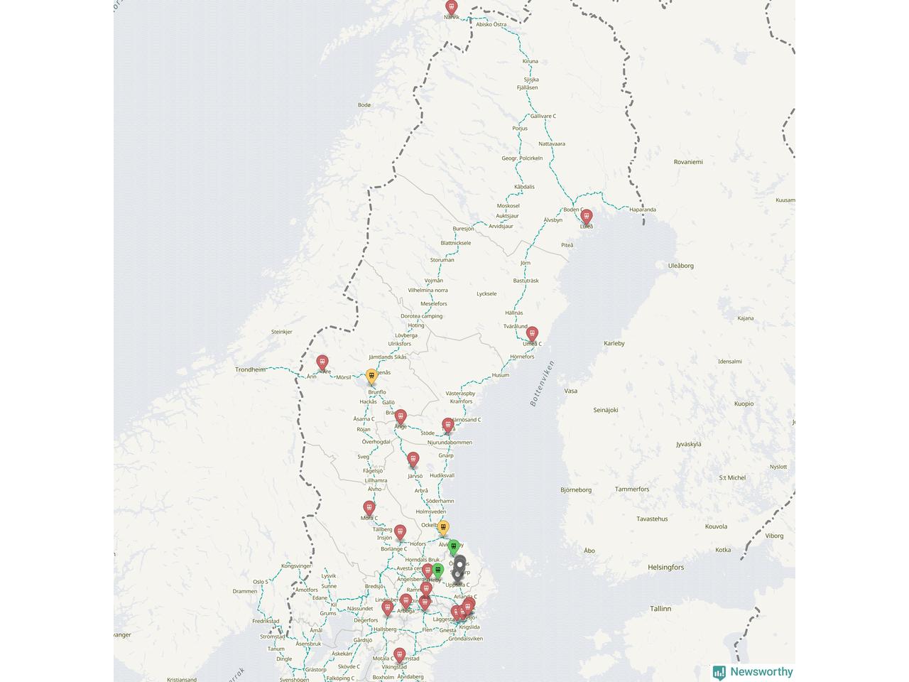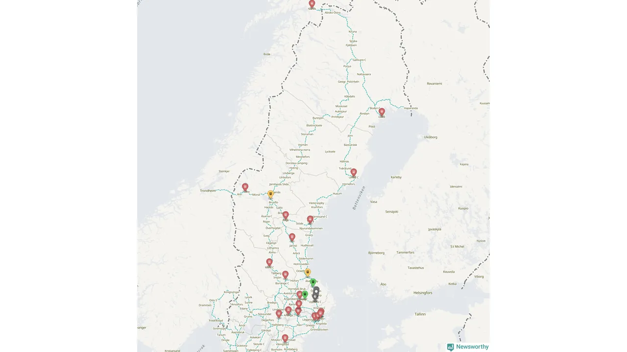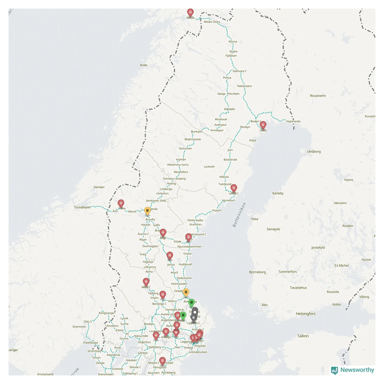 Kartdata från Mapbox, Newsworthy, OpenStreetMap och Trafikverket. Uppgifter om sträckor med passagerartrafik från jarnvag.net.