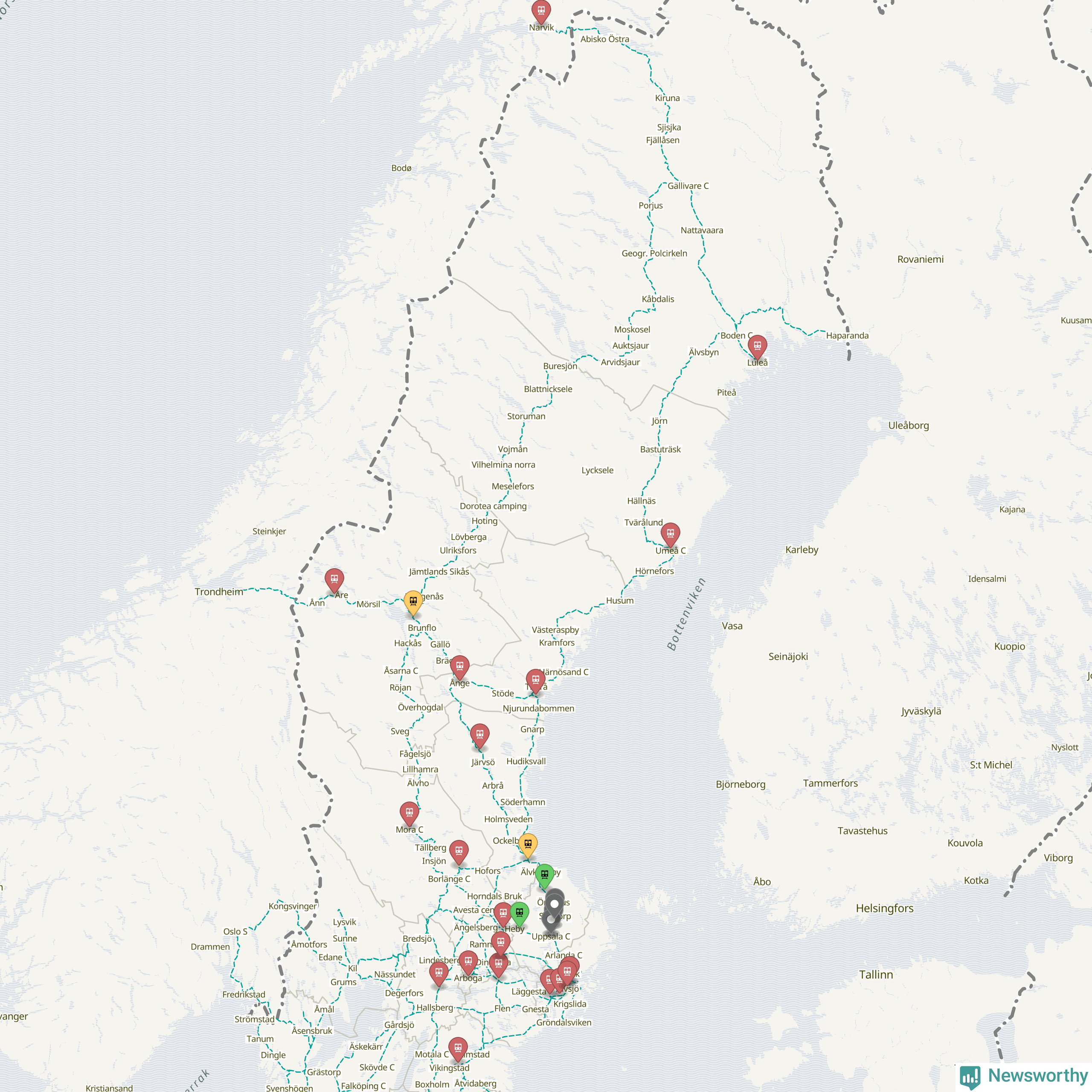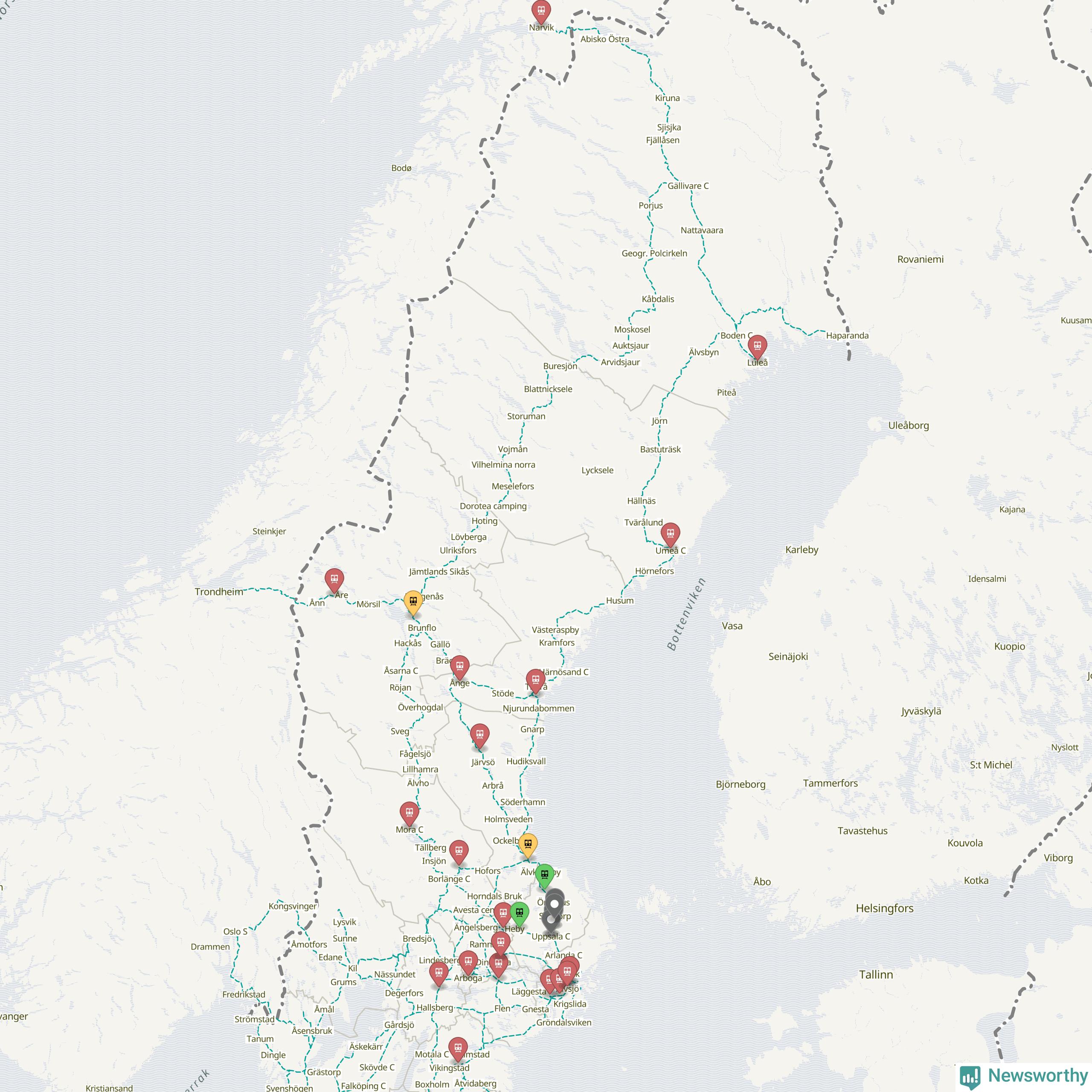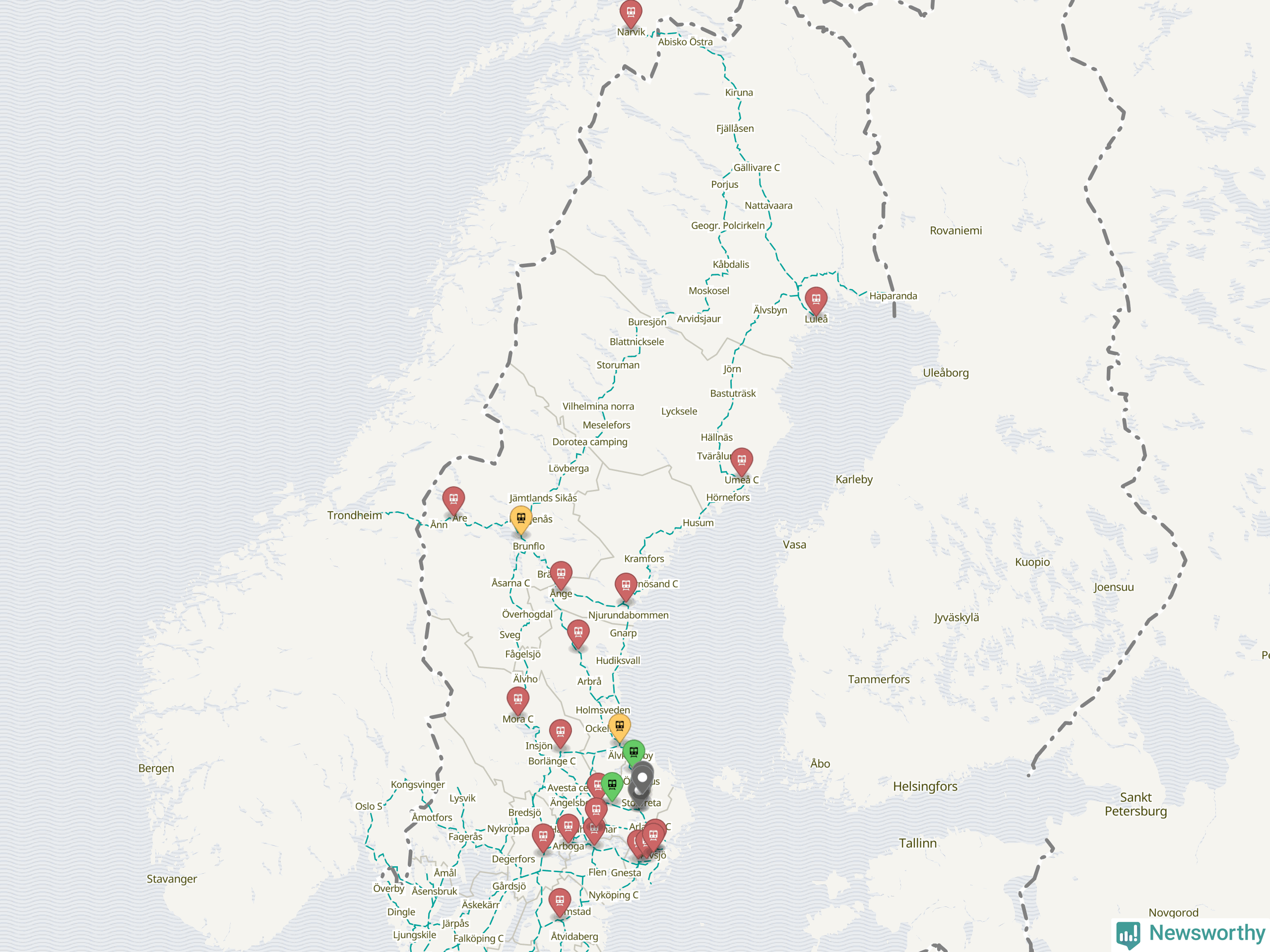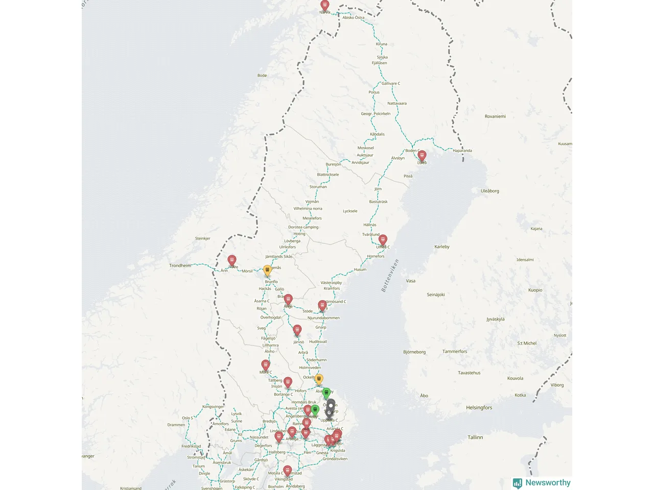 Kartdata från Mapbox, Newsworthy, OpenStreetMap och Trafikverket. Uppgifter om sträckor med passagerartrafik från jarnvag.net.