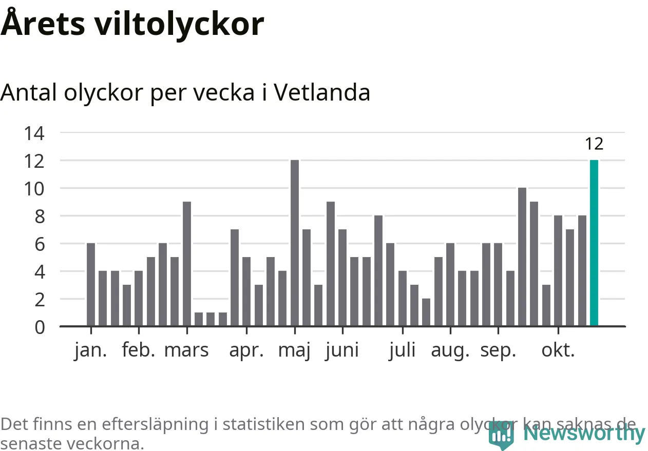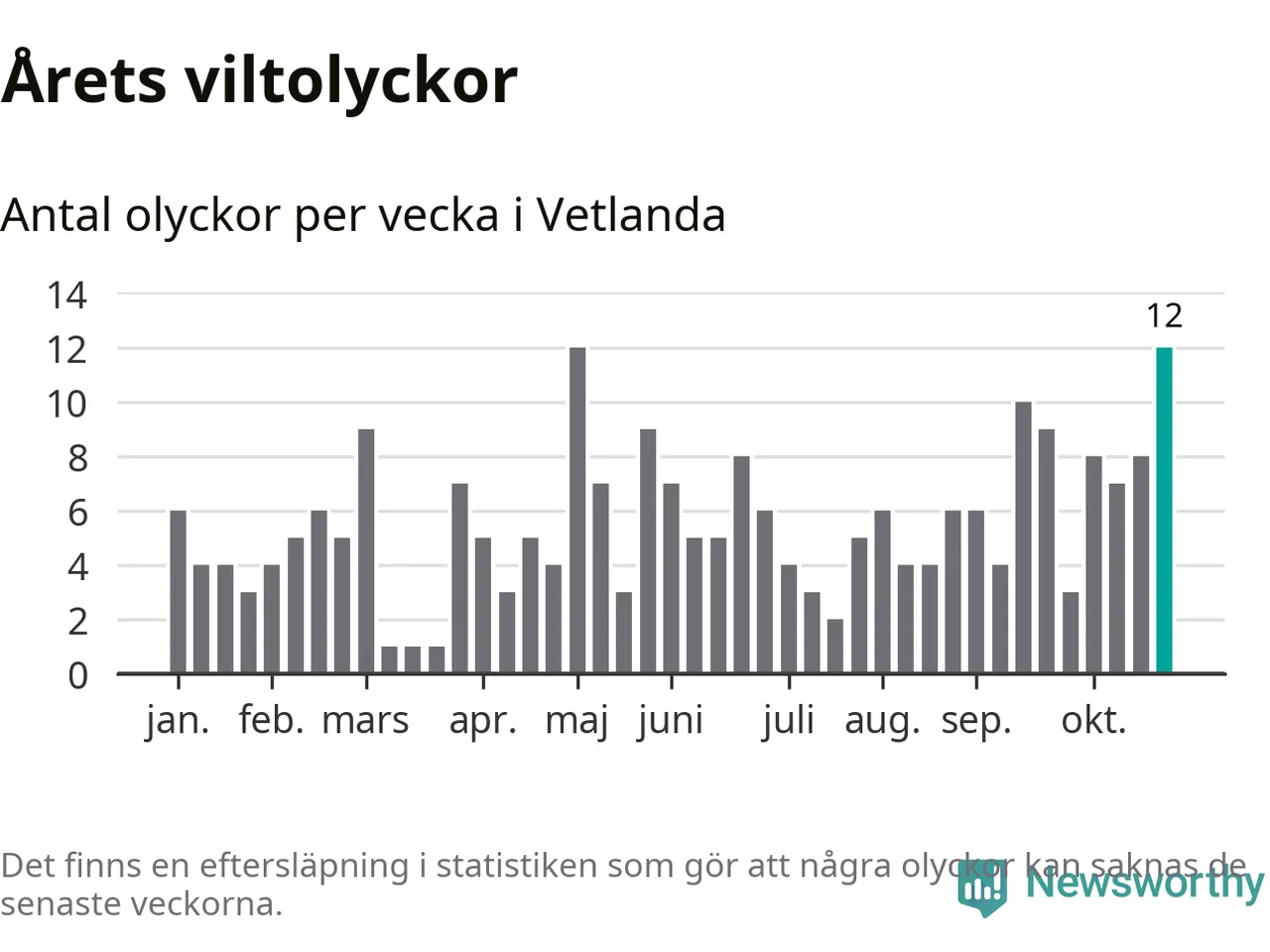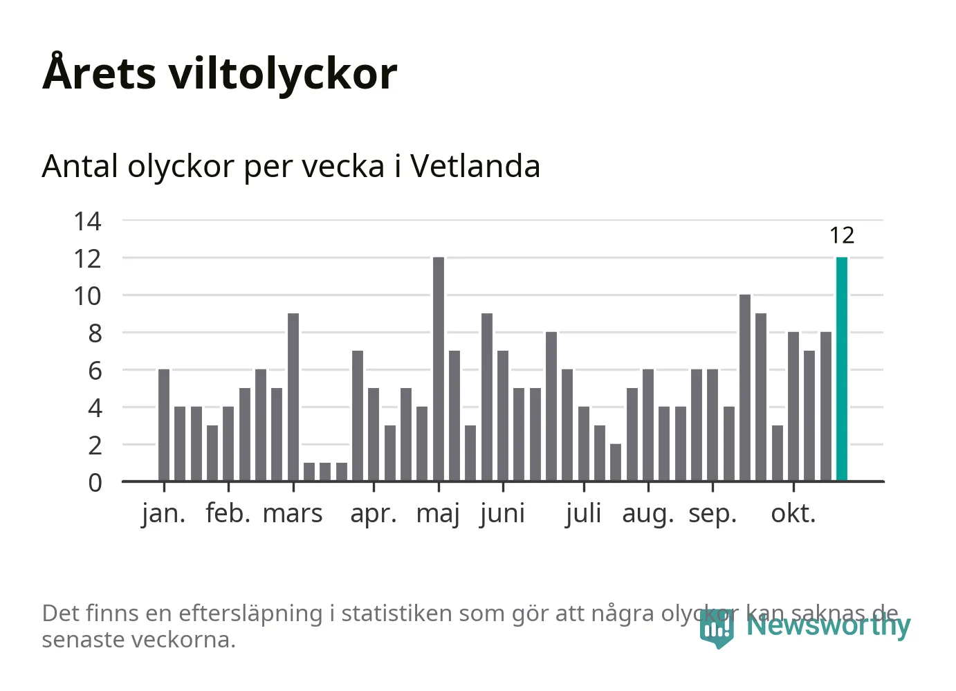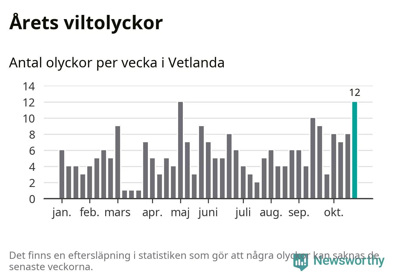 Hittills har tolv viltolyckor rapporterats in i Vetlanda kommun från vecka 44. Se listan här.