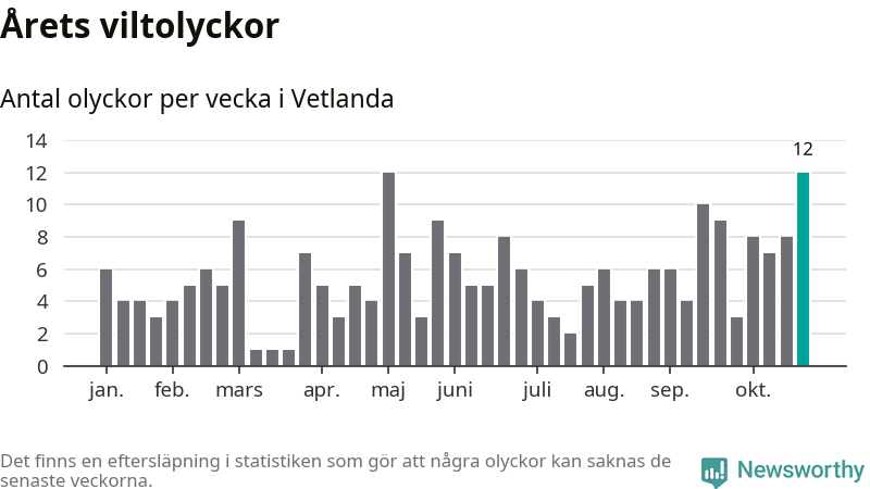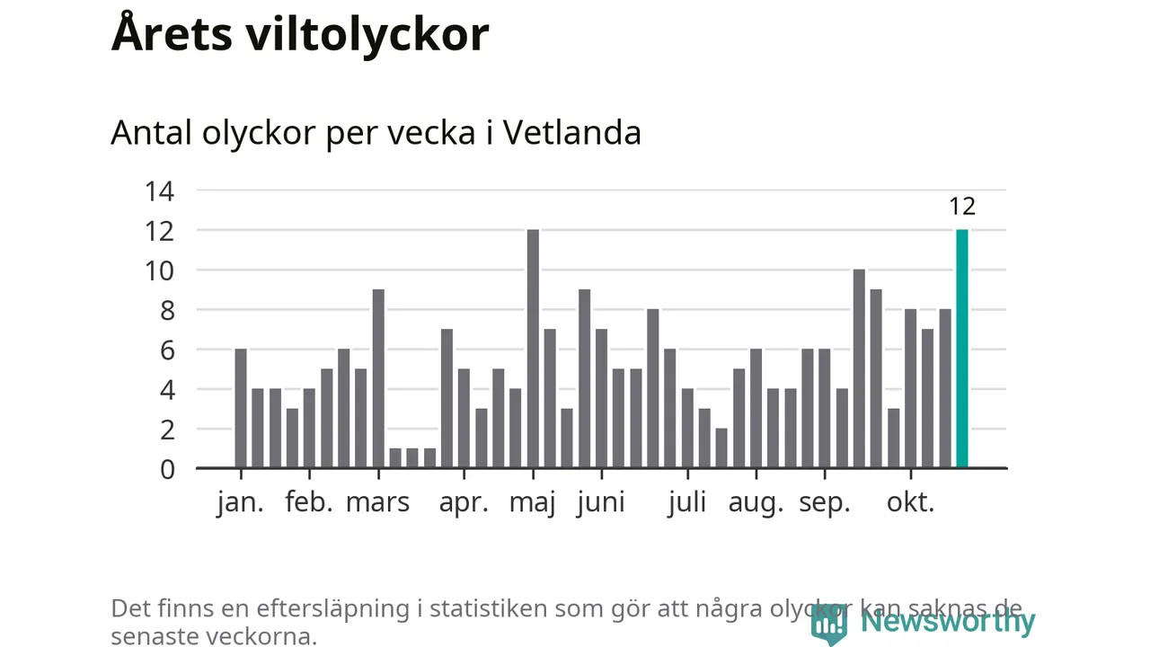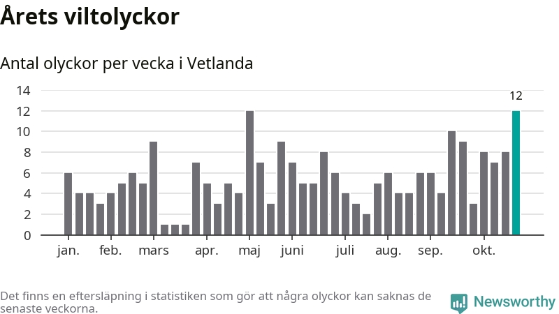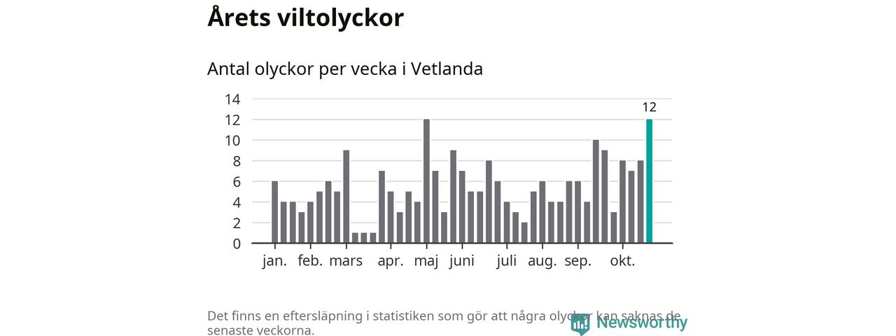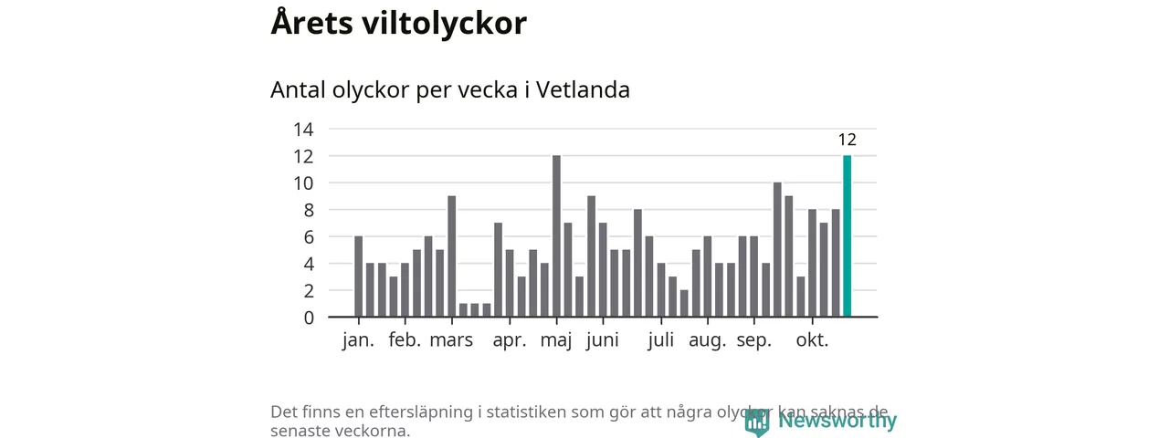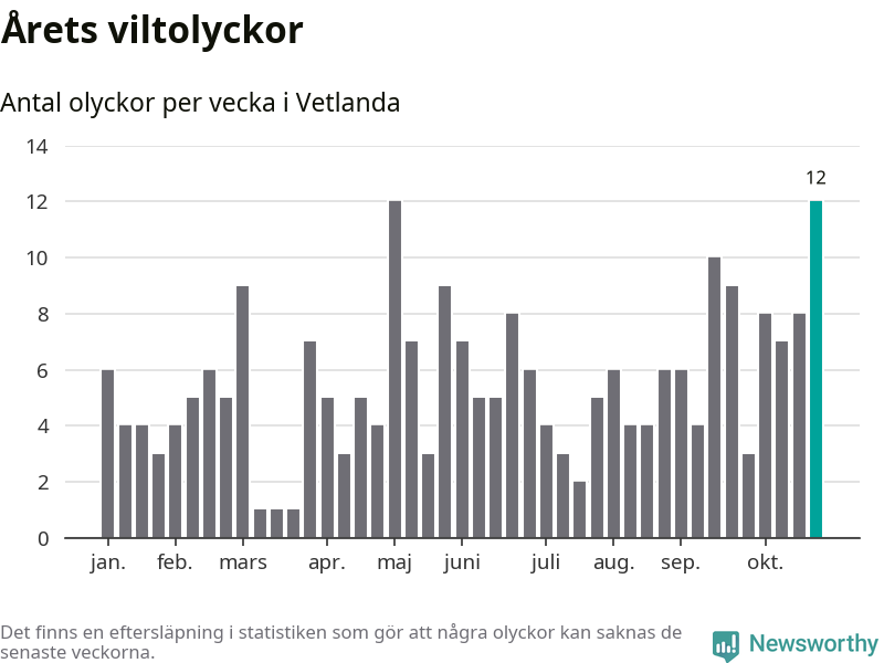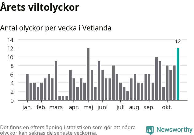 Hittills har tolv viltolyckor rapporterats in i Vetlanda kommun från vecka 44. Se listan här.