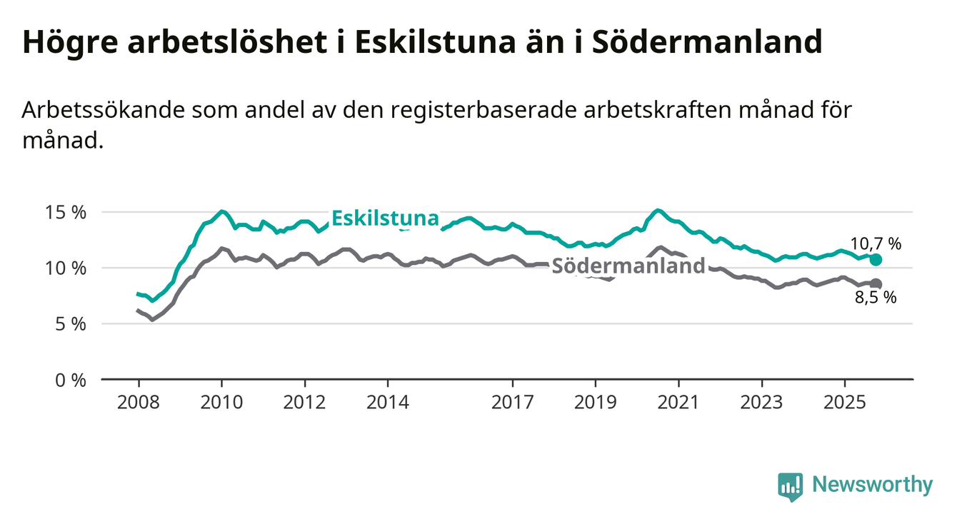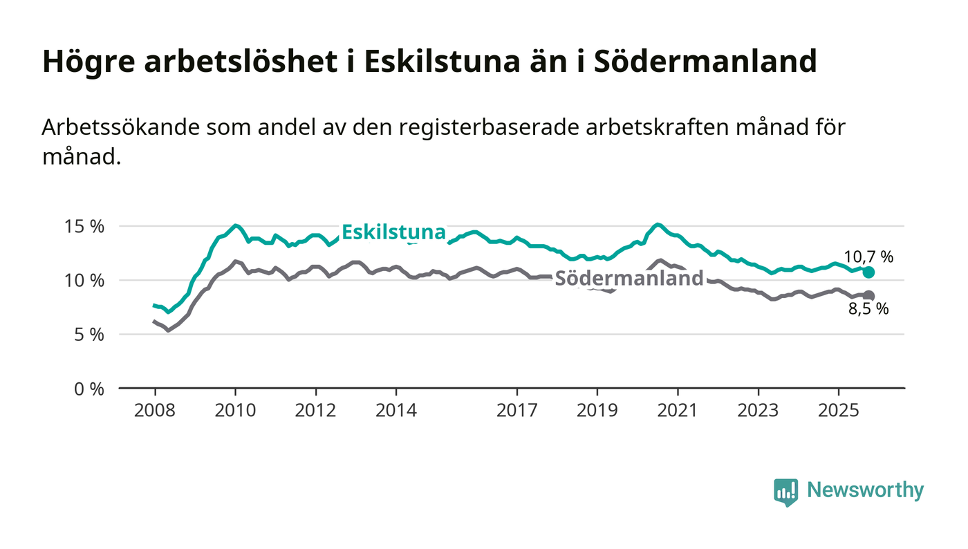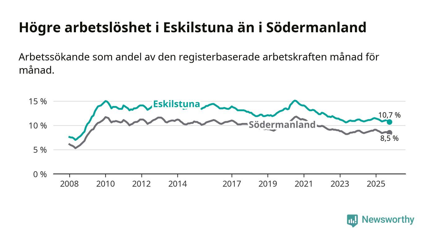 Under oktober månad rapporterade Eskilstuna kommun en total arbetslöshet på 10,7 procent. Det är en minskning jämfört med samma tidpunkt i fjol (−0,5 procentenheter). Även i Södermanlands län sjunker arbetslösheten .