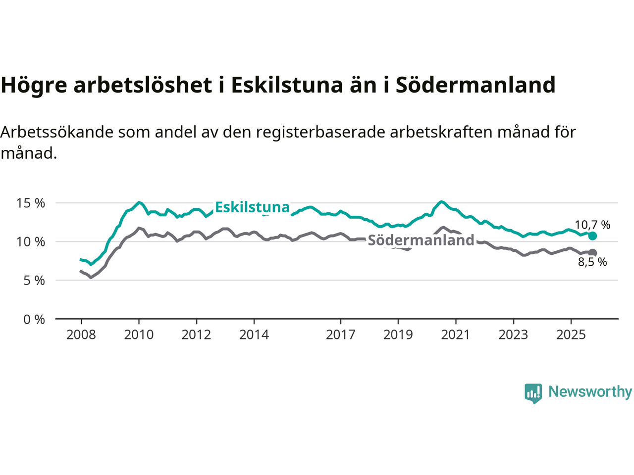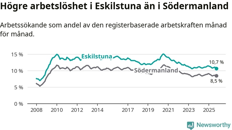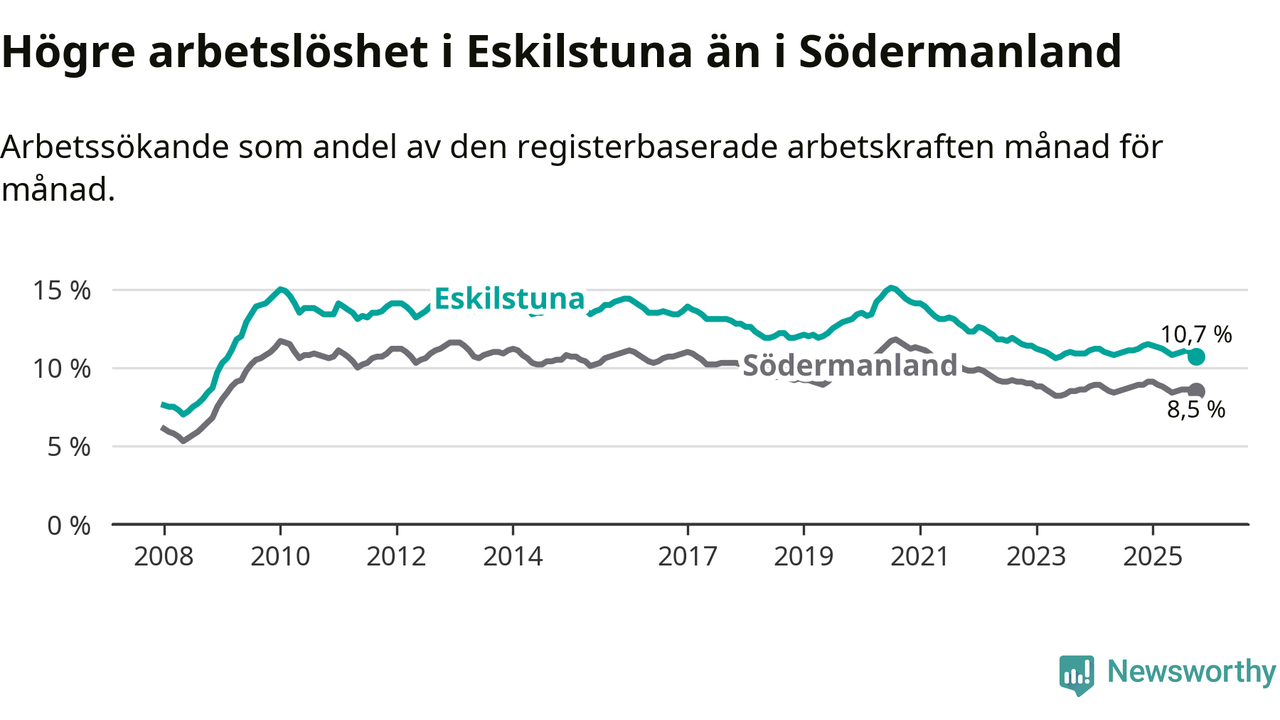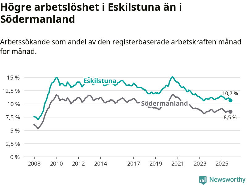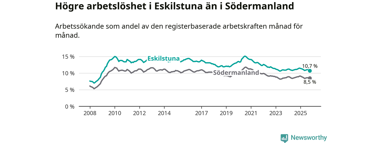 Under oktober månad rapporterade Eskilstuna kommun en total arbetslöshet på 10,7 procent. Det är en minskning jämfört med samma tidpunkt i fjol (−0,5 procentenheter). Även i Södermanlands län sjunker arbetslösheten .