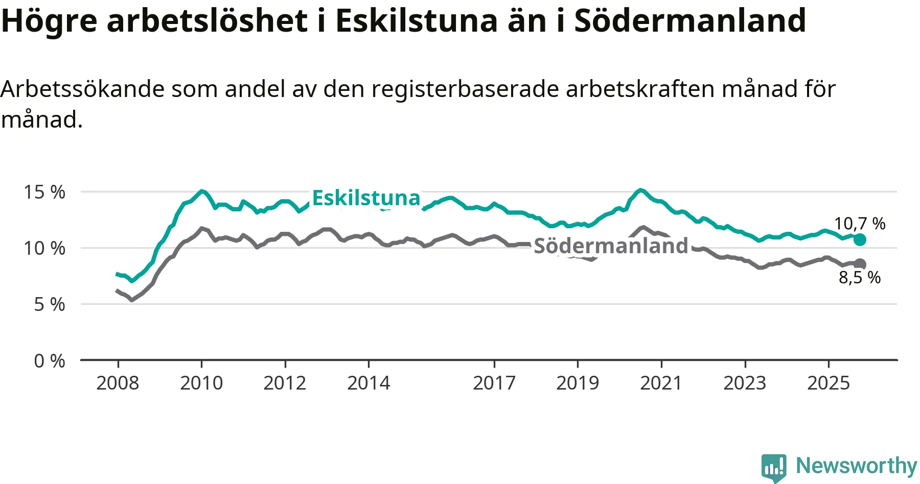 Perstorp är den kommun som har högst arbetslöshet just nu (13,6 procent) i landet som helhet, medan Kiruna har den lägsta (2,6 procent). Eskilstunas arbetslöshet sticker ut som den sjätte högsta i hela landet.