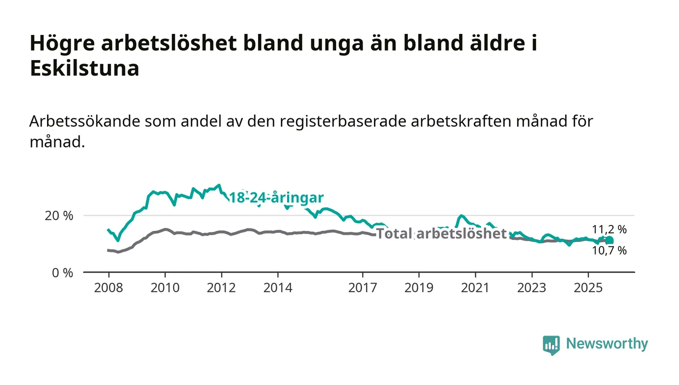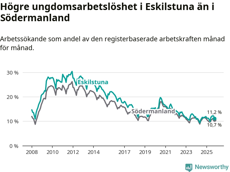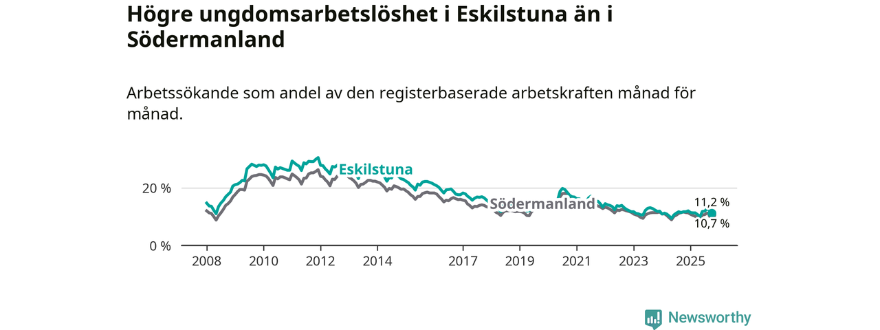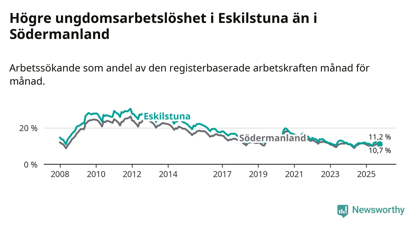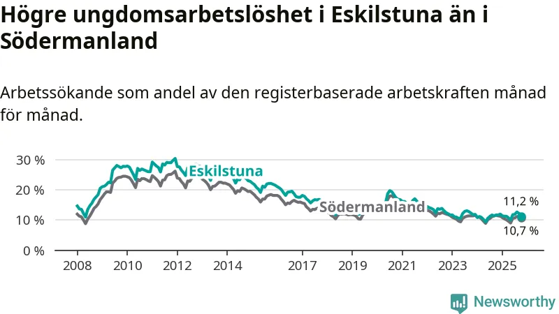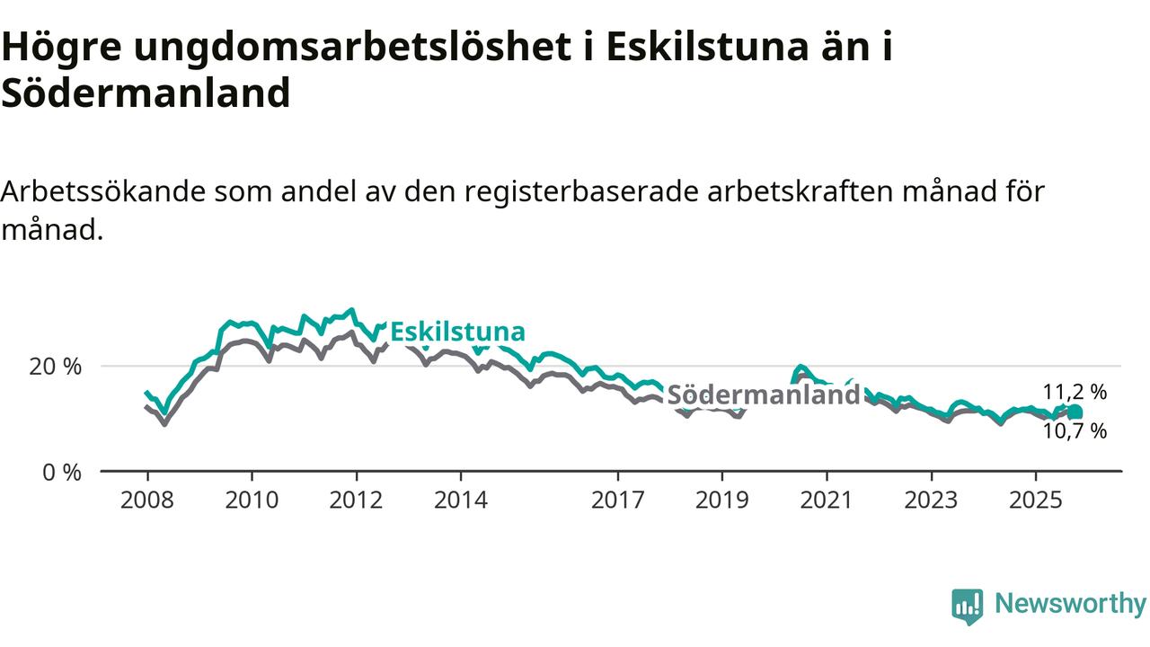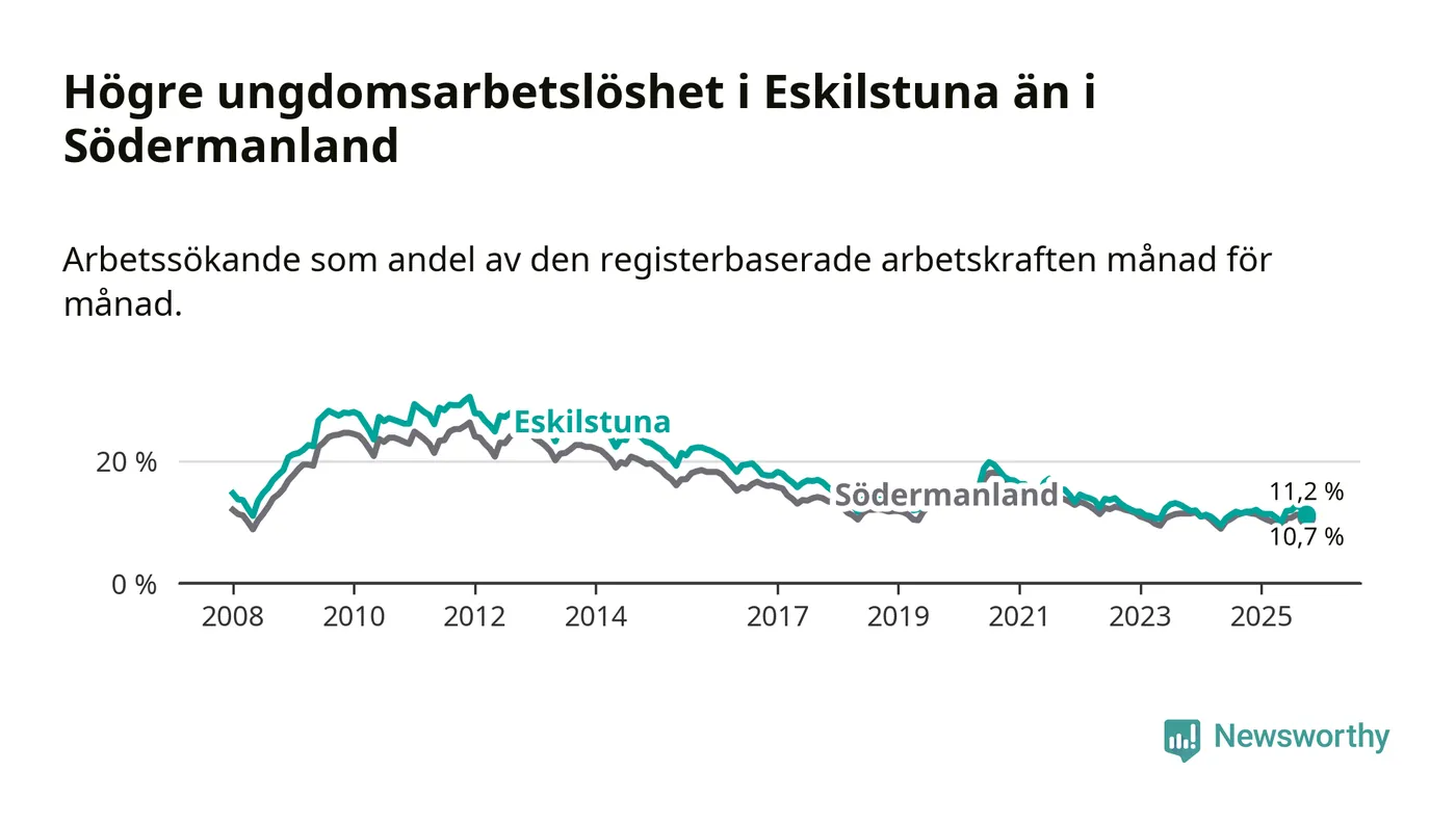 Precis som den totala arbetslösheten ligger ungdomsarbetslösheten i Eskilstuna högre än i Södermanland som helhet. Skillnaden mellan kommunen och länet är 0,5 procentenheter.