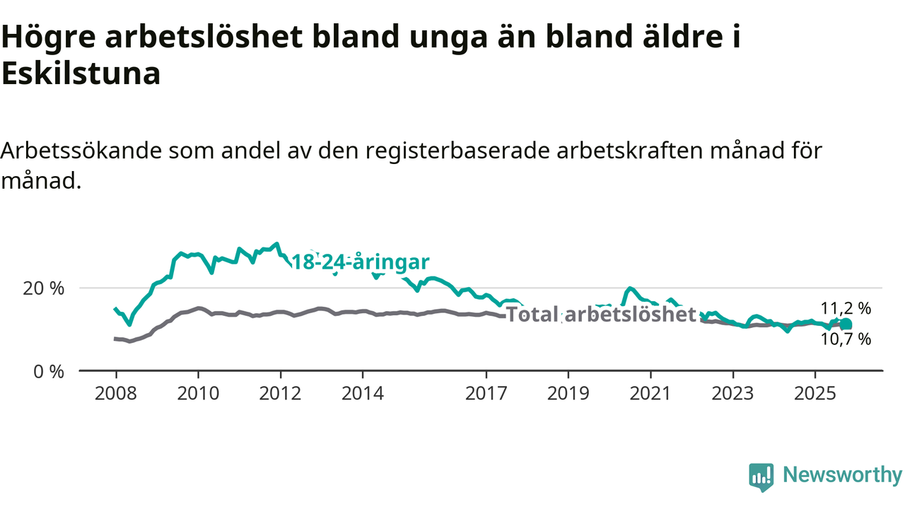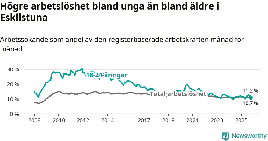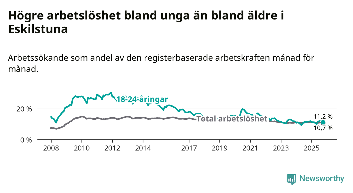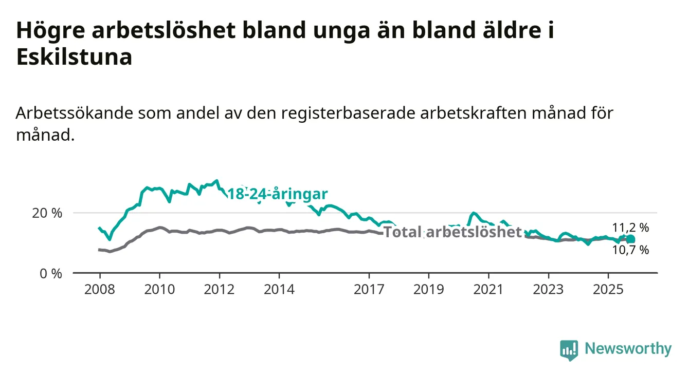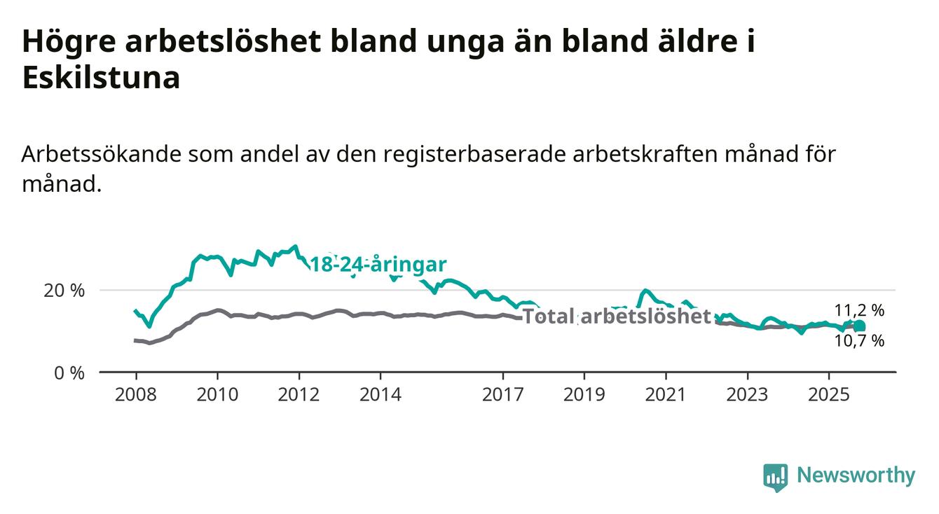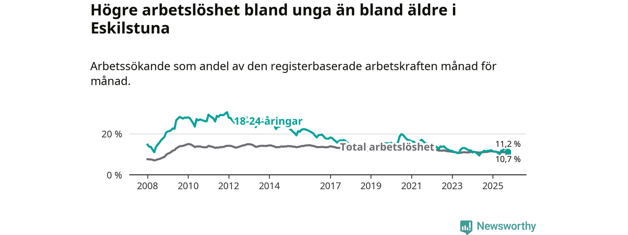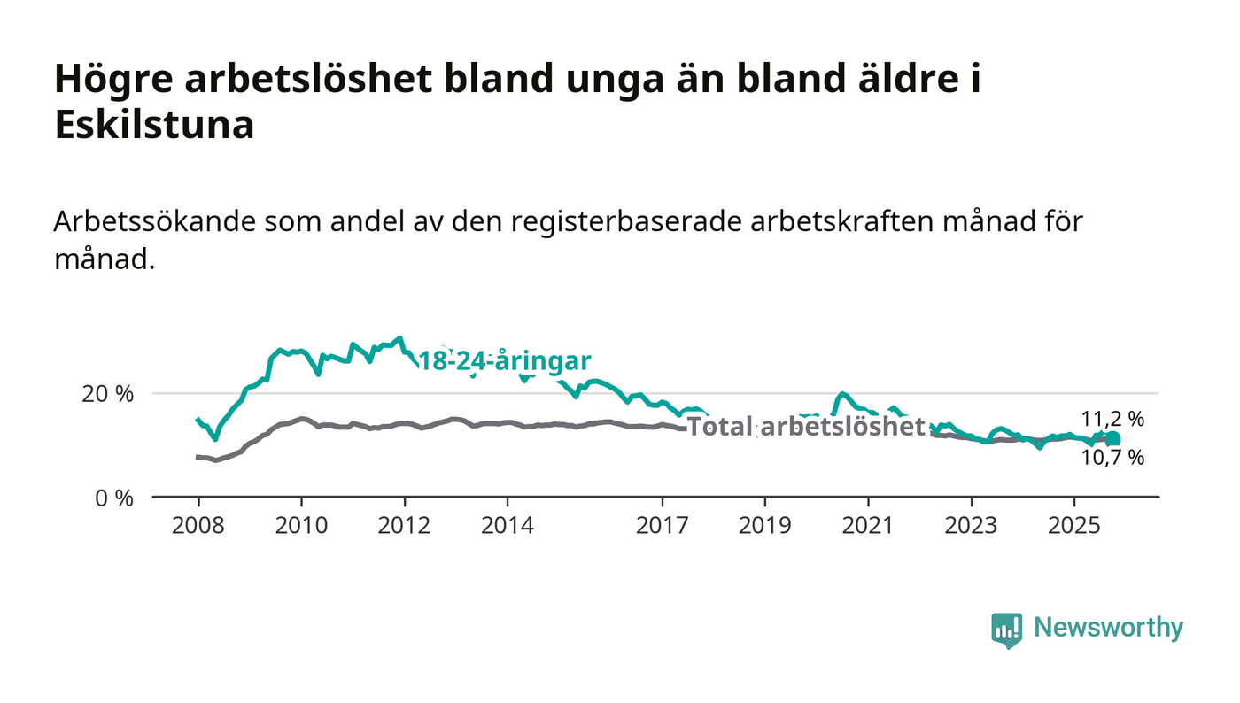 Precis som den totala arbetslösheten ligger ungdomsarbetslösheten i Eskilstuna högre än i Södermanland som helhet. Skillnaden mellan kommunen och länet är 0,5 procentenheter.