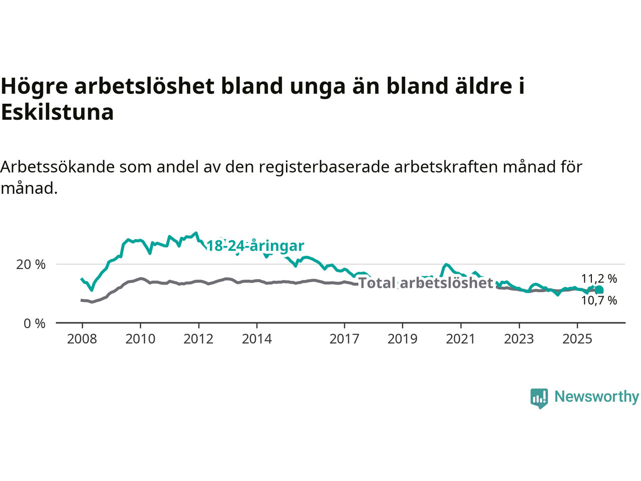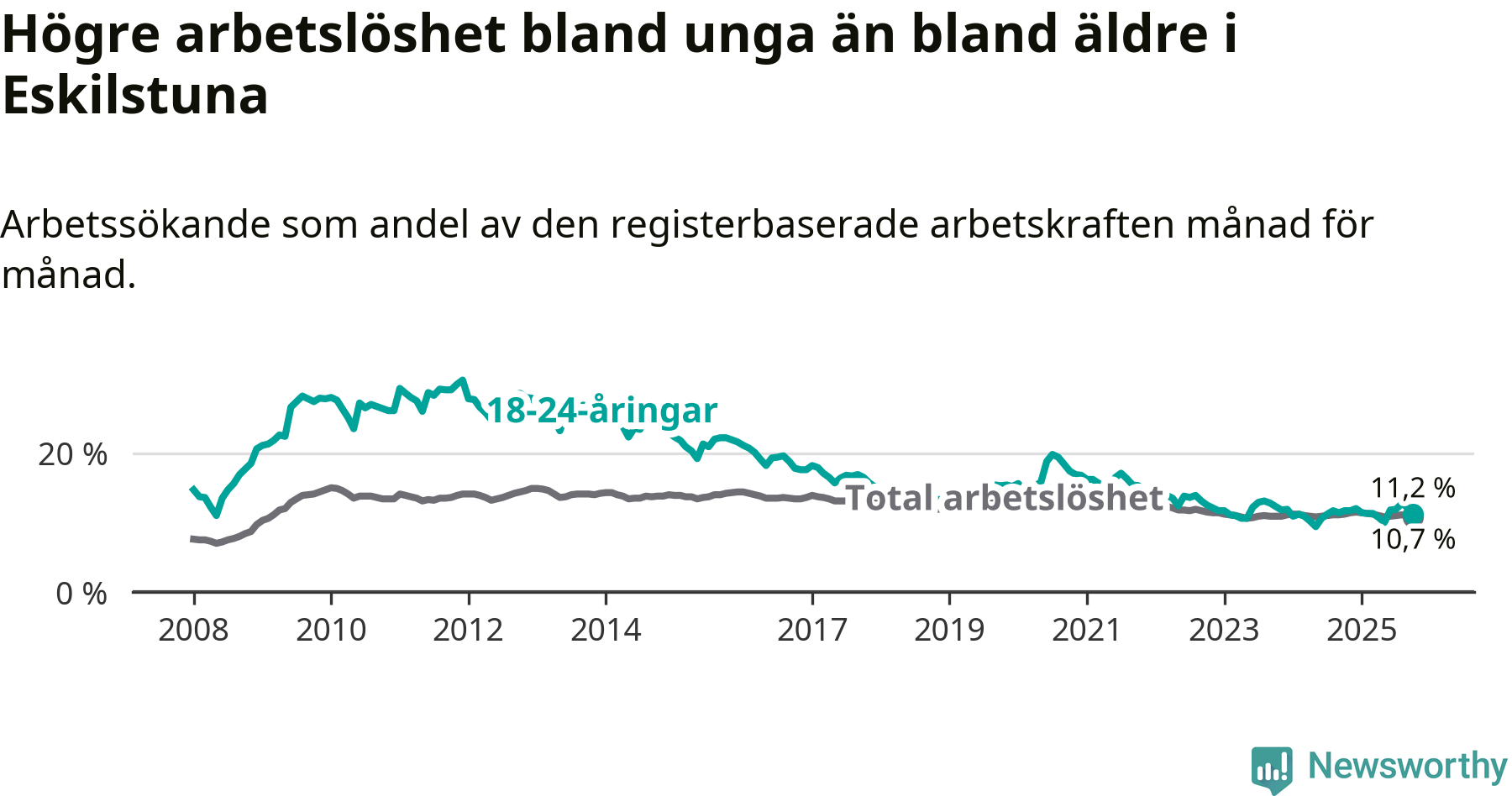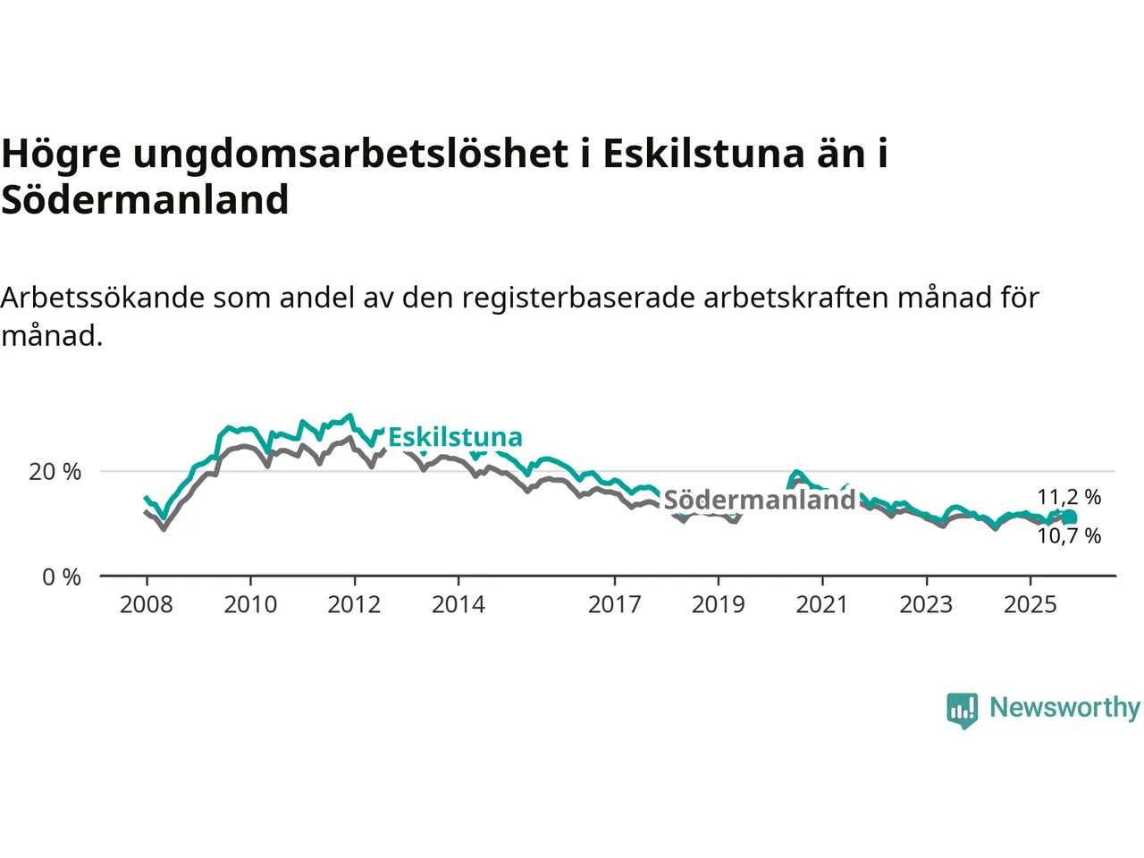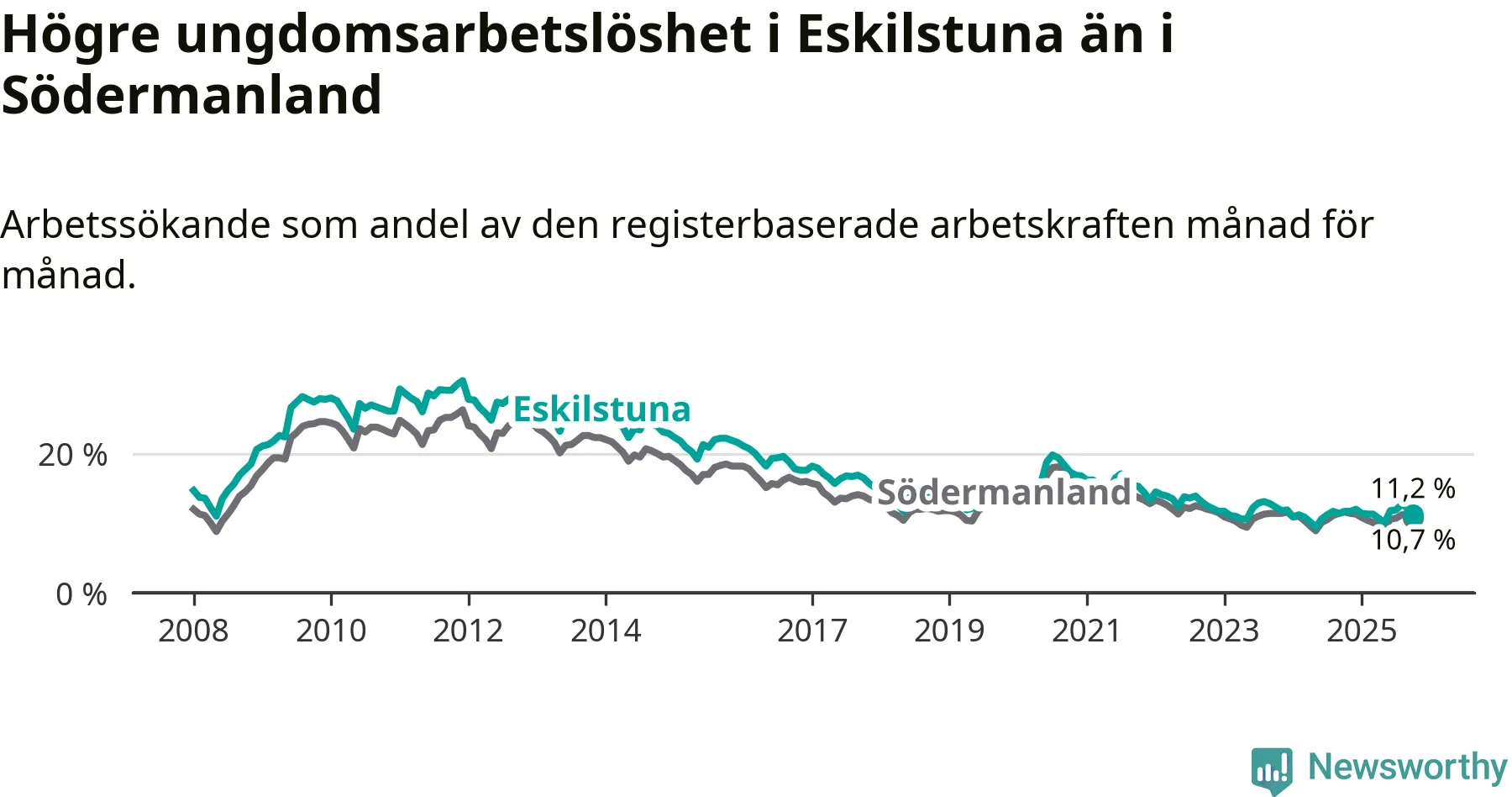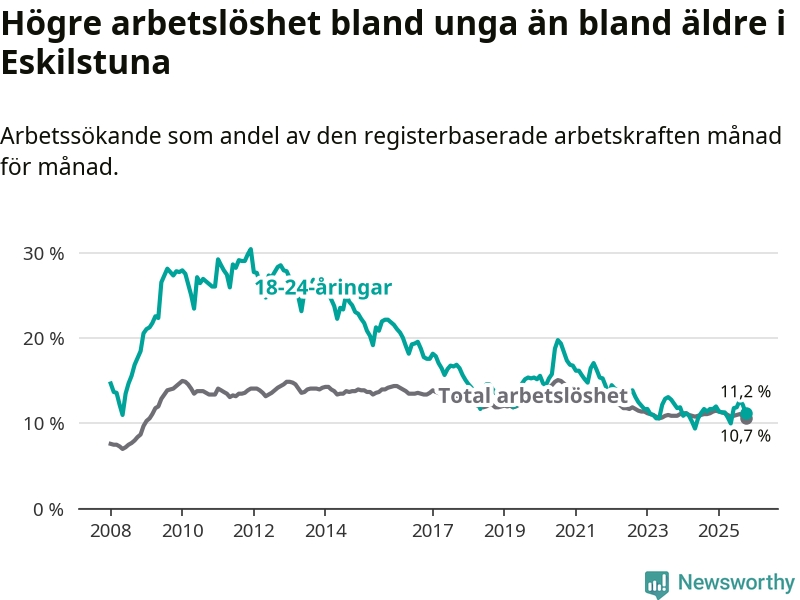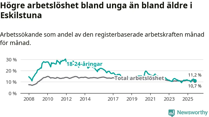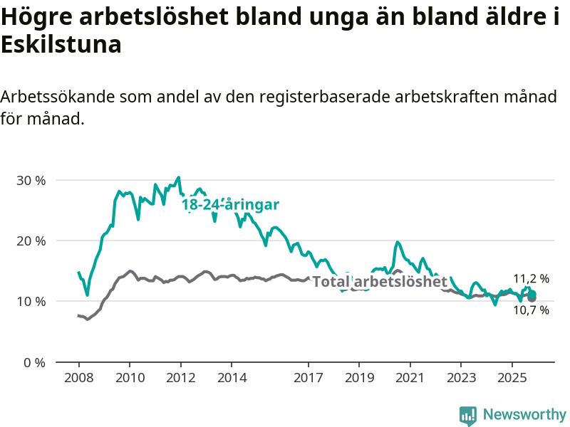 Precis som den totala arbetslösheten ligger ungdomsarbetslösheten i Eskilstuna högre än i Södermanland som helhet. Skillnaden mellan kommunen och länet är 0,5 procentenheter.