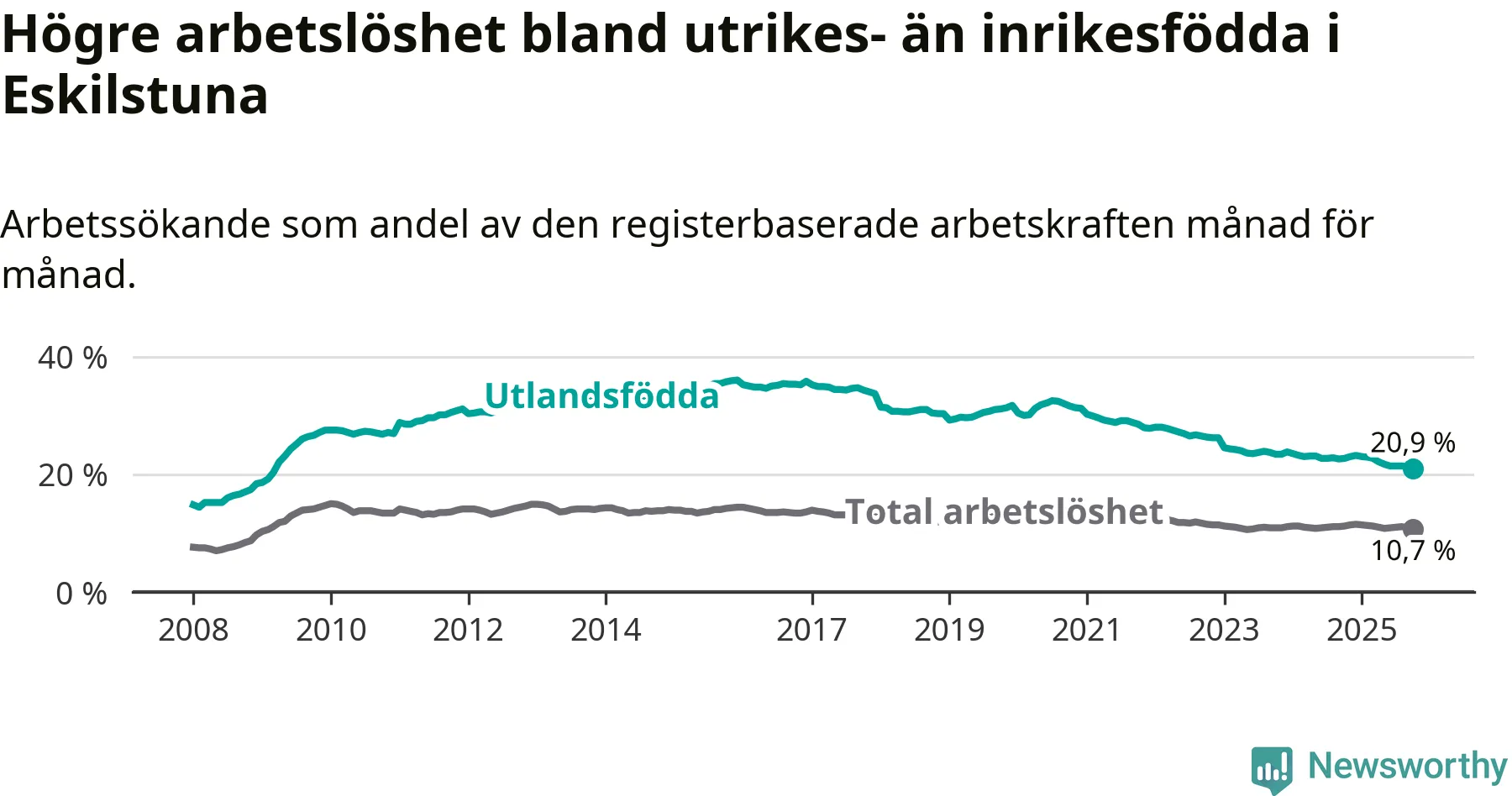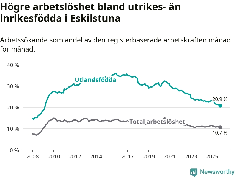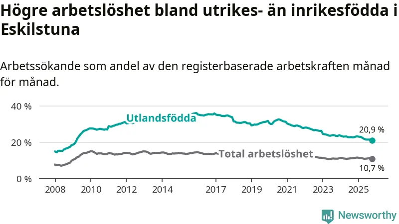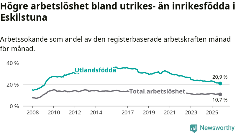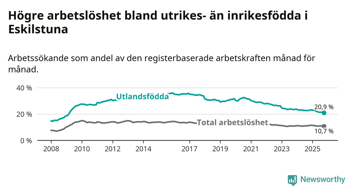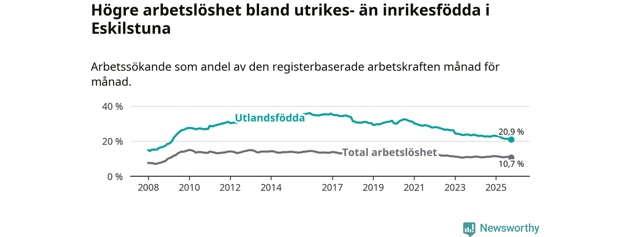 Arbetslösheten bland utlandsfödda var 20,9 procent i Eskilstuna under oktober månad, motsvarande 3 566 av 17 062 personer. Det är 1,8 procentenheter färre än vid samma tidpunkt i fjol (−329 om man räknar personer). Därmed har de utlandsföddas arbetslöshet varit lägre än vid samma tidpunkt i fjol i över fyra år i sträck. Sedan november 2020 har arbetslösheten bland utlandsfödda minskat från 31,3 till 20,9 procent. Den nuvarande arbetslöshetsnivån är den lägsta sedan mars 2009.