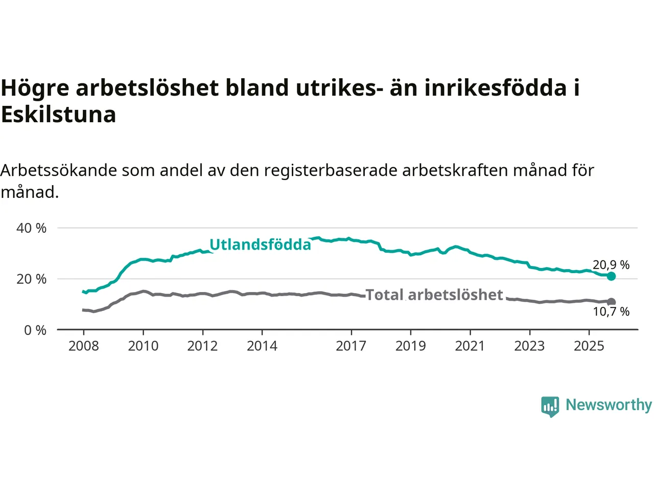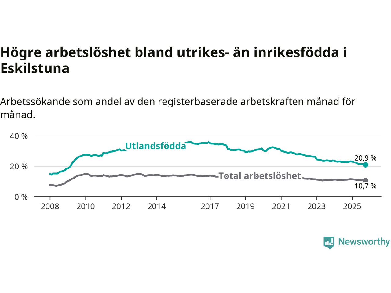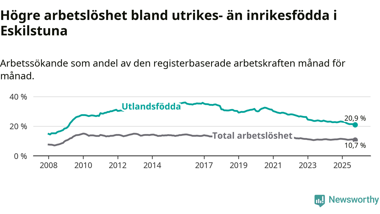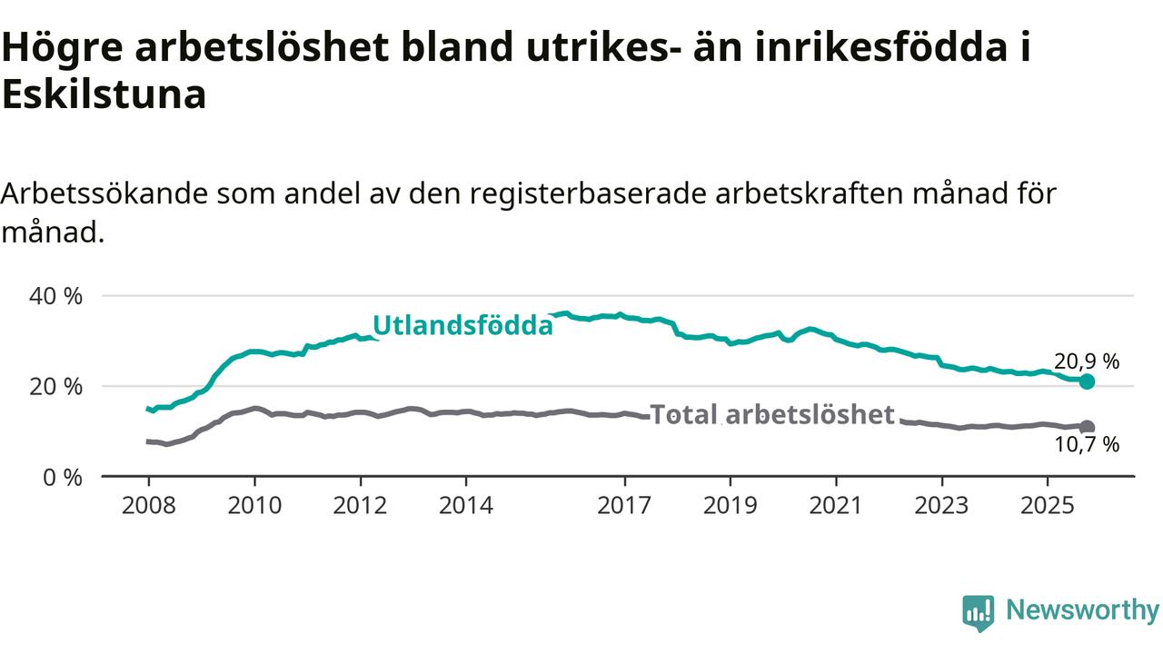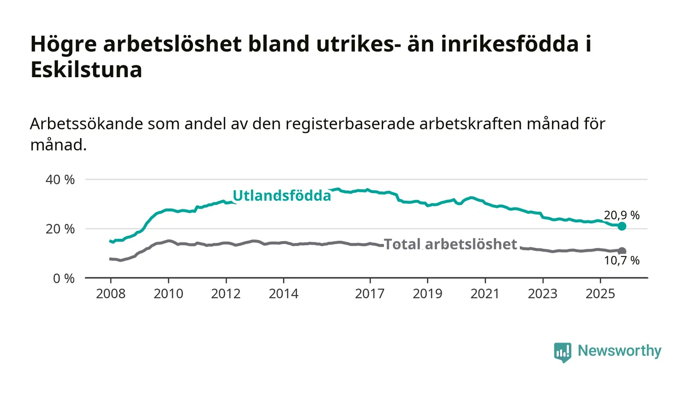 Skillnaden i arbetslöshet mellan utrikesfödda och hela befolkningen är 10,2 procentenheter i Eskilstuna. Det är en mindre skillnad än för ett år sedan (−1,3 procentenheter).