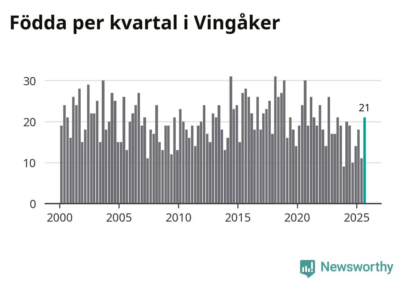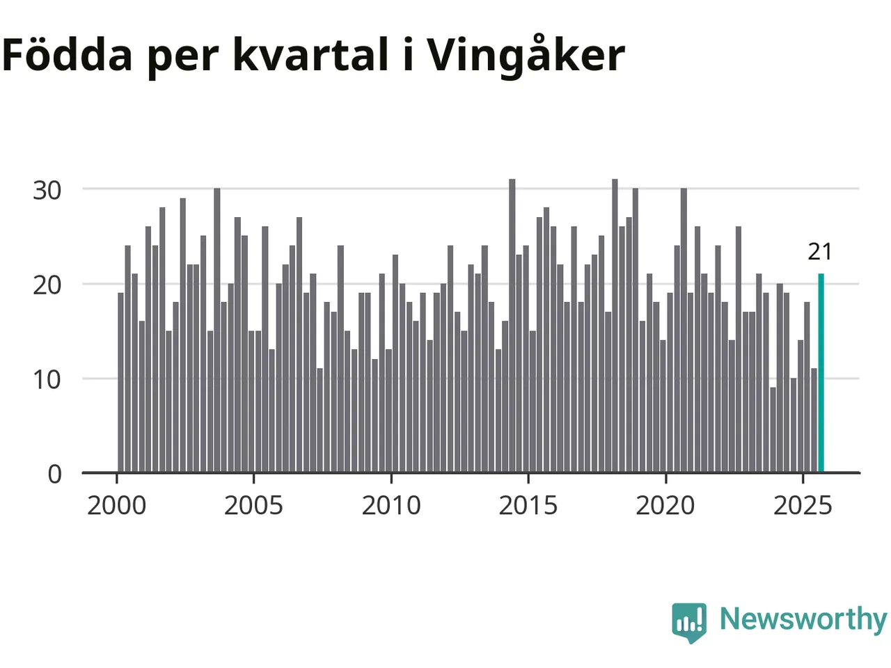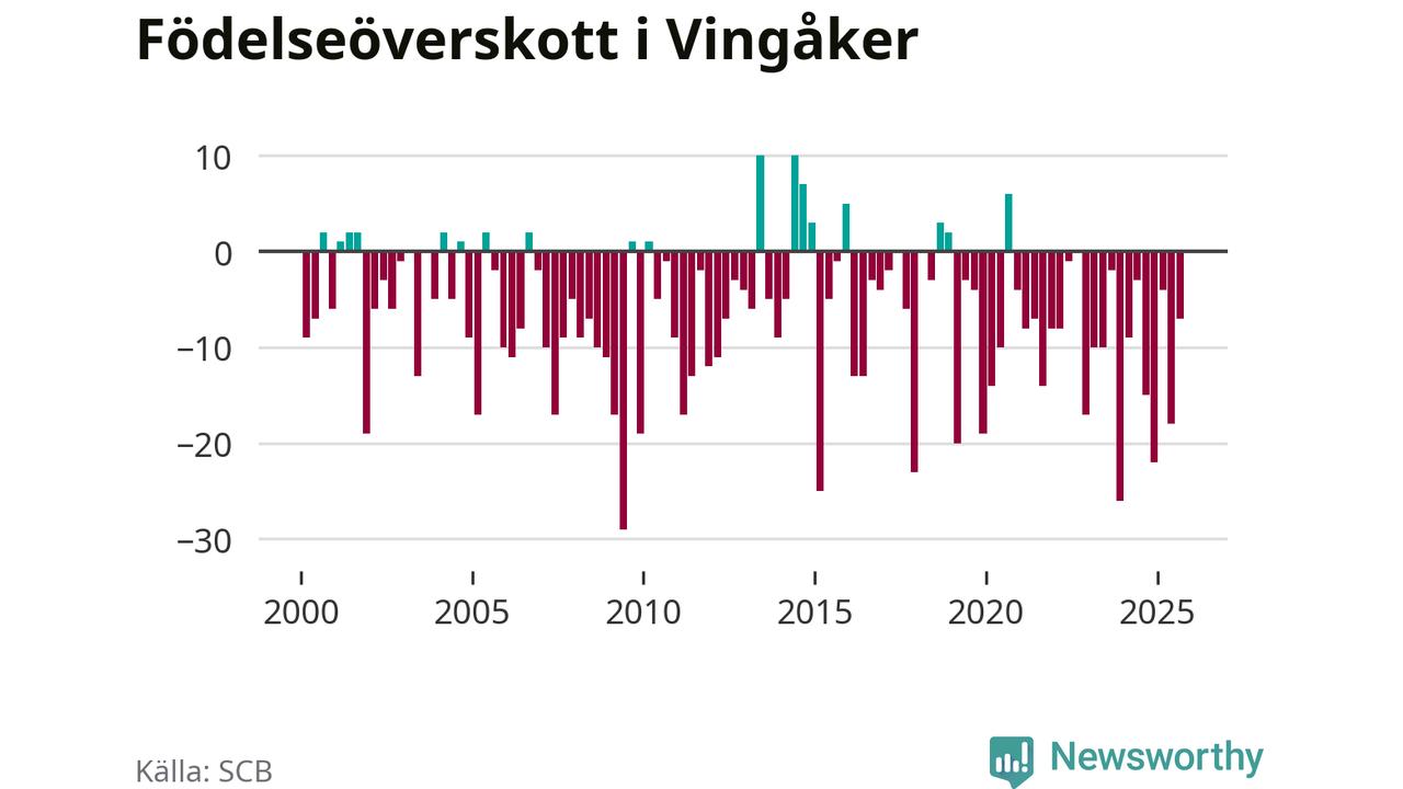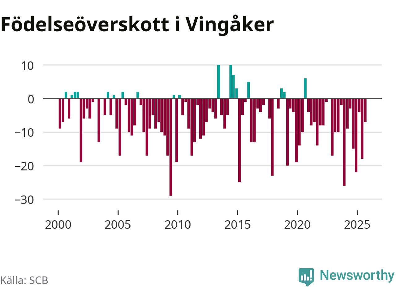 Enligt SCB:s siffror föddes 21 barn i Vingåker under det senaste kvartalet. Samtidigt avled 28 personer. Skillnaden mellan antal födda och döda är så liten att det inte går att säga om det beror på något annat än SCB:s röjandeskydd. Kommunen har oftast haft negativt födelsenetto tidigare.