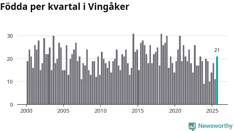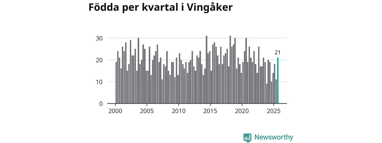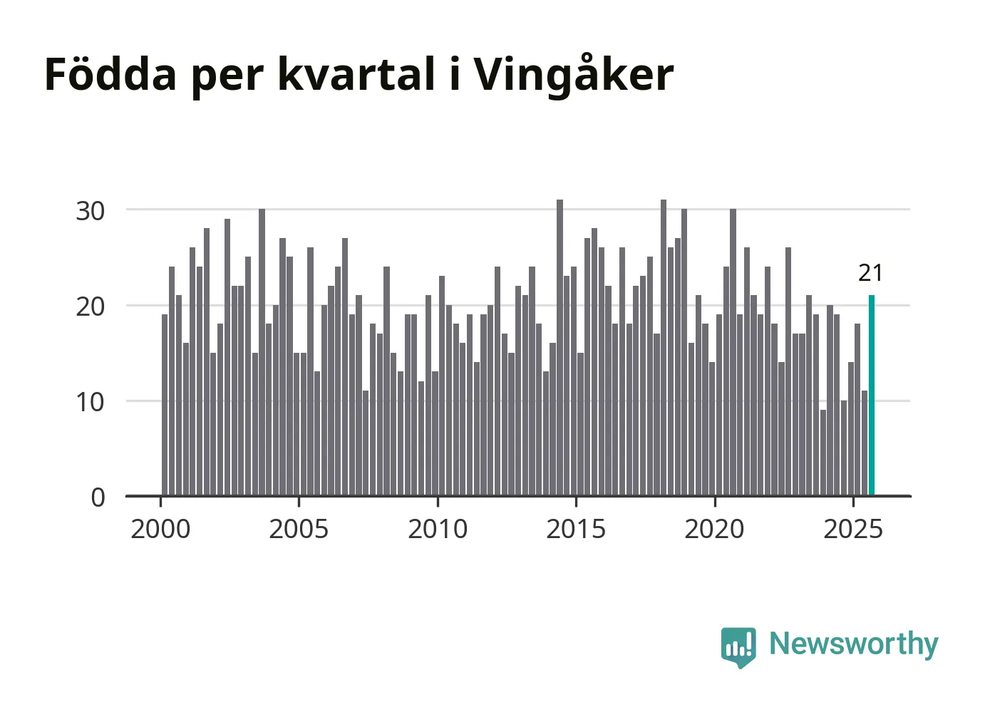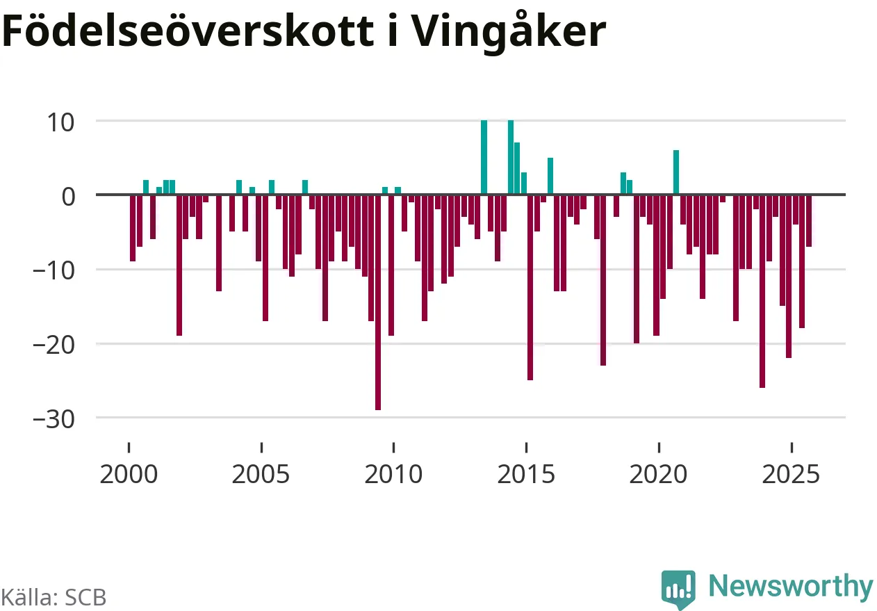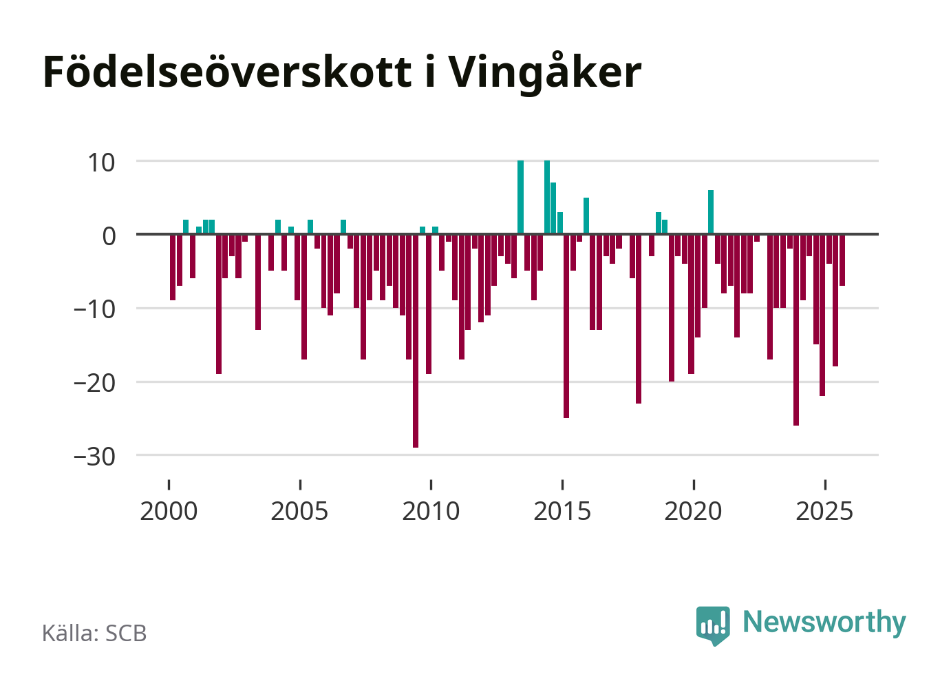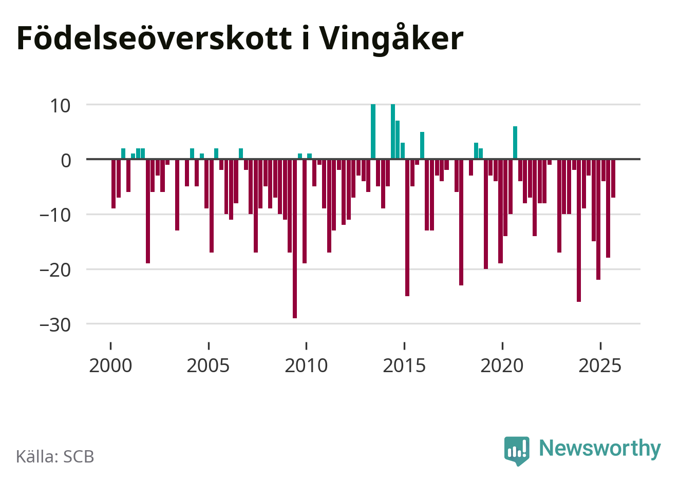 Enligt SCB:s siffror föddes 21 barn i Vingåker under det senaste kvartalet. Samtidigt avled 28 personer. Skillnaden mellan antal födda och döda är så liten att det inte går att säga om det beror på något annat än SCB:s röjandeskydd. Kommunen har oftast haft negativt födelsenetto tidigare.