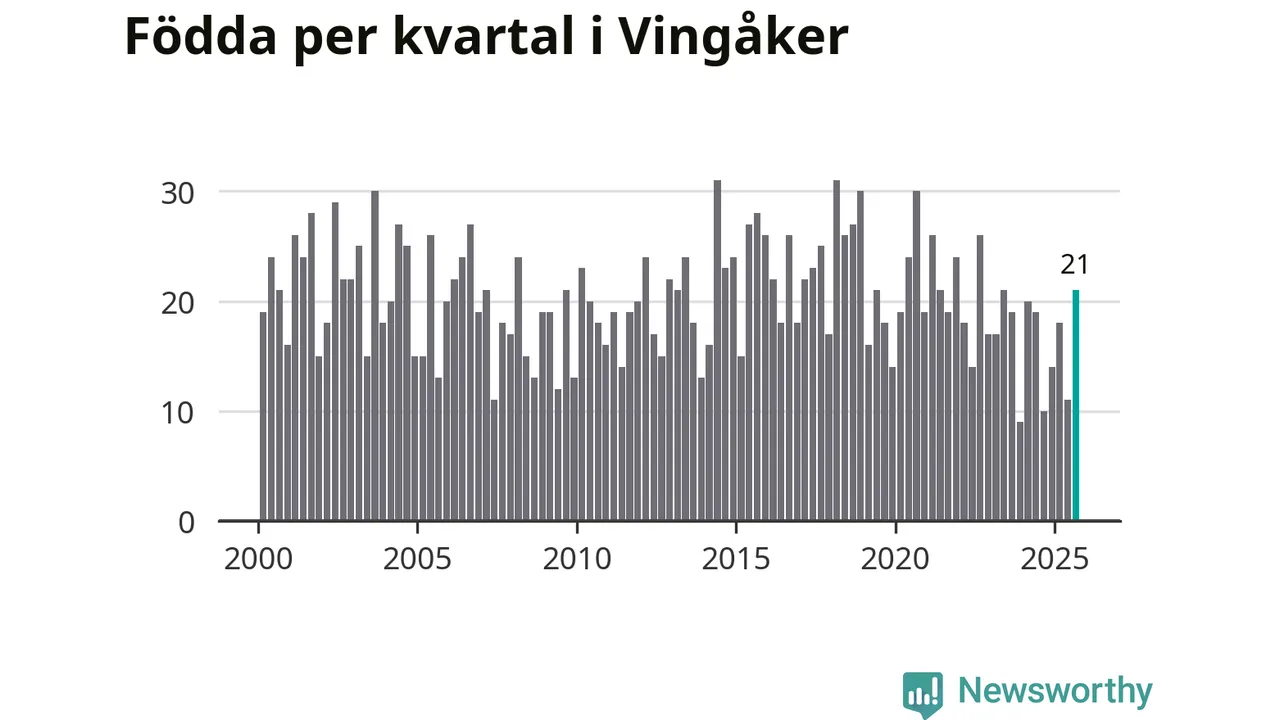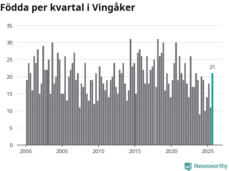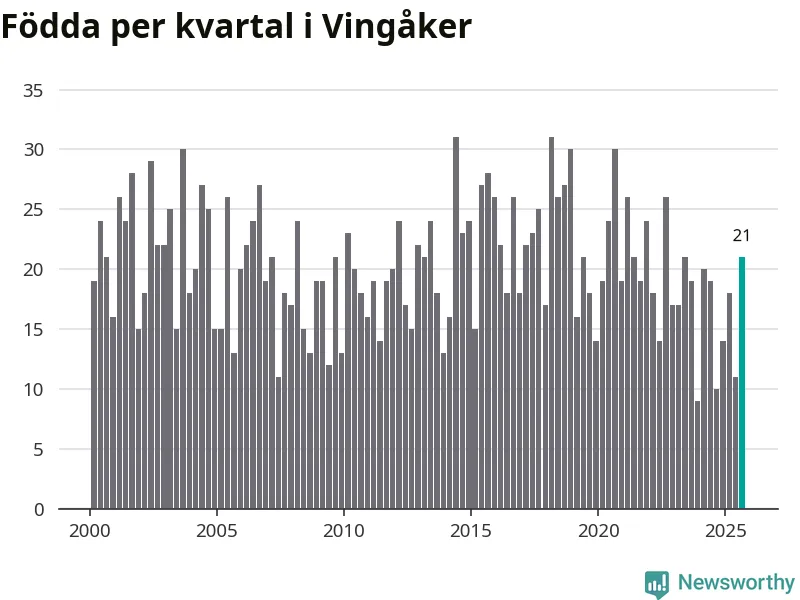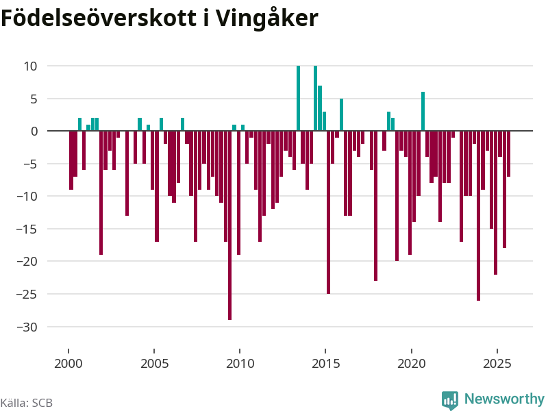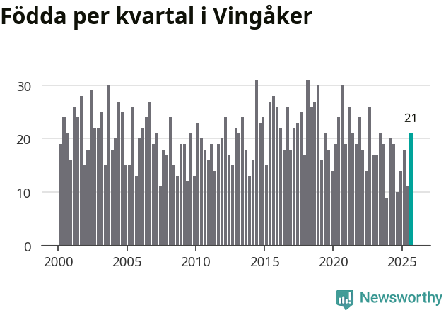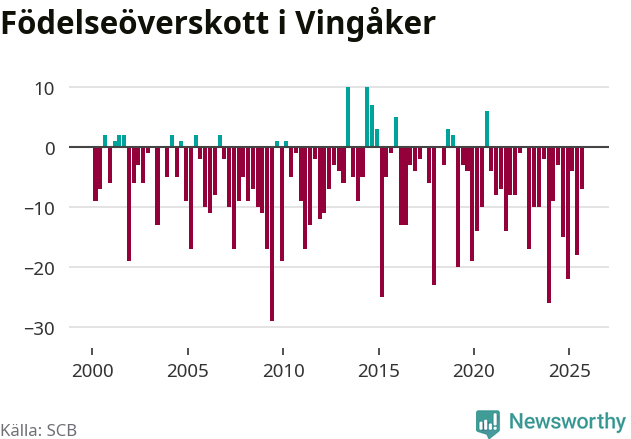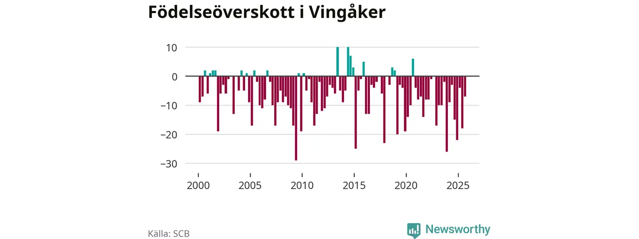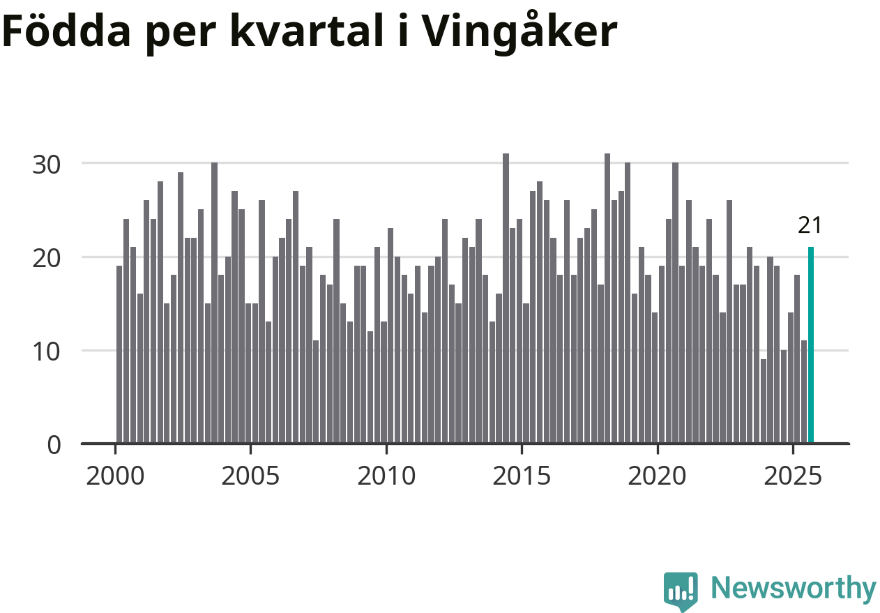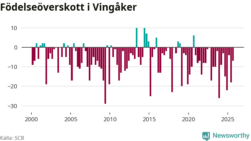 Enligt SCB:s siffror föddes 21 barn i Vingåker under det senaste kvartalet. Samtidigt avled 28 personer. Skillnaden mellan antal födda och döda är så liten att det inte går att säga om det beror på något annat än SCB:s röjandeskydd. Kommunen har oftast haft negativt födelsenetto tidigare.