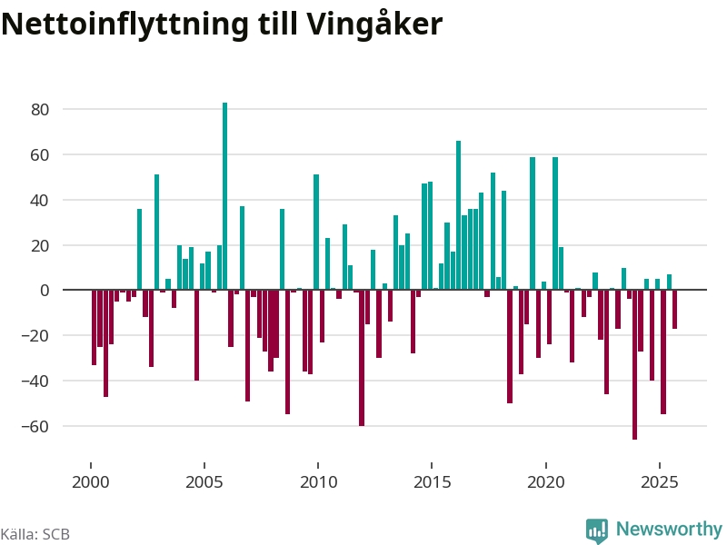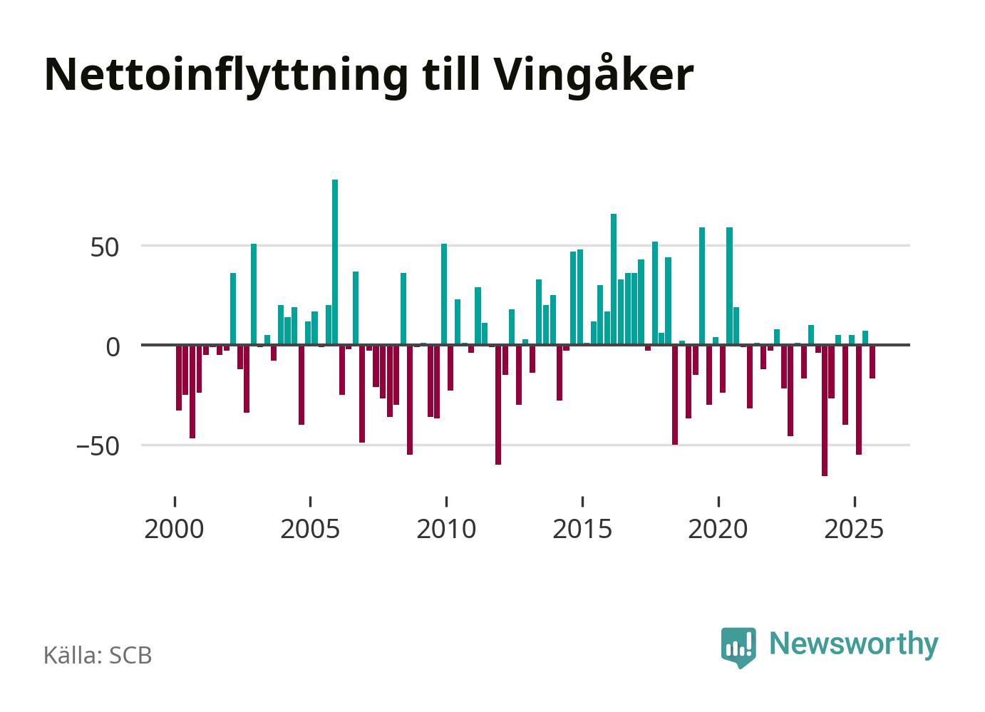 Under tredje kvartalet 2025 flyttade 132 personer till kommunen medan 149 personer flyttade därifrån. Sedan seklets början har Vingåker haft ungefär lika många kvartal med positivt flyttnetto som negativt.
