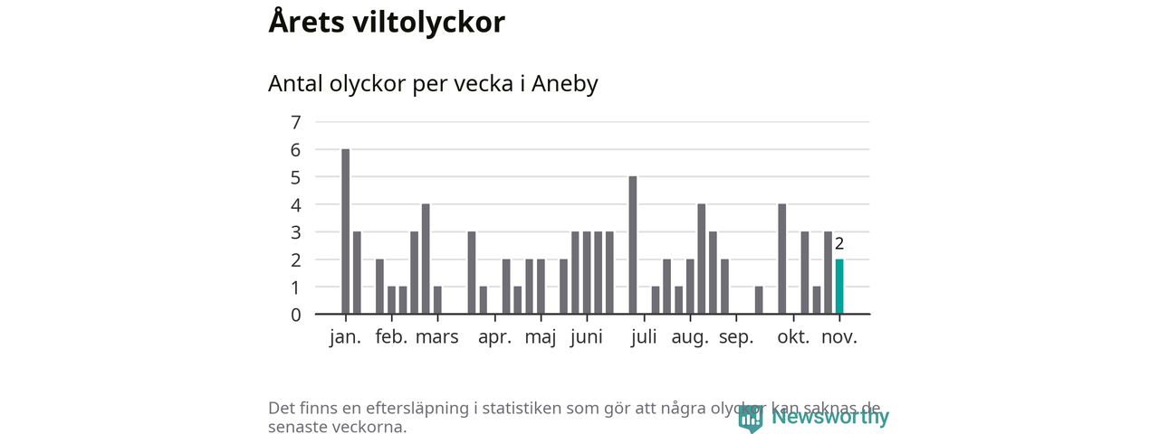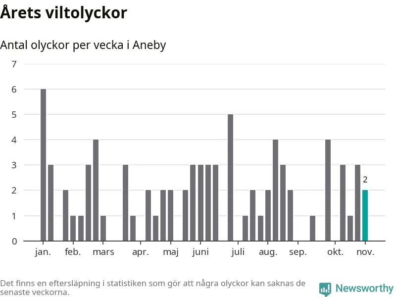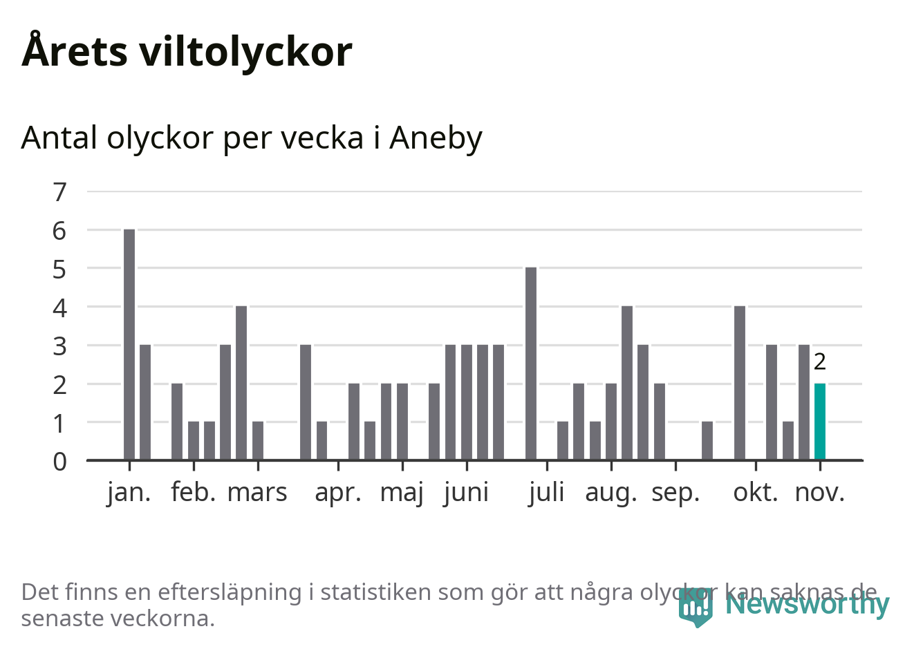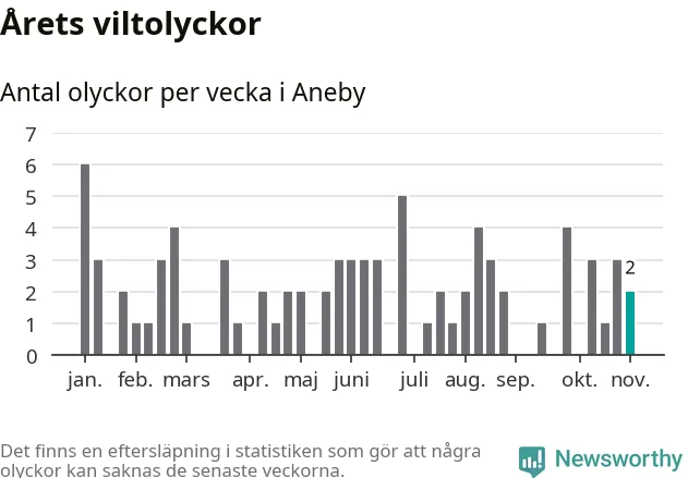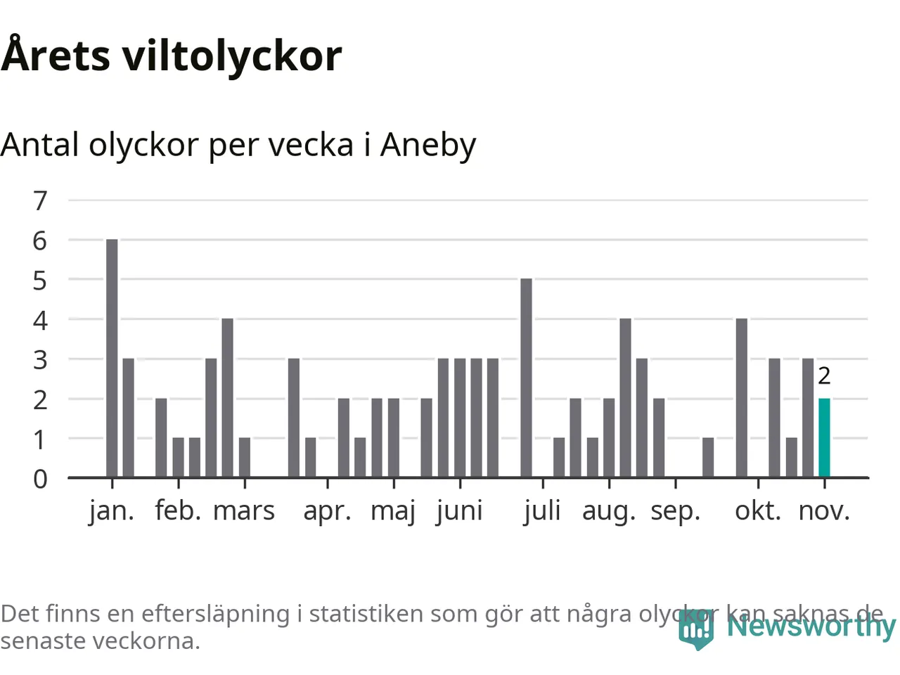 Hittills har två viltolyckor rapporterats in i Aneby kommun från vecka 45. Se listan här.