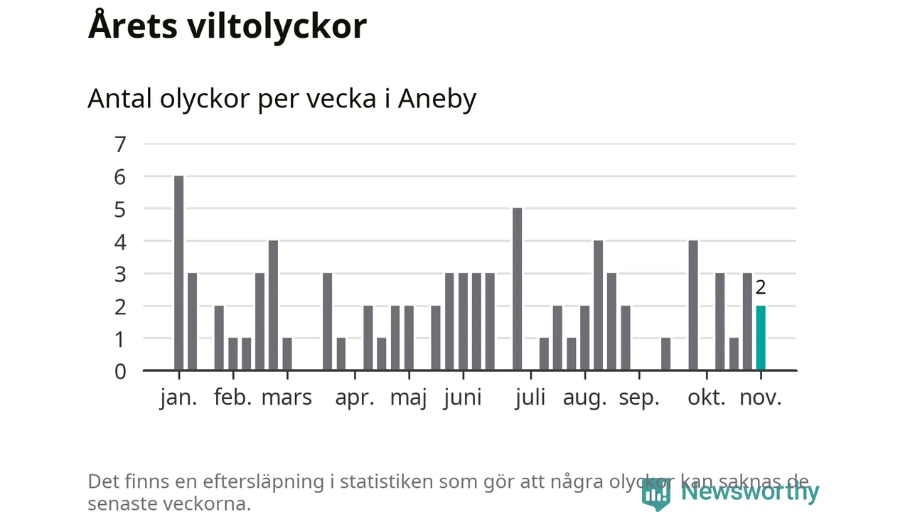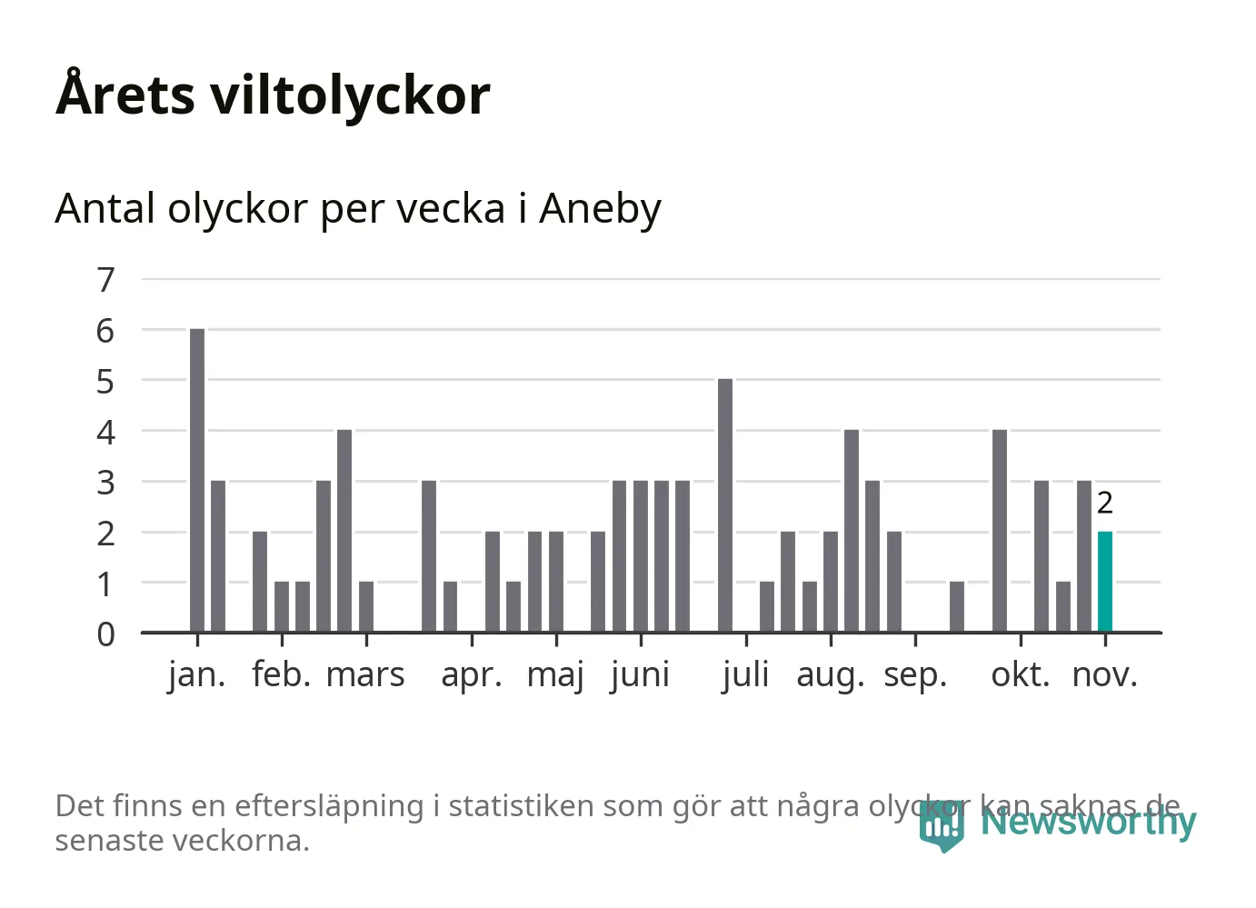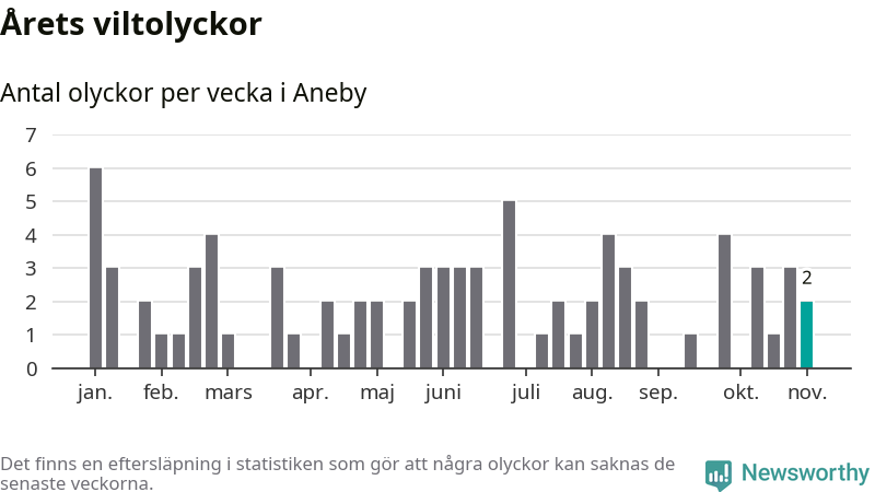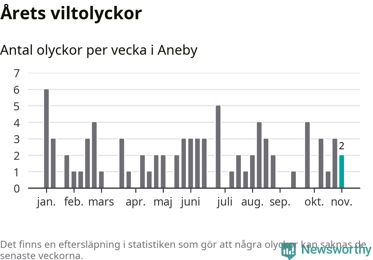 Hittills har två viltolyckor rapporterats in i Aneby kommun från vecka 45. Se listan här.