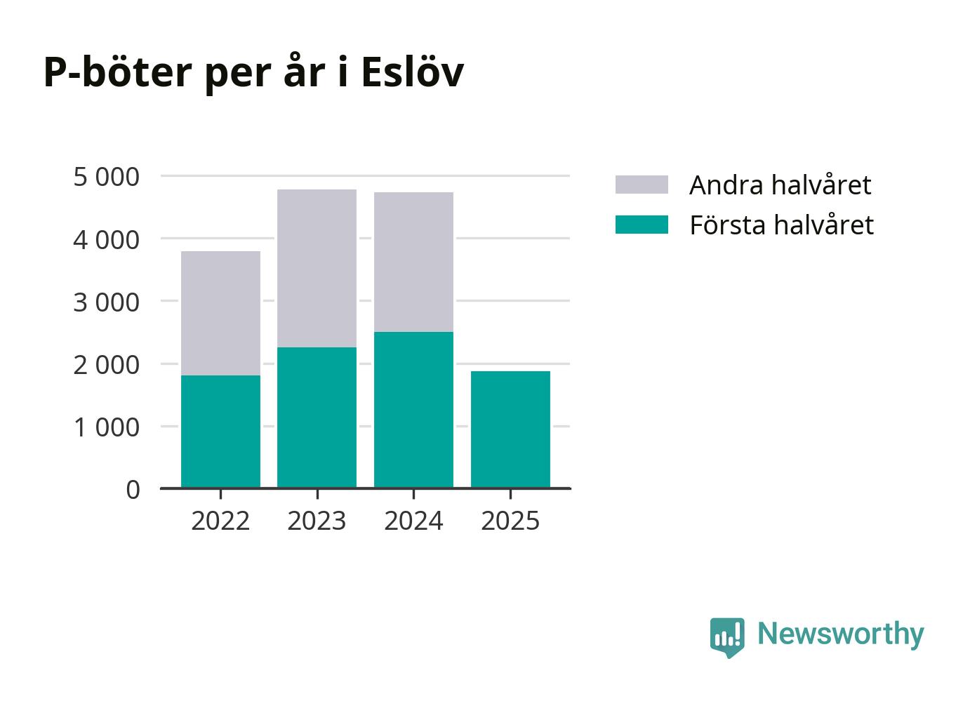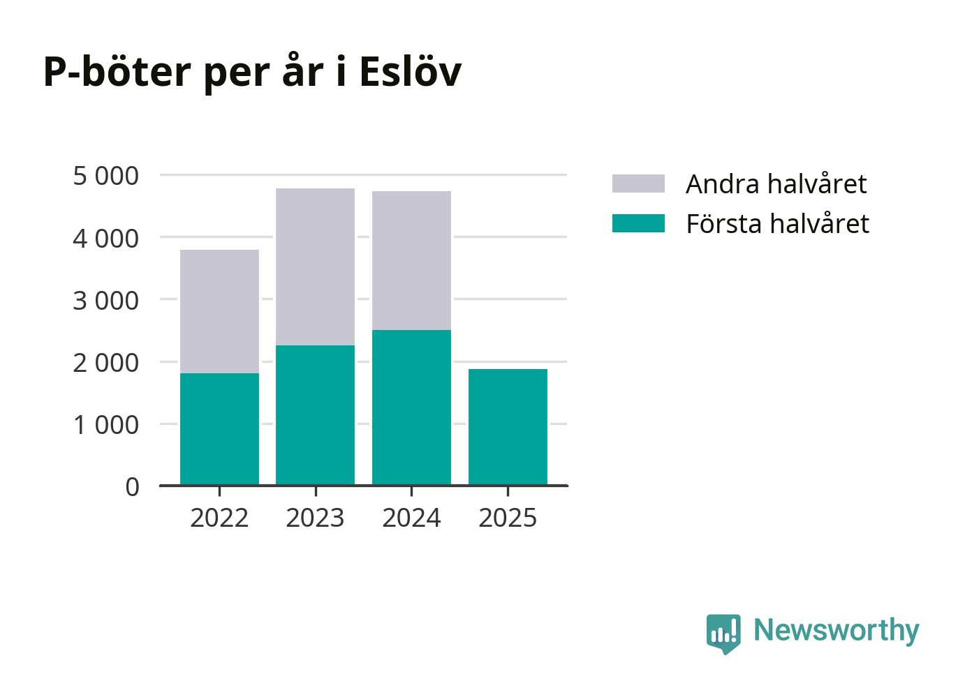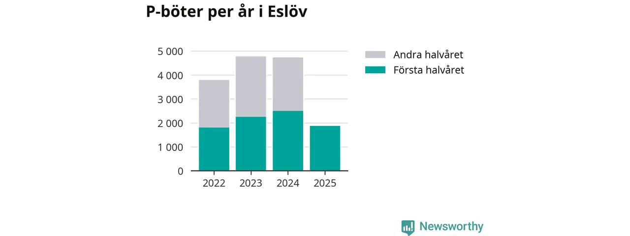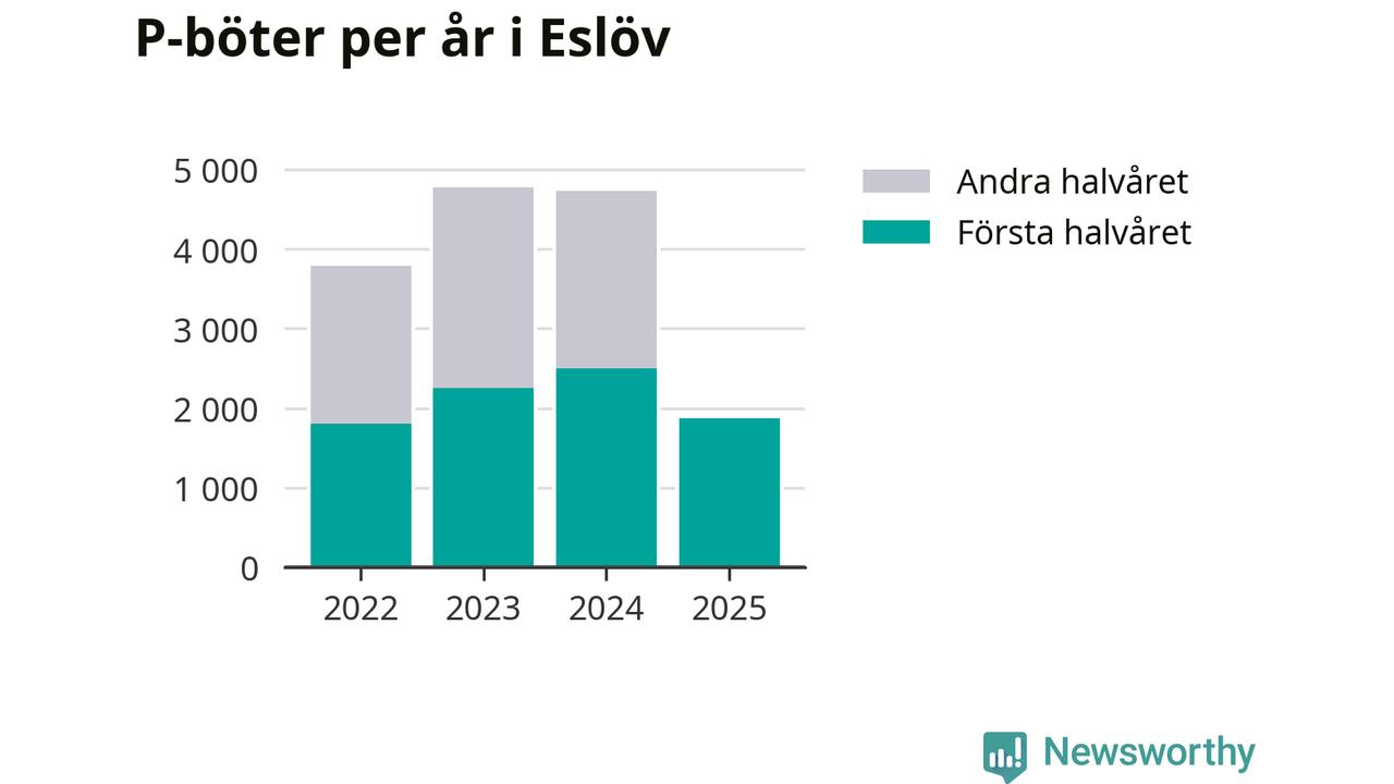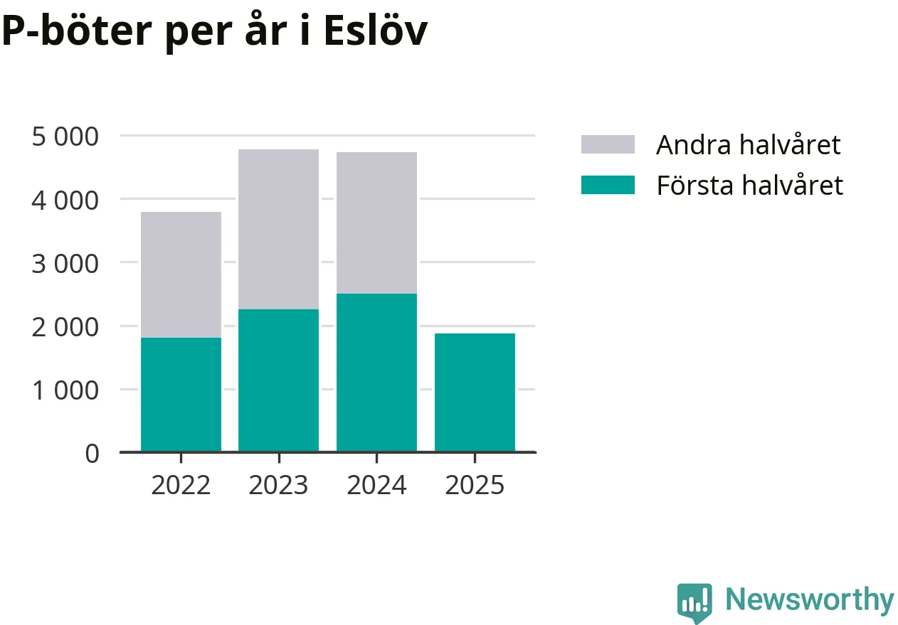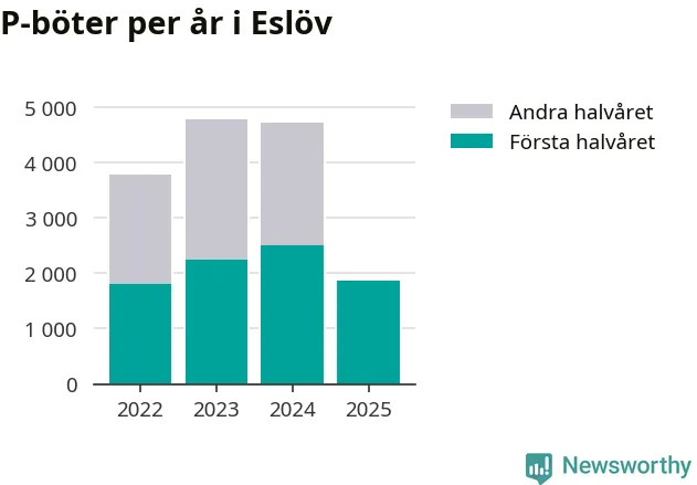 Under första halvåret 2025 har 1 869 parkeringsanmärkningar, med en total felparkeringsavgift på drygt 1,2 miljoner kronor, delats ut på gatumark i Eslövs kommun. Det är 628 färre än under första halvåret 2024.