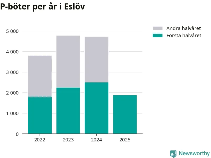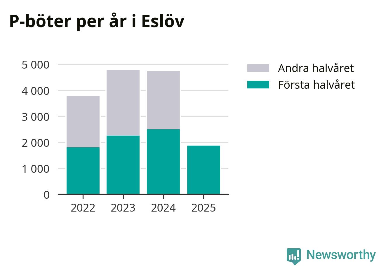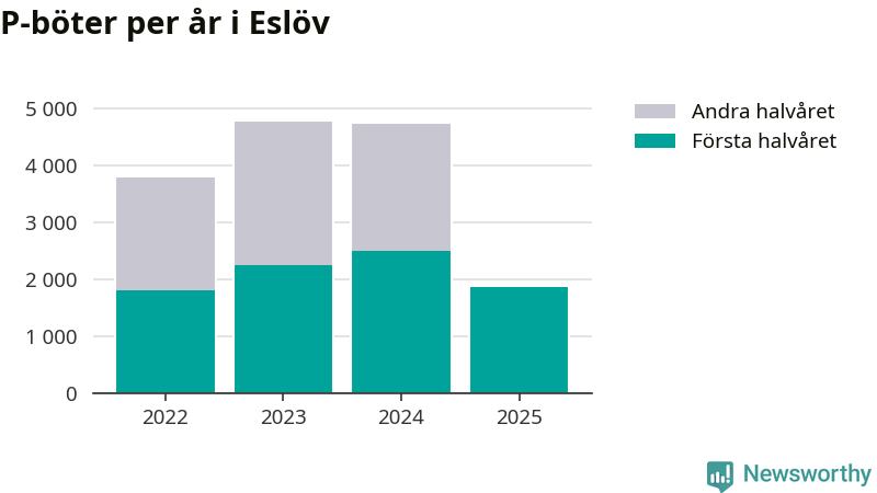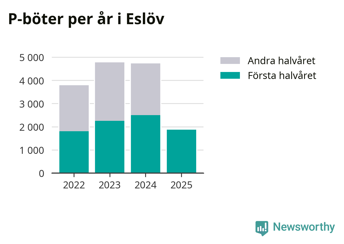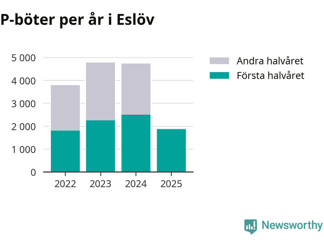 Under första halvåret 2025 har 1 869 parkeringsanmärkningar, med en total felparkeringsavgift på drygt 1,2 miljoner kronor, delats ut på gatumark i Eslövs kommun. Det är 628 färre än under första halvåret 2024.