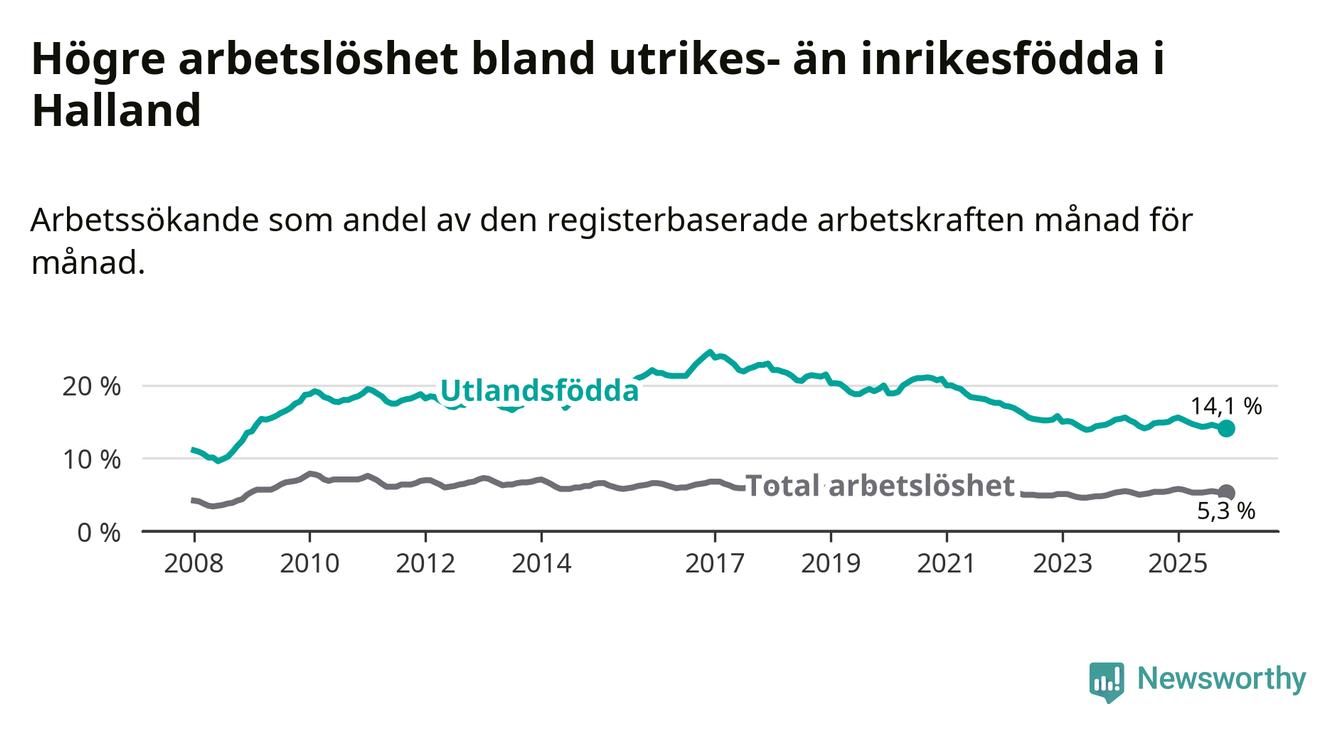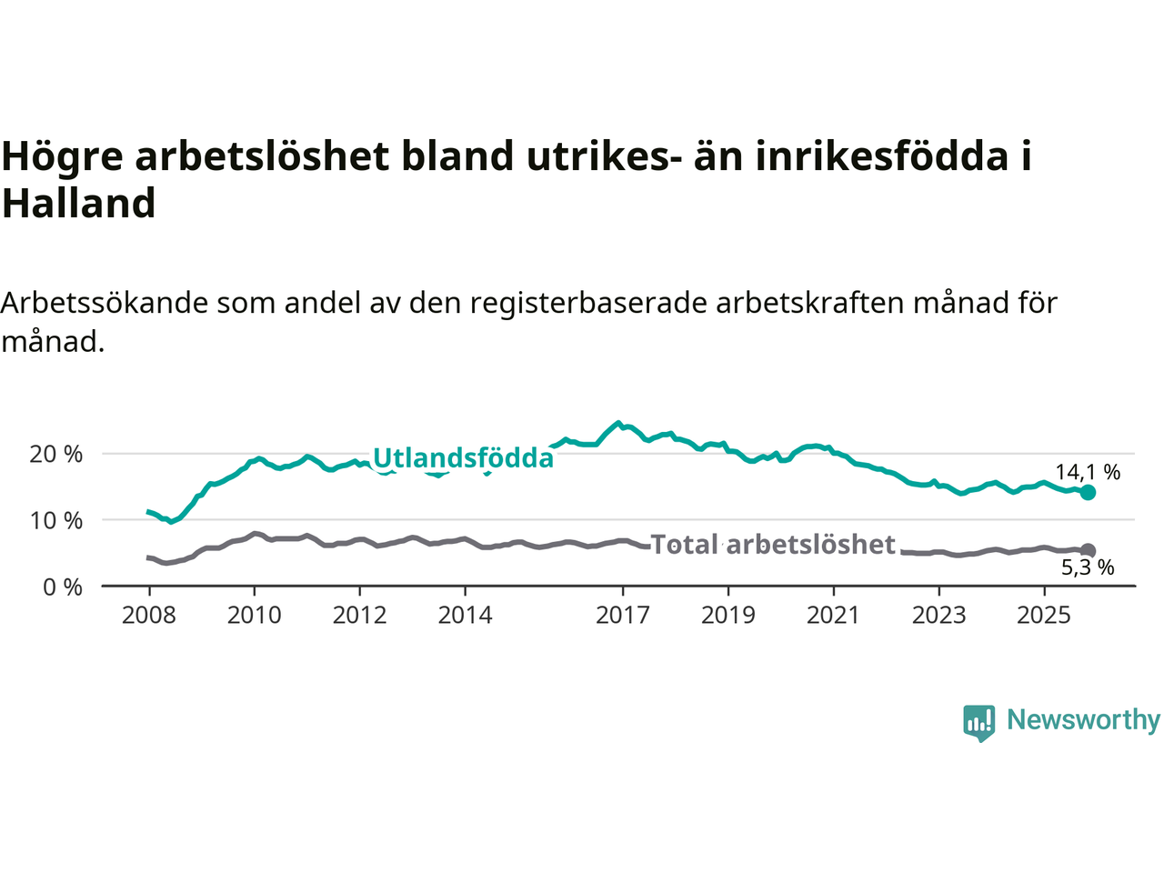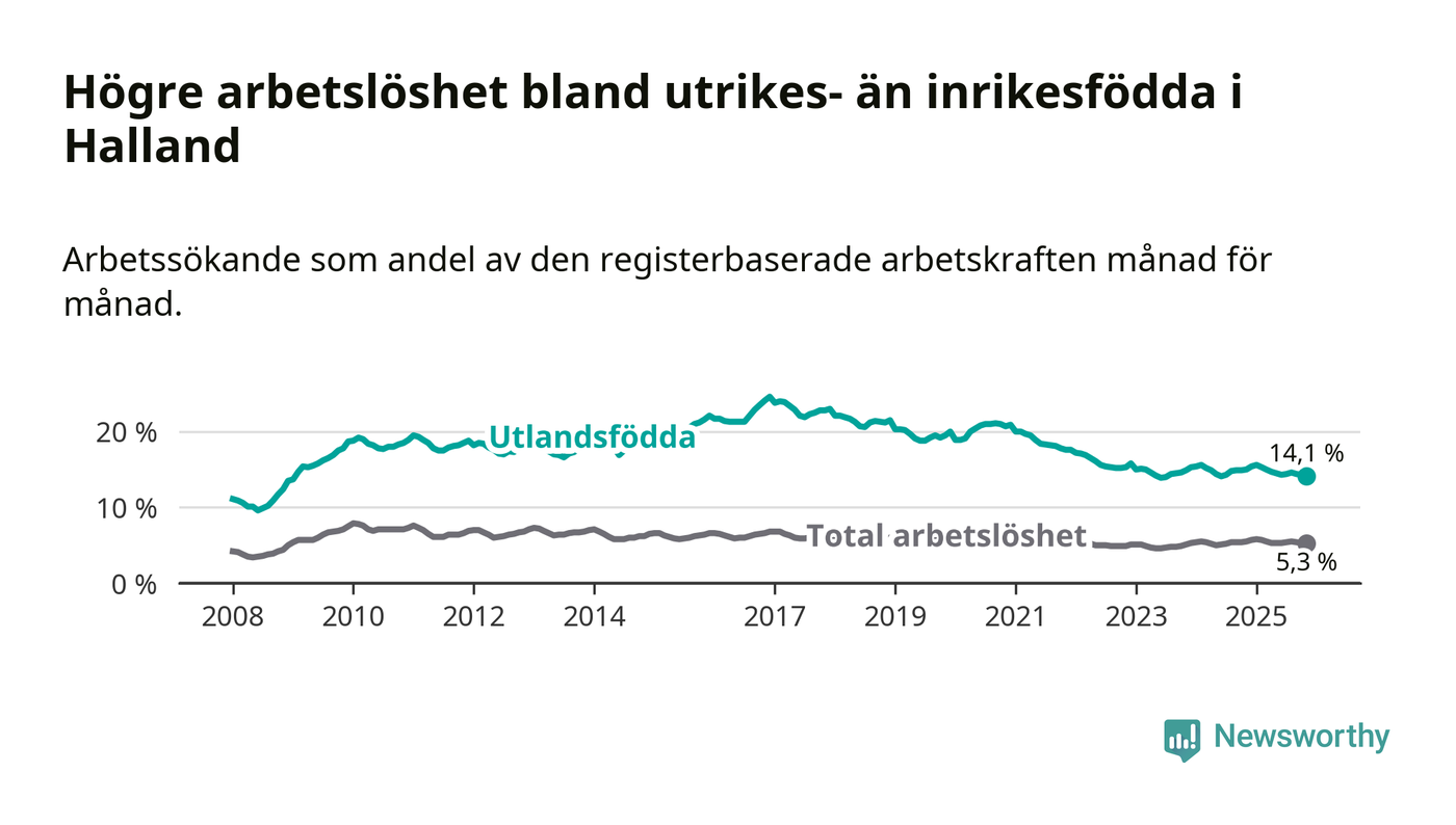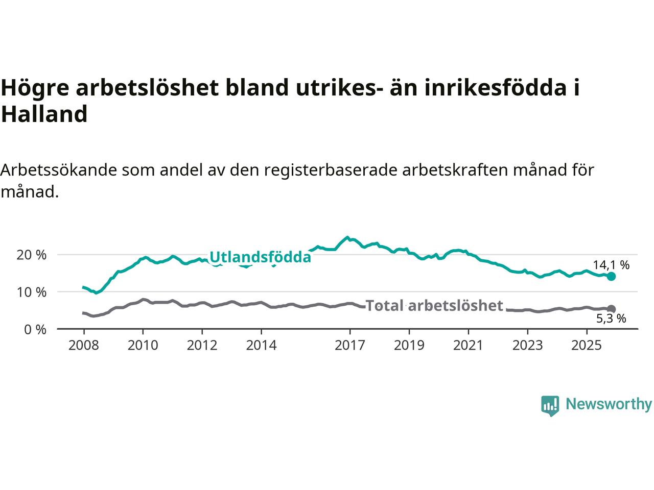 Arbetslösheten bland utlandsfödda var 14,1 procent i Halland under november månad, motsvarande 4 301 av 30 504 personer. Det är 0,9 procentenheter färre än vid samma tidpunkt i fjol (−263 om man räknar personer).
