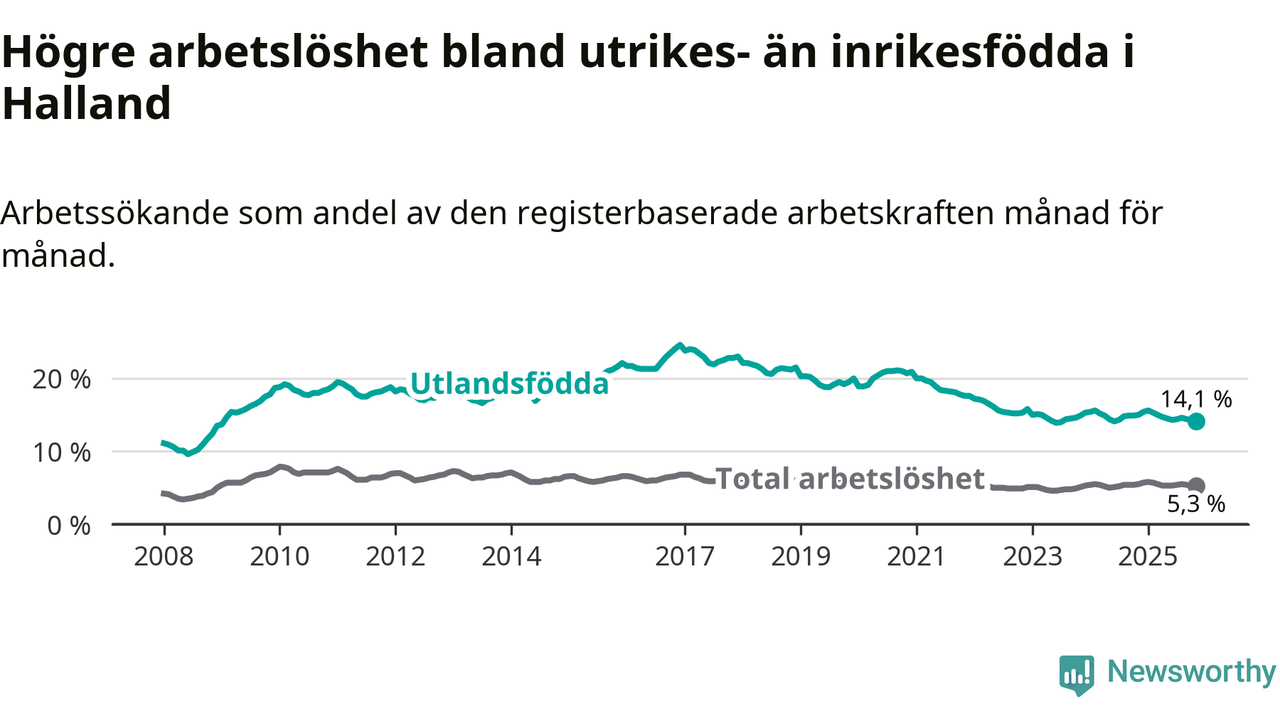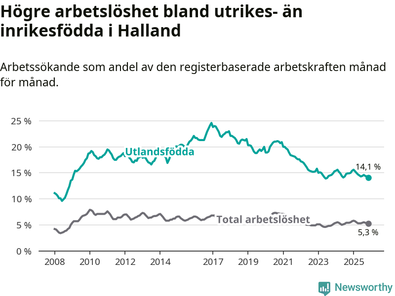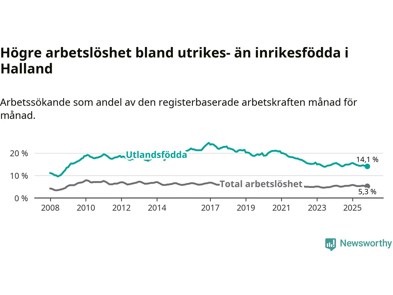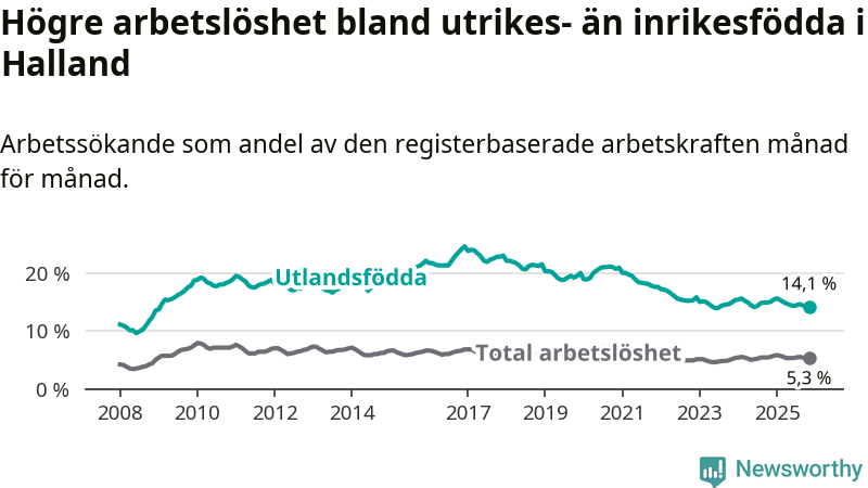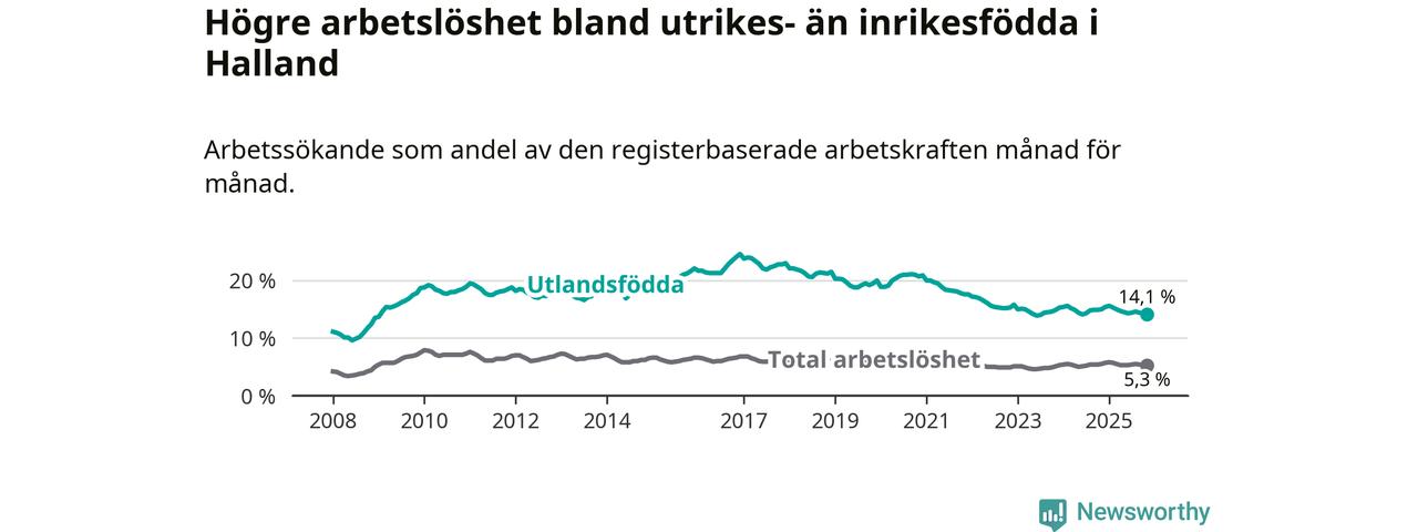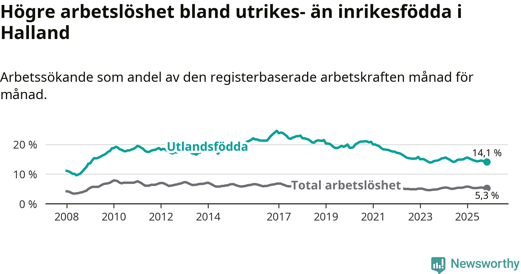 Arbetslösheten bland utlandsfödda var 14,1 procent i Halland under november månad, motsvarande 4 301 av 30 504 personer. Det är 0,9 procentenheter färre än vid samma tidpunkt i fjol (−263 om man räknar personer).