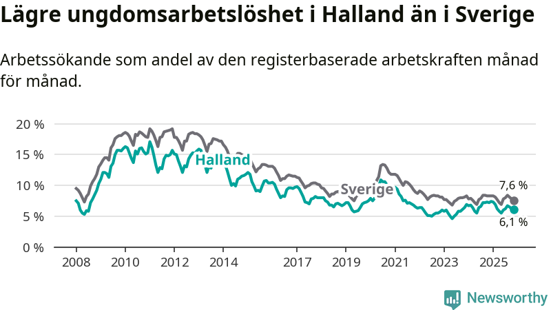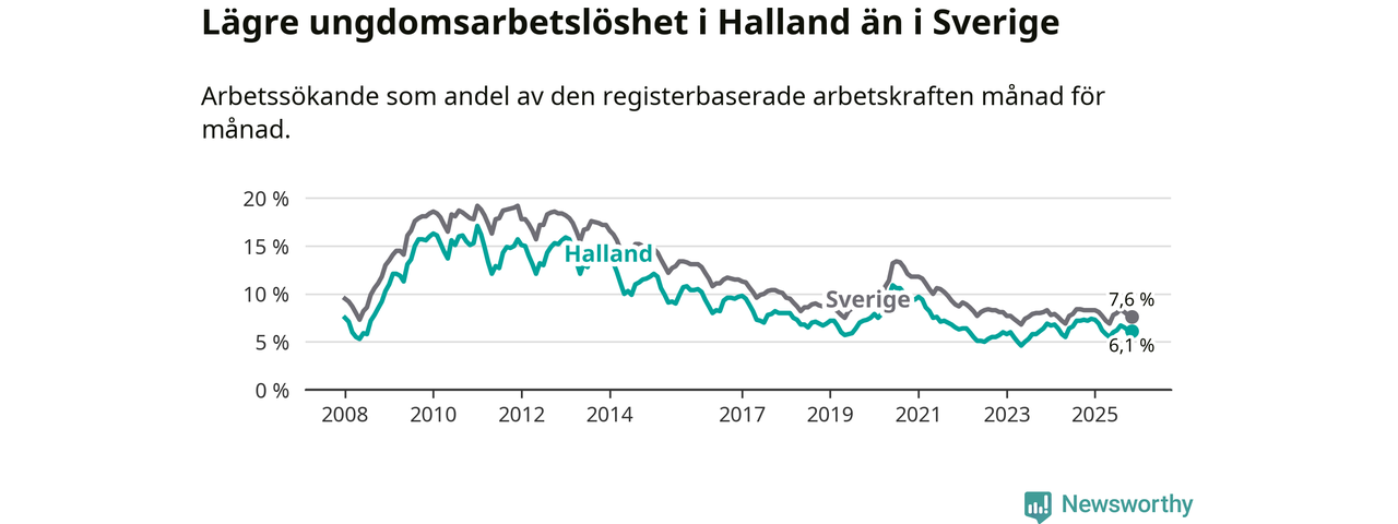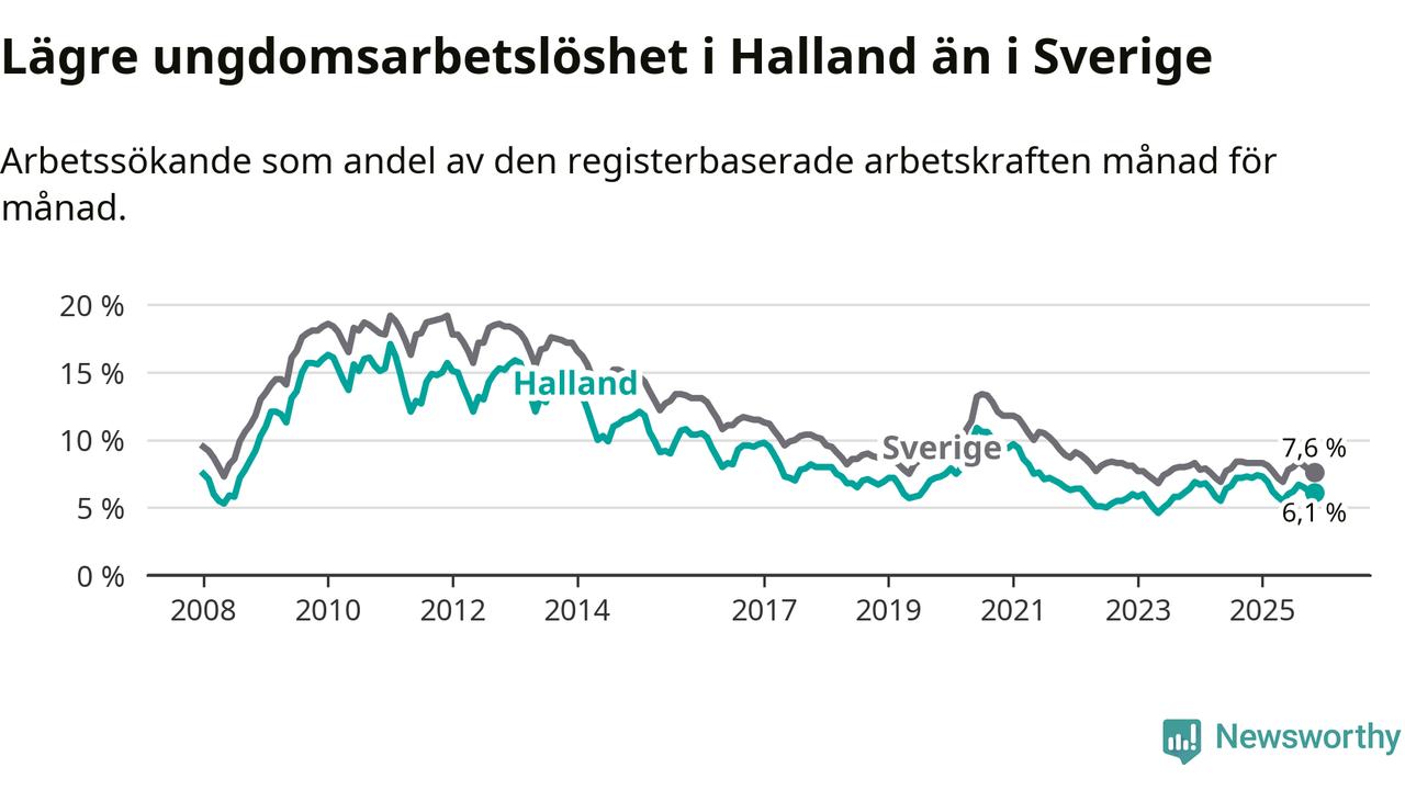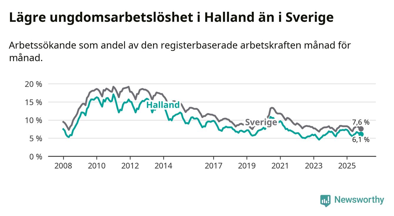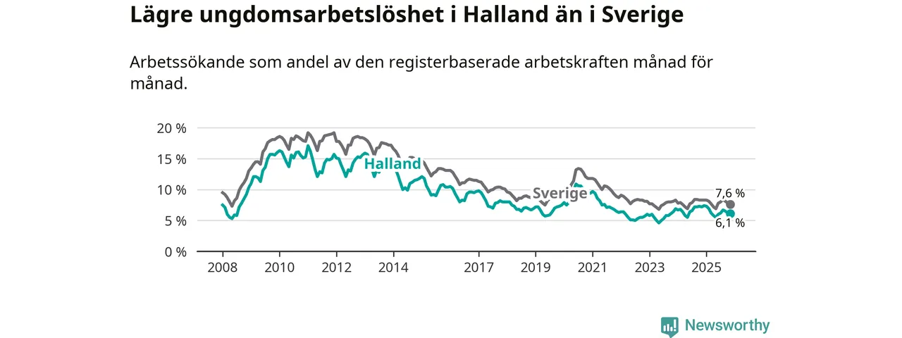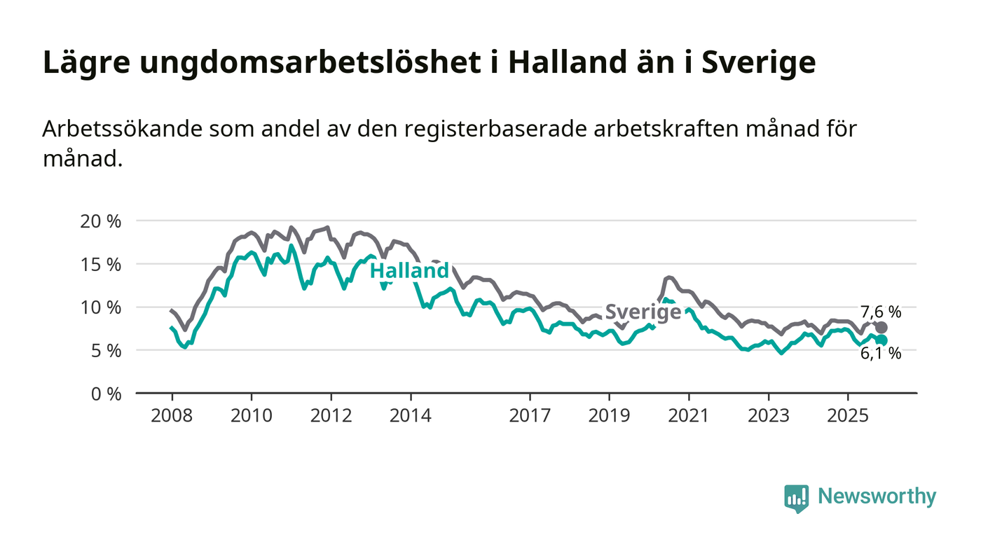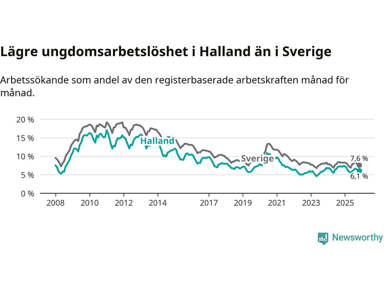 Precis som den totala arbetslösheten ligger ungdomsarbetslösheten i Halland lägre än i Sverige som helhet. Skillnaden mellan länet och riket är 1,5 procentenheter.