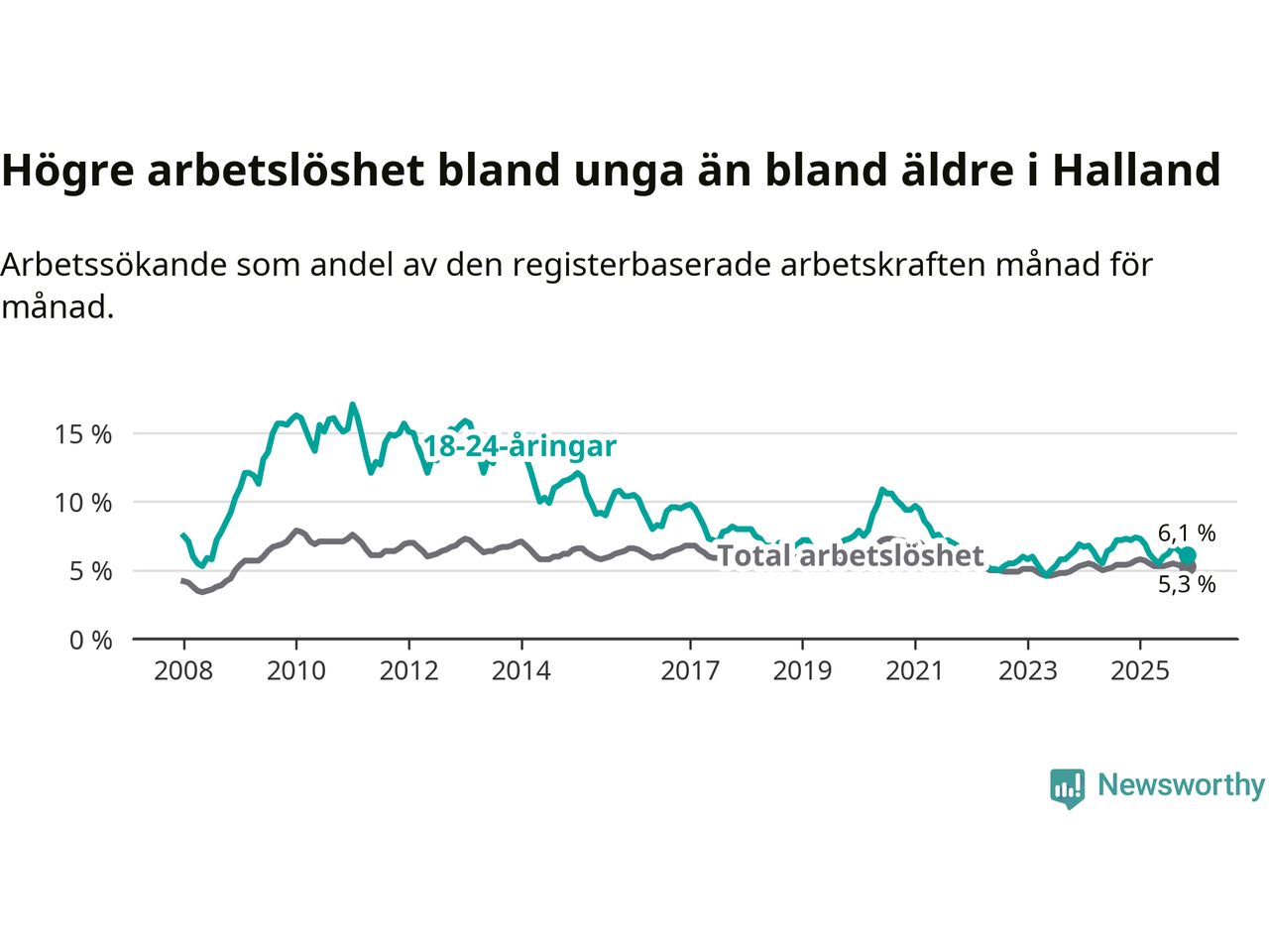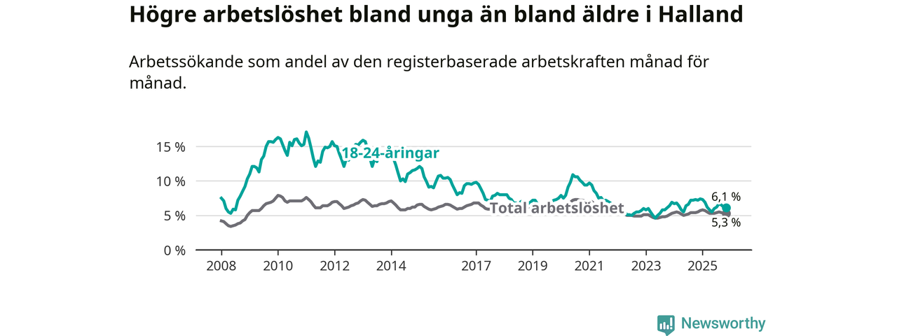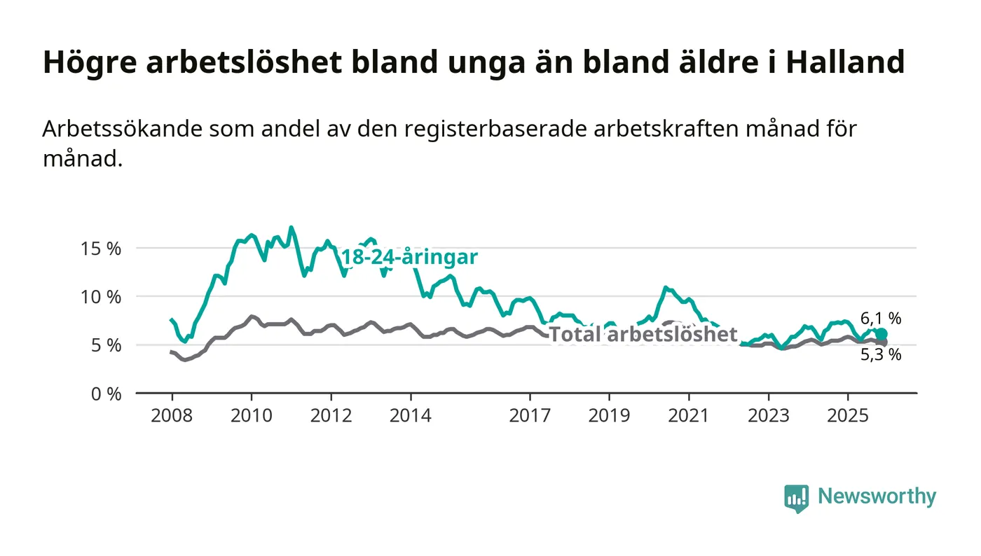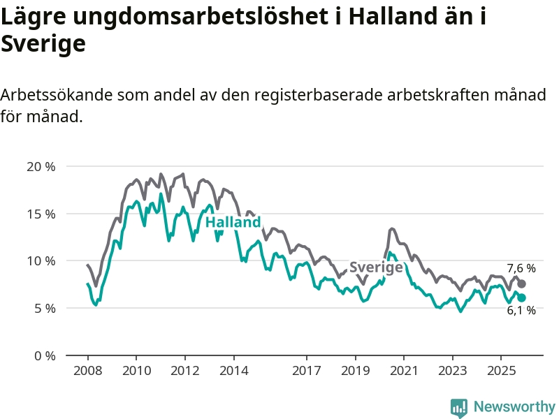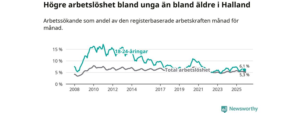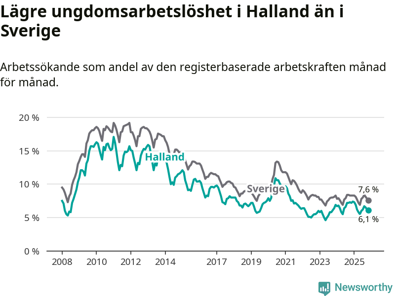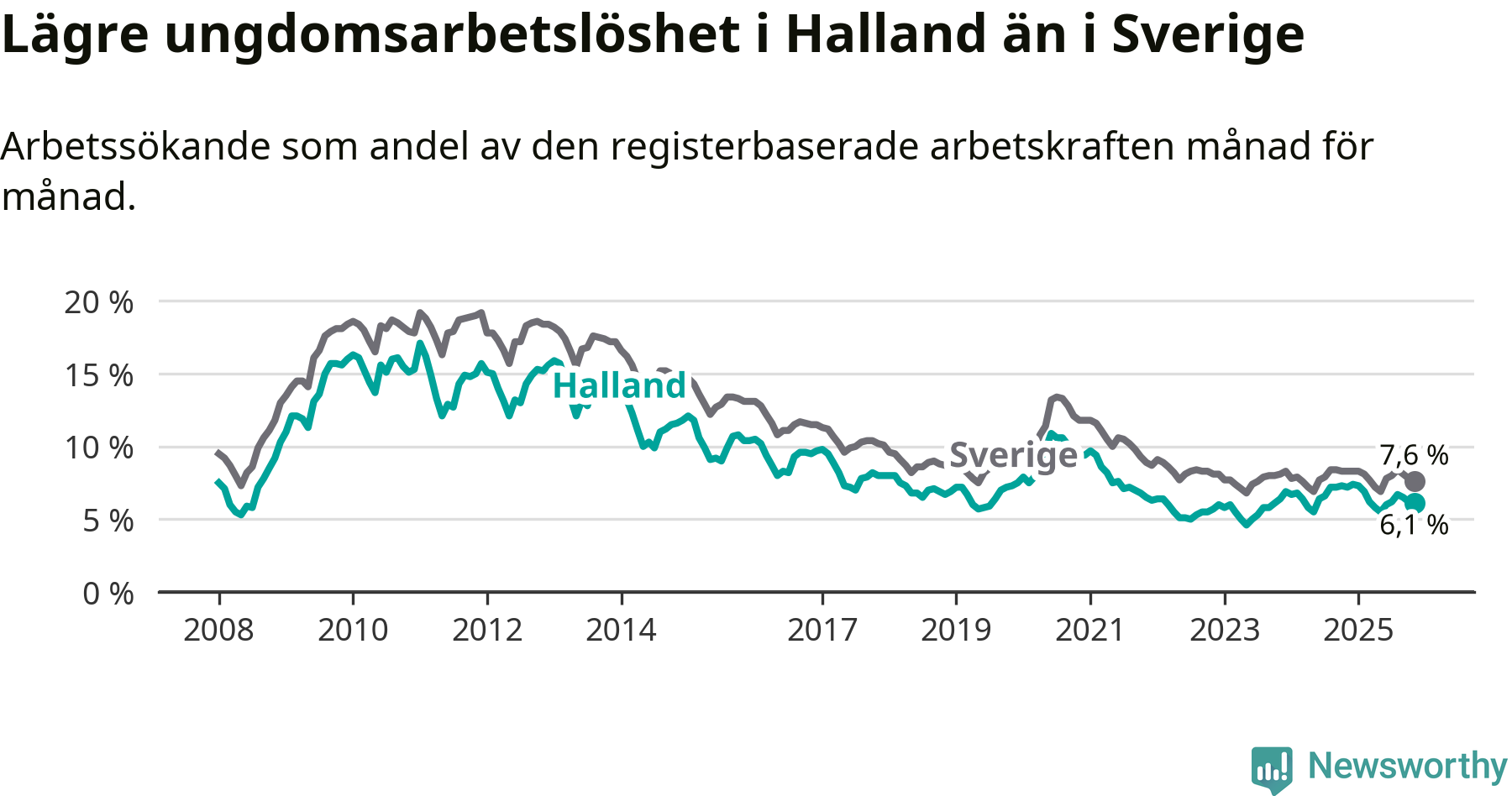 Precis som den totala arbetslösheten ligger ungdomsarbetslösheten i Halland lägre än i Sverige som helhet. Skillnaden mellan länet och riket är 1,5 procentenheter.