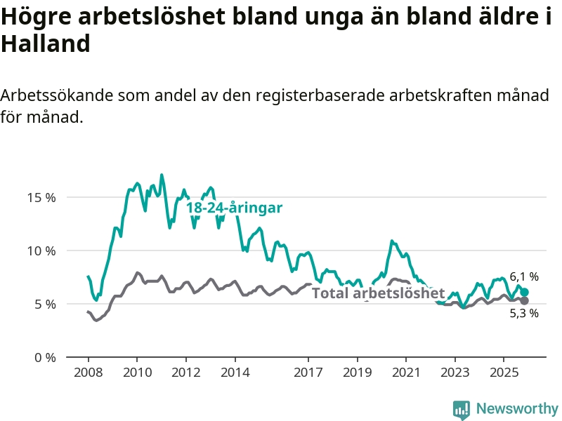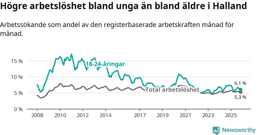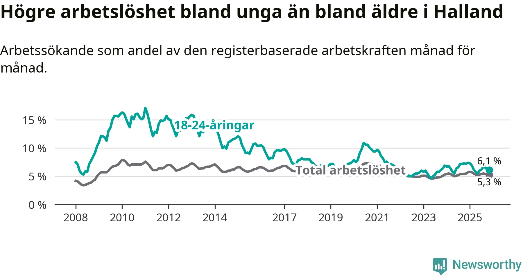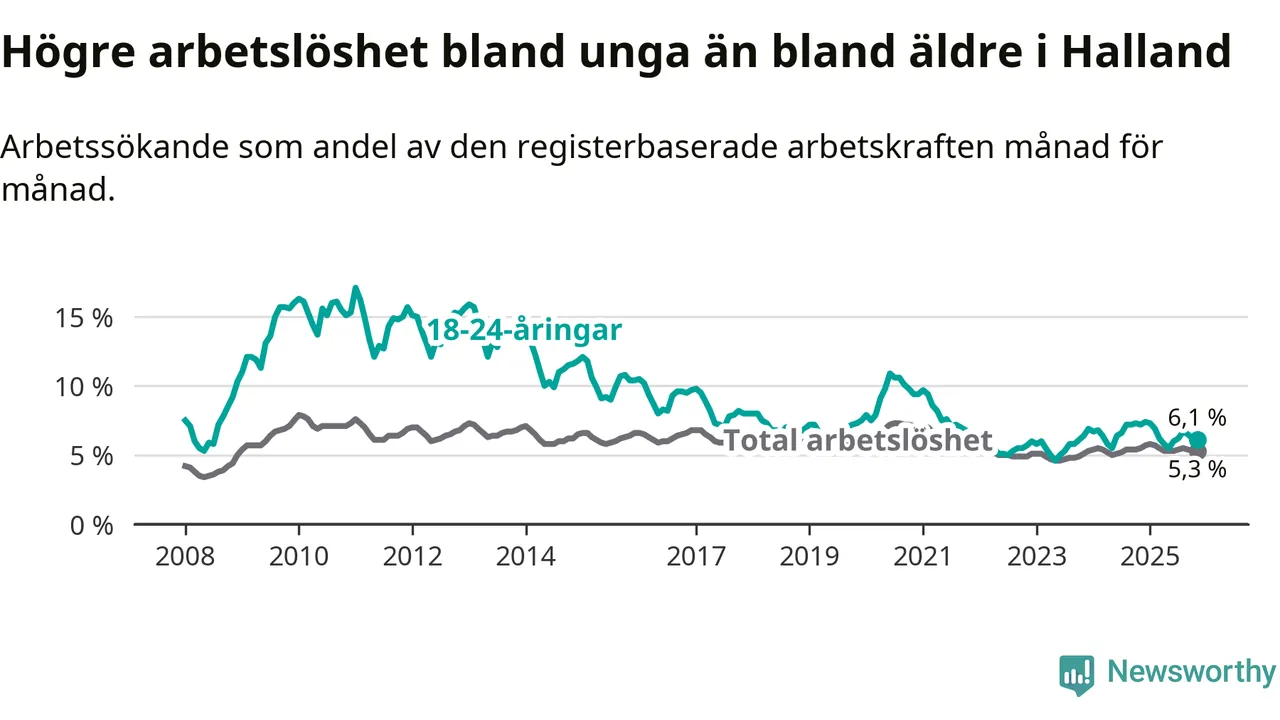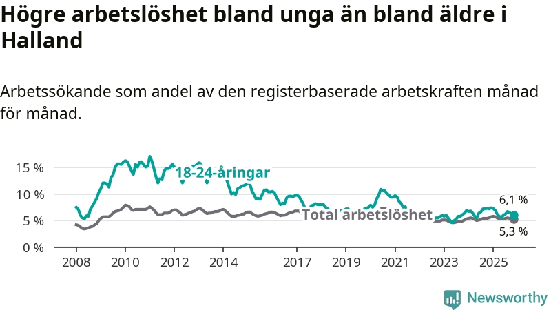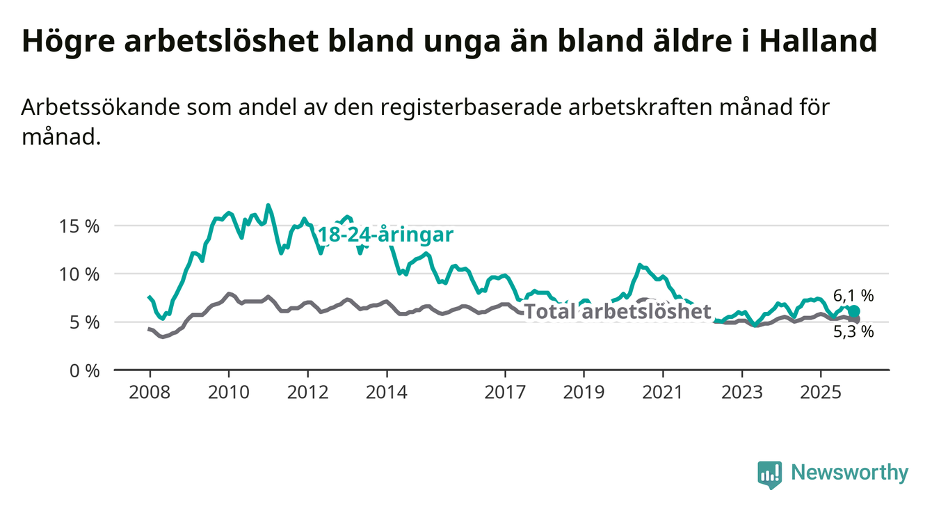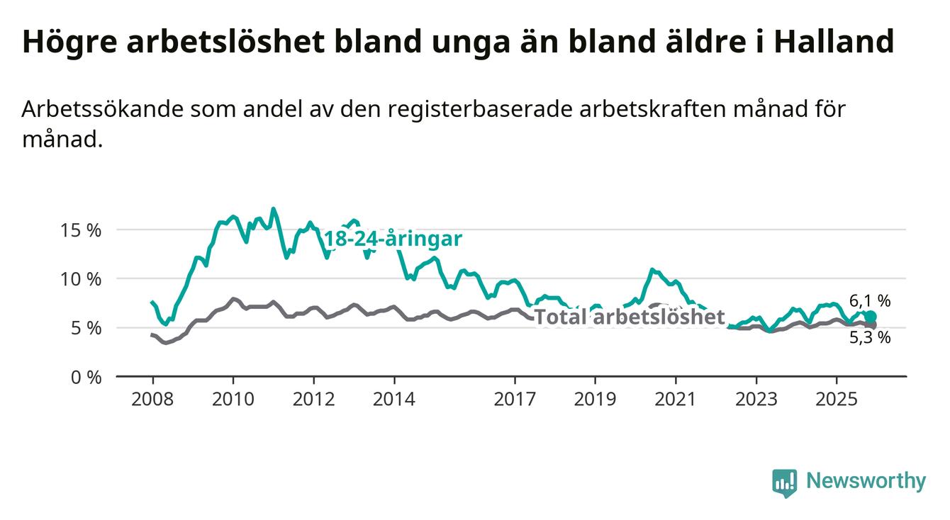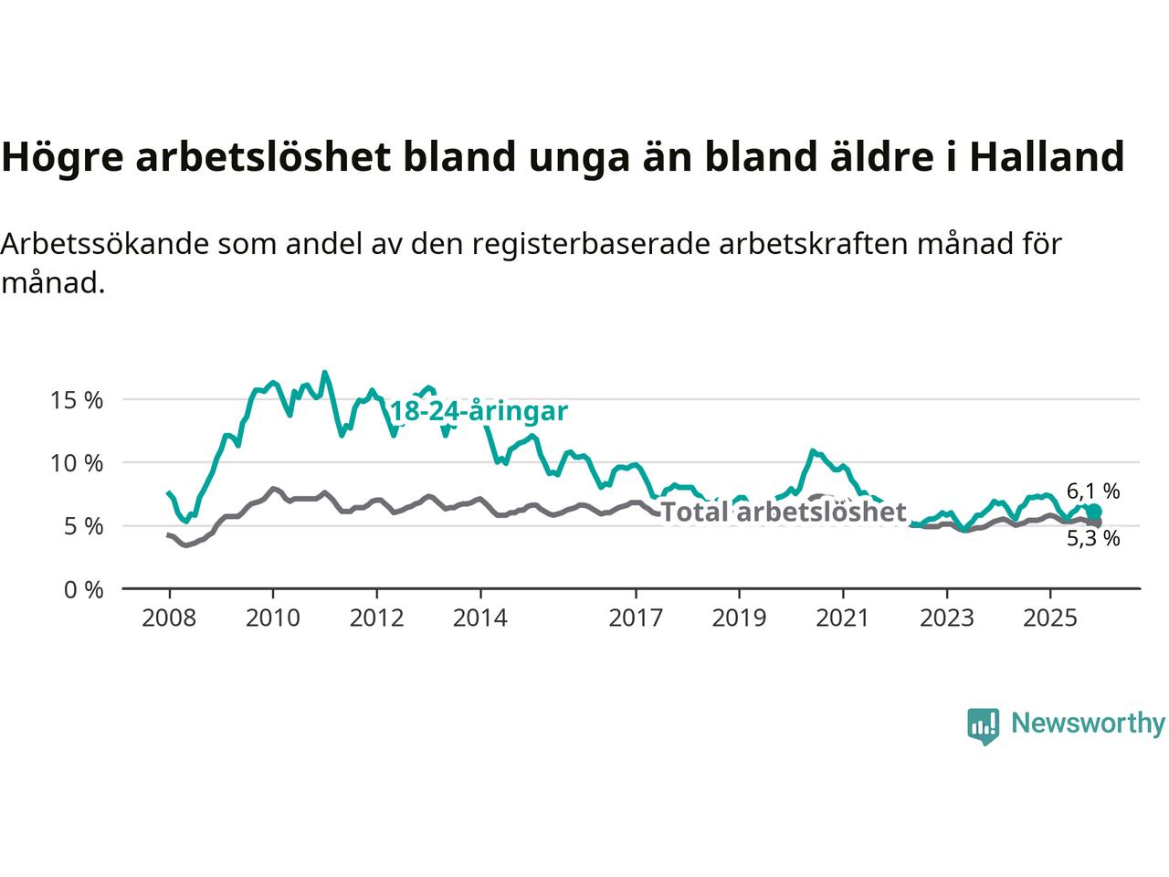 Precis som den totala arbetslösheten ligger ungdomsarbetslösheten i Halland lägre än i Sverige som helhet. Skillnaden mellan länet och riket är 1,5 procentenheter.