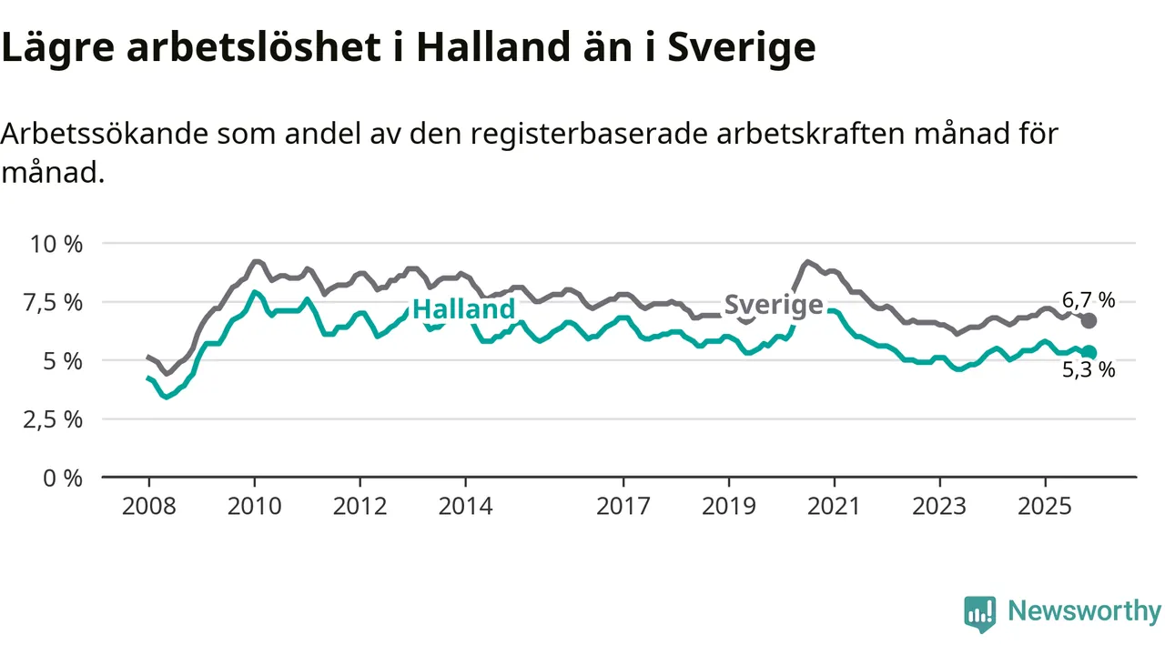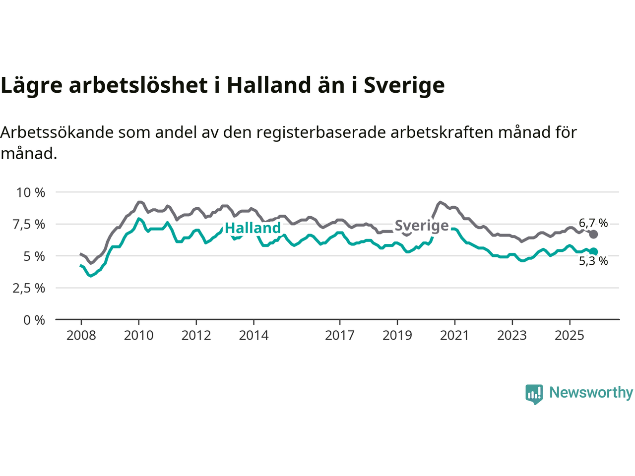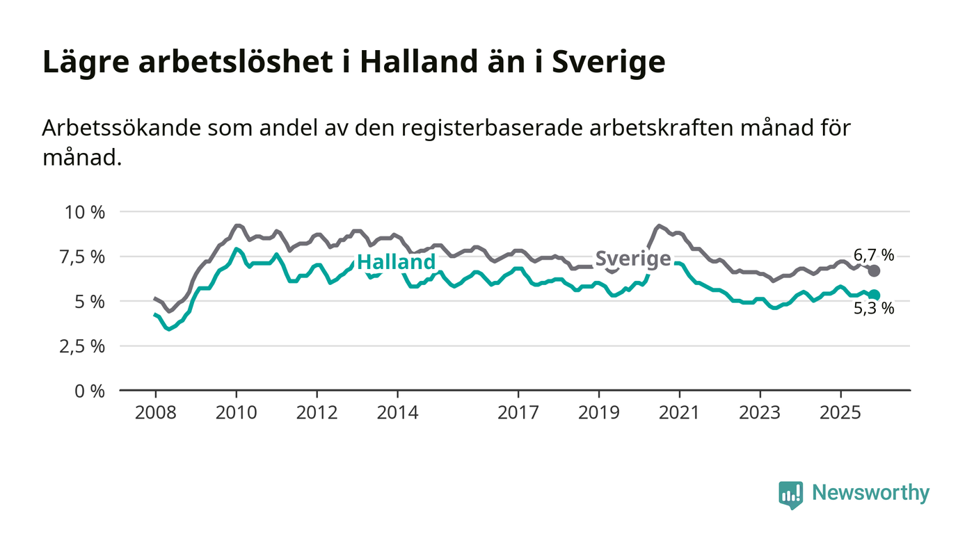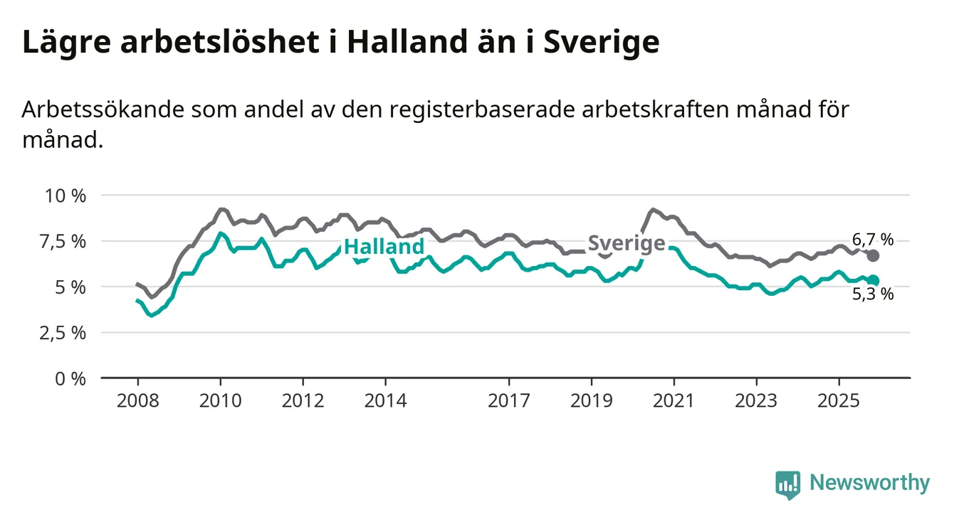 Halland hade redan tidigare lägre arbetslöshet än snittet i hela Sverige och nu växer klyftan (5,3 procent i länet, jämfört med 6,7 procent i hela riket). Norrbotten har den lägsta arbetslösheten i riket (3,8 procent), medan Skåne har den högsta (8,8 procent). För att Halland skulle komma ner i samma arbetslöshetsnivå som Norrbotten skulle 2 536 personer behöva sysselsättas.