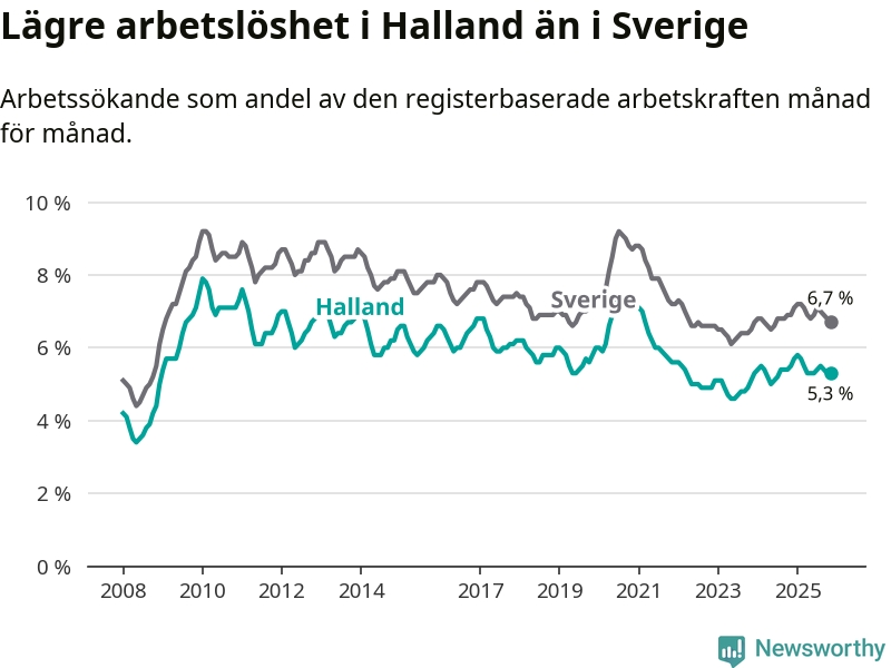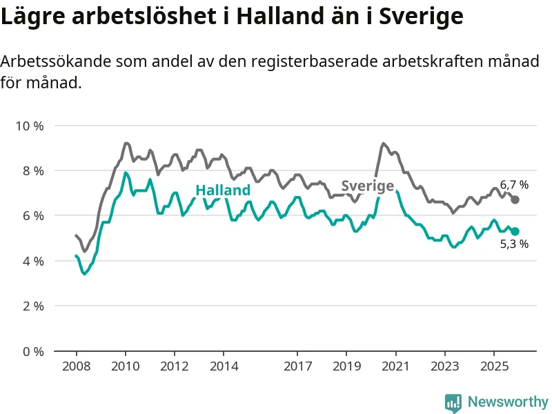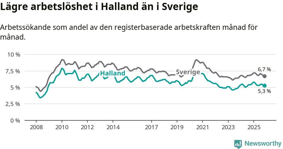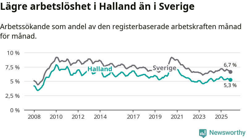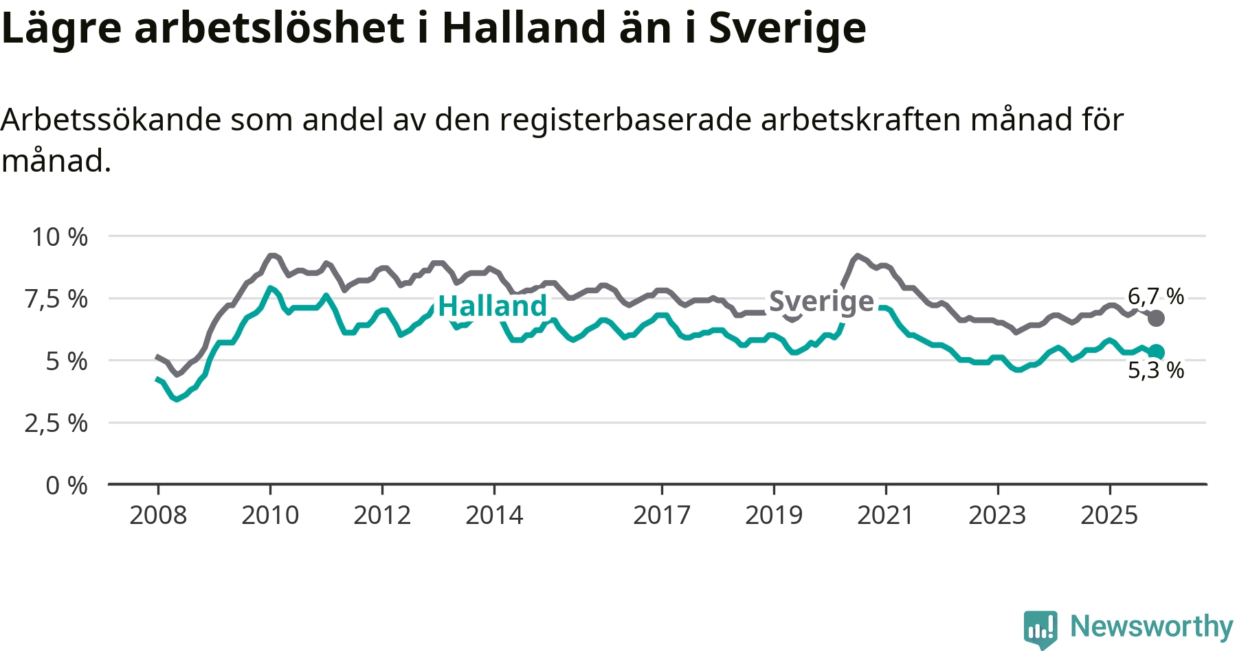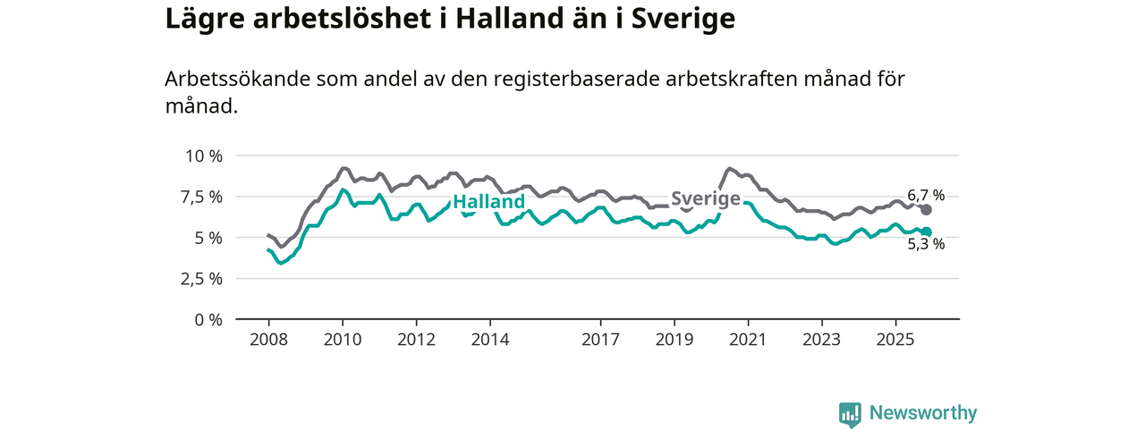 Halland hade redan tidigare lägre arbetslöshet än snittet i hela Sverige och nu växer klyftan (5,3 procent i länet, jämfört med 6,7 procent i hela riket). Norrbotten har den lägsta arbetslösheten i riket (3,8 procent), medan Skåne har den högsta (8,8 procent). För att Halland skulle komma ner i samma arbetslöshetsnivå som Norrbotten skulle 2 536 personer behöva sysselsättas.