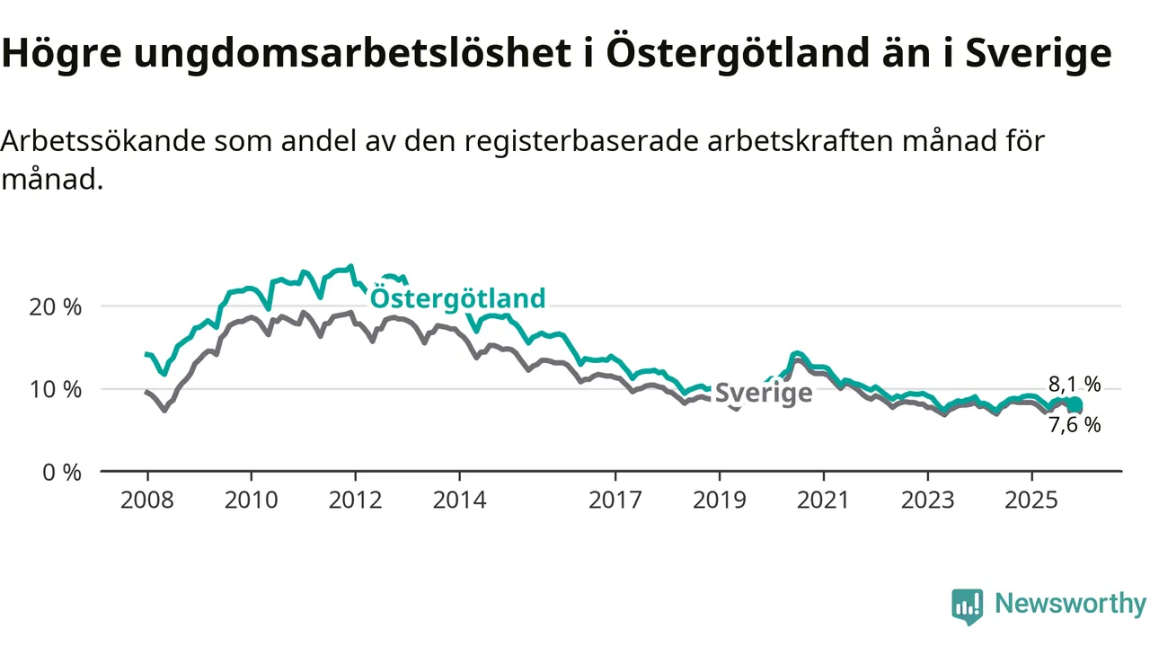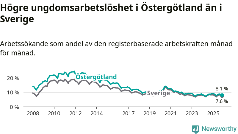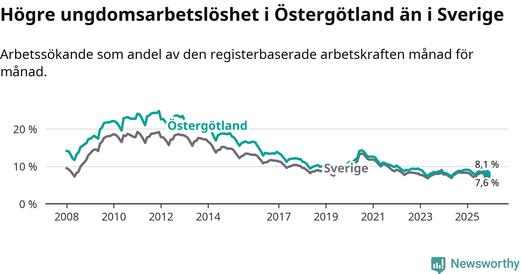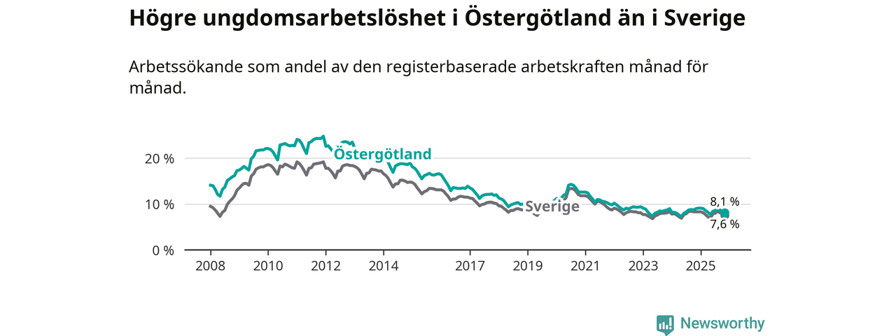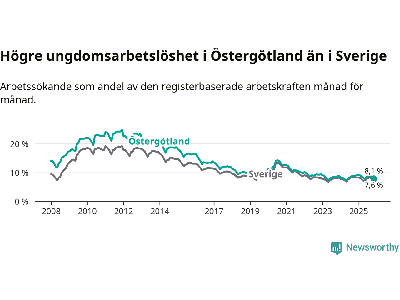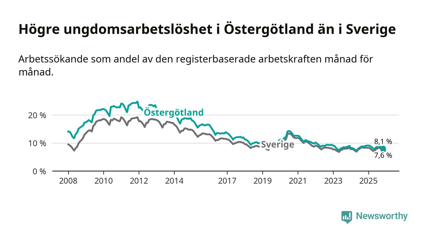Precis som den totala arbetslösheten ligger ungdomsarbetslösheten i Östergötland högre än i Sverige som helhet. Skillnaden mellan länet och riket är 0,5 procentenheter.