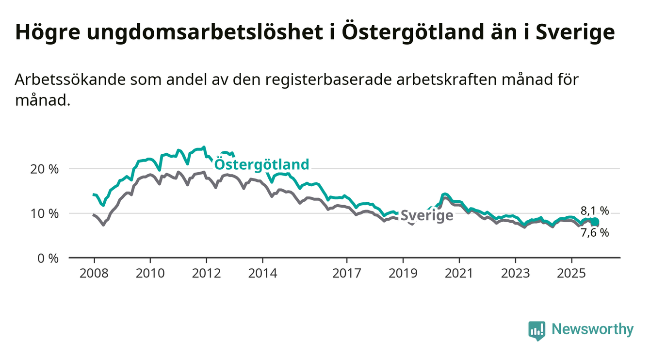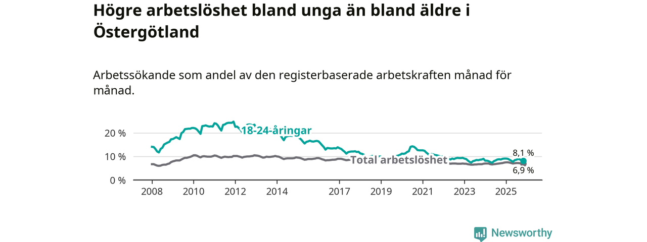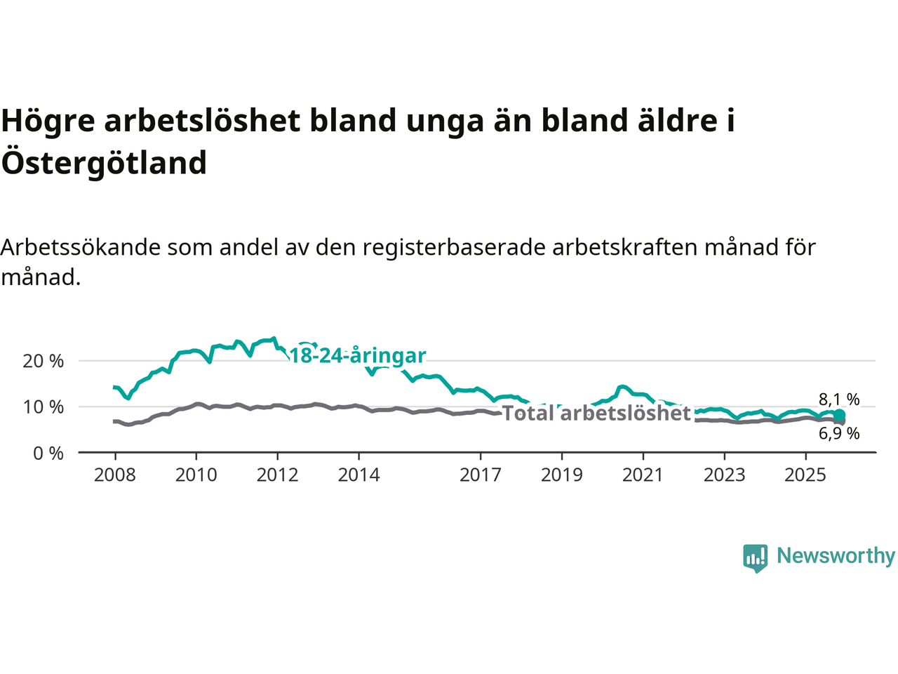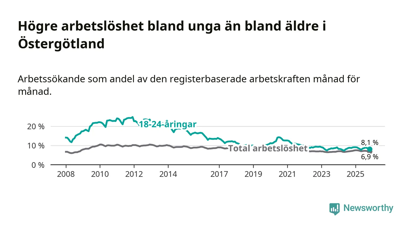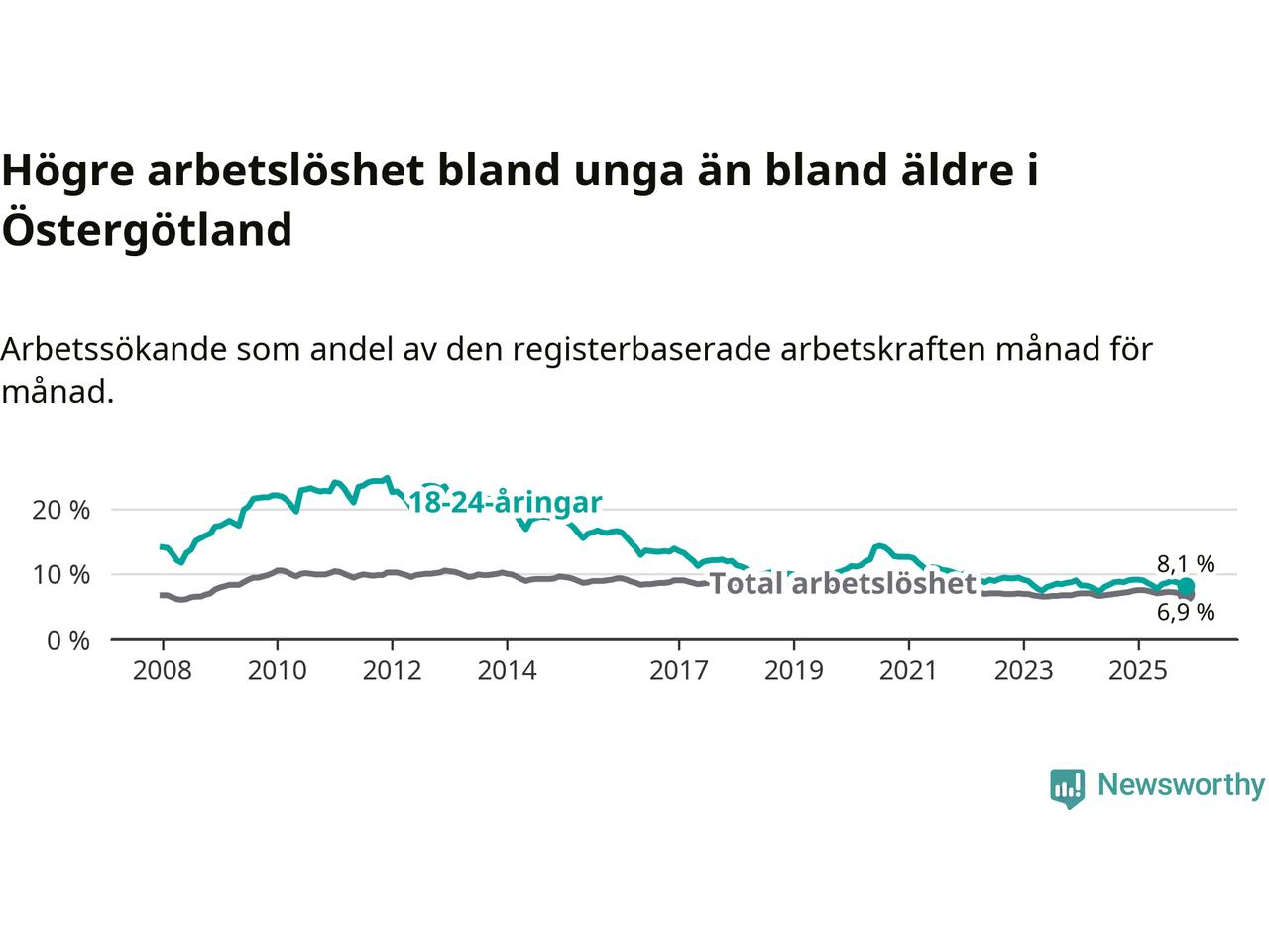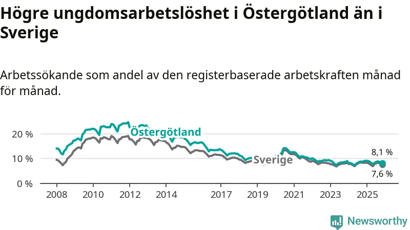 Precis som den totala arbetslösheten ligger ungdomsarbetslösheten i Östergötland högre än i Sverige som helhet. Skillnaden mellan länet och riket är 0,5 procentenheter.