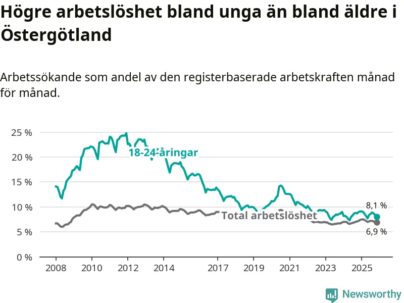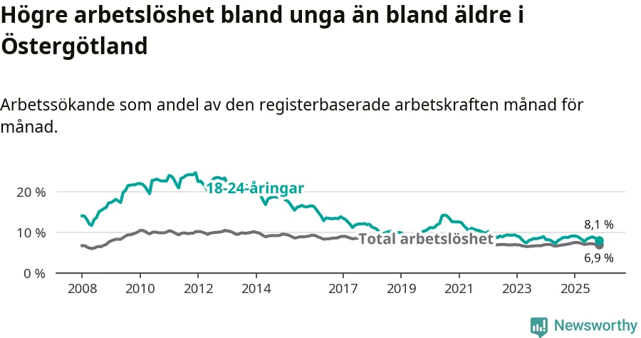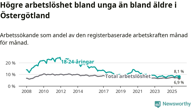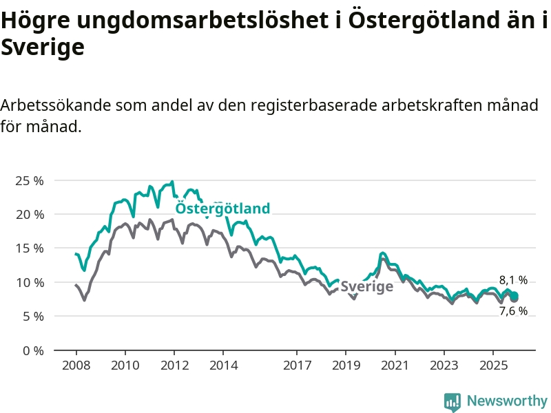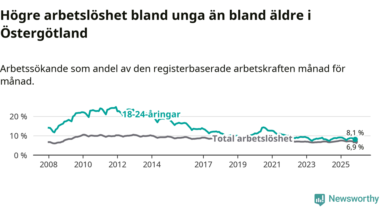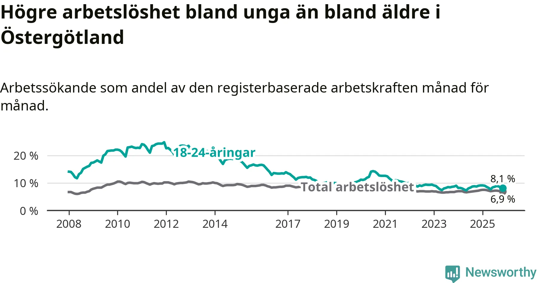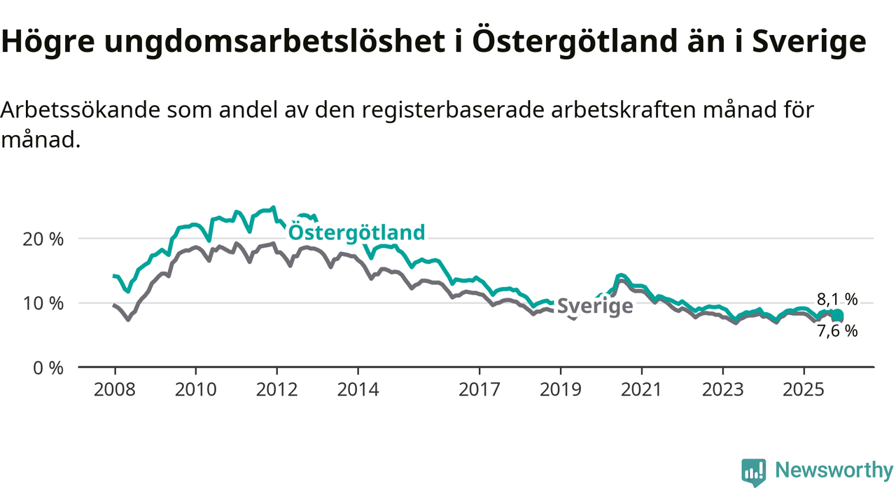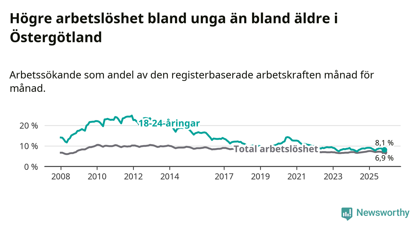 Precis som den totala arbetslösheten ligger ungdomsarbetslösheten i Östergötland högre än i Sverige som helhet. Skillnaden mellan länet och riket är 0,5 procentenheter.