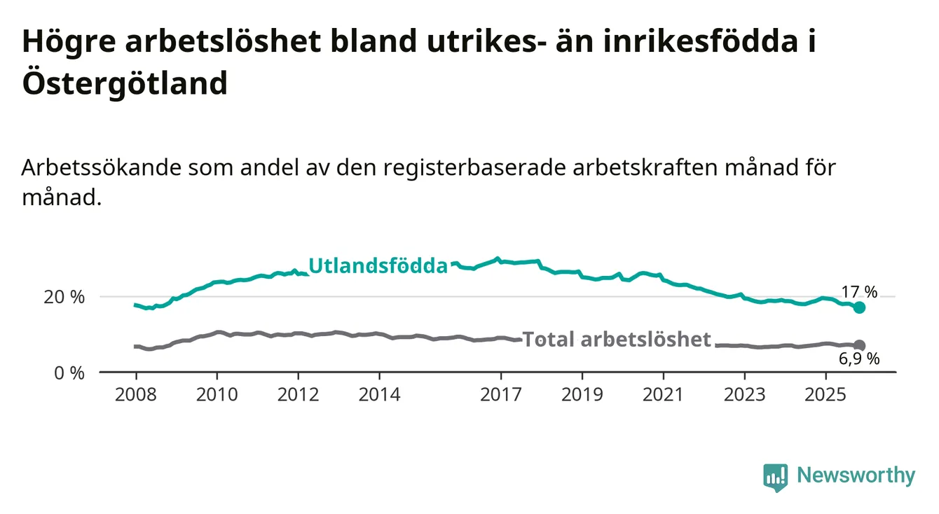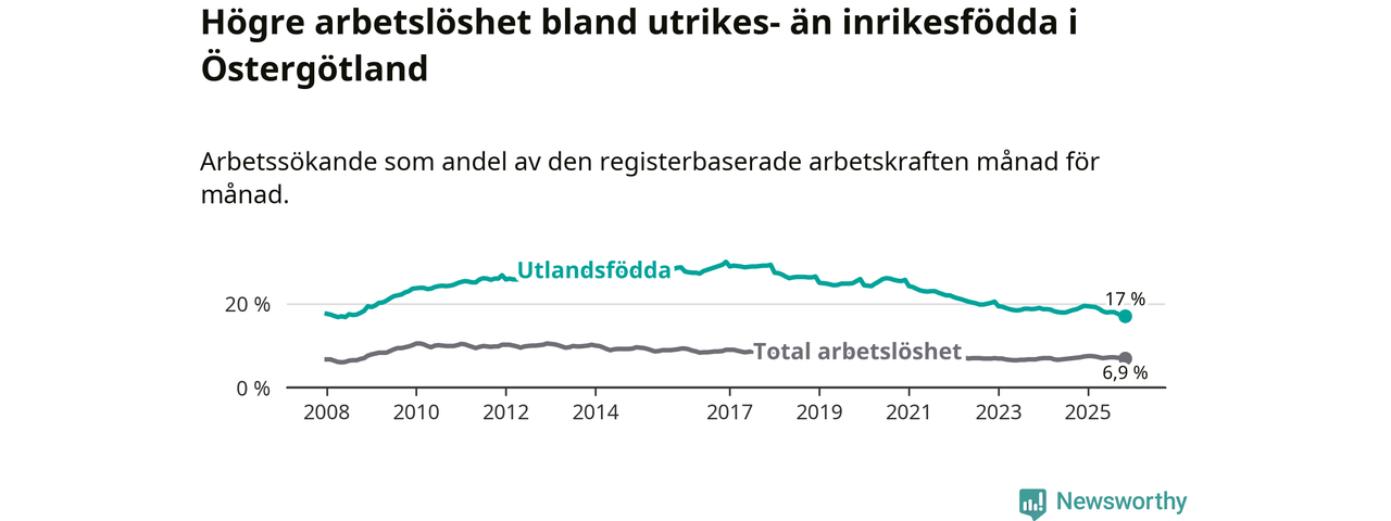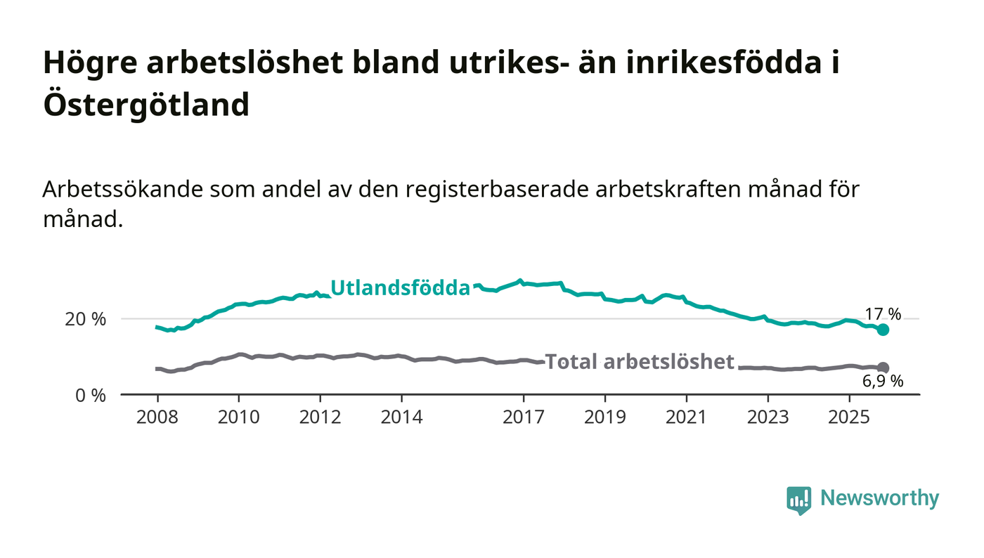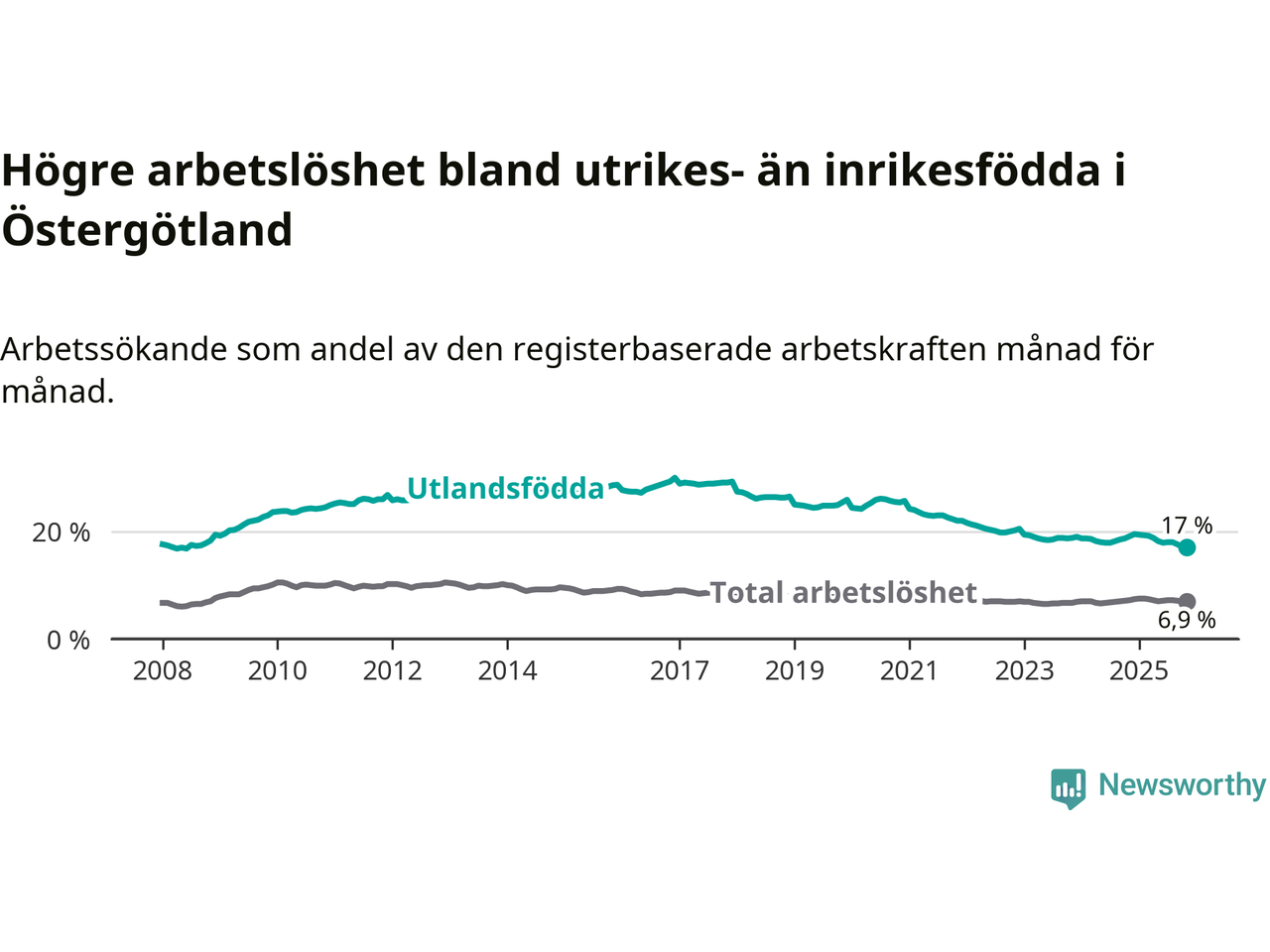 Arbetslösheten bland utlandsfödda var 17,0 procent i Östergötland under november månad, motsvarande 8 401 av 49 418 personer. Det är 2,1 procentenheter färre än vid samma tidpunkt i fjol (−949 om man räknar personer). Den nuvarande arbetslöshetsnivån är den lägsta sedan juni 2008.