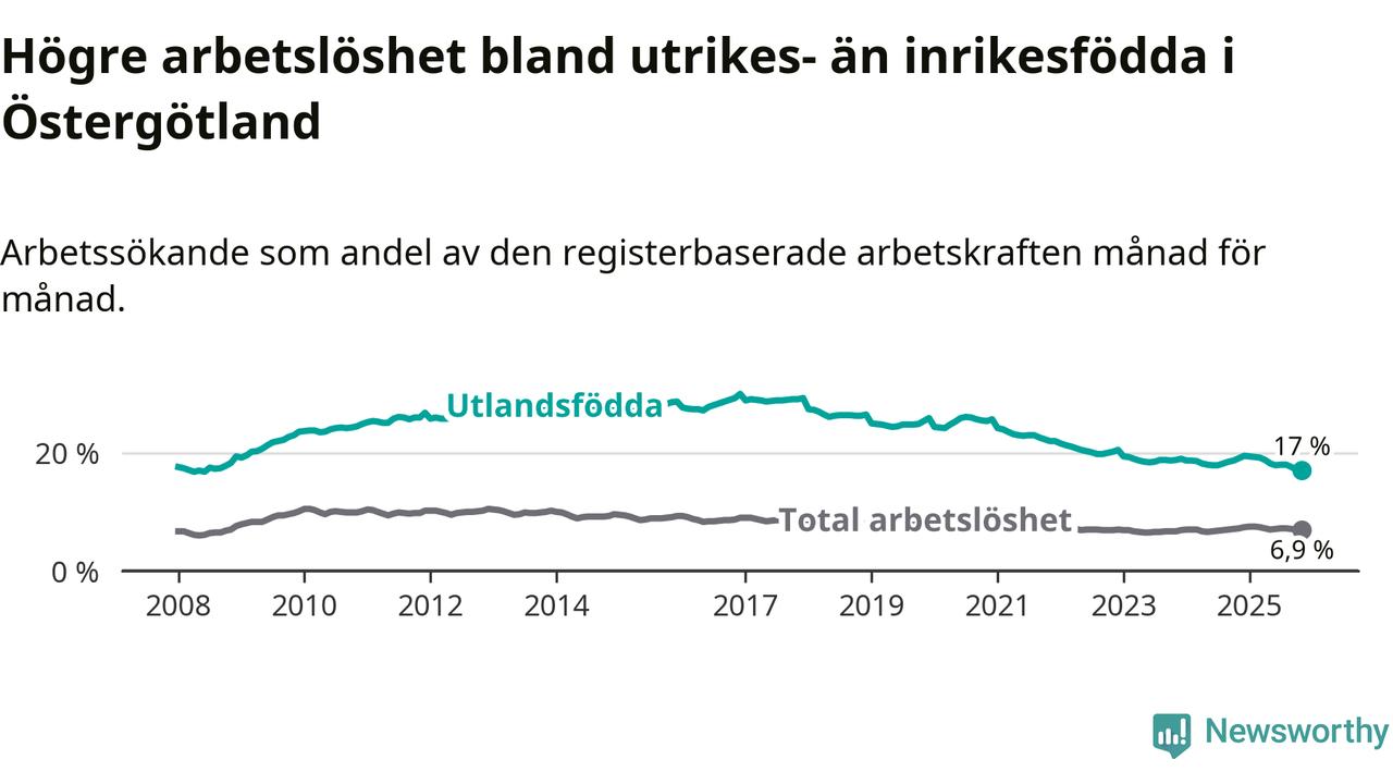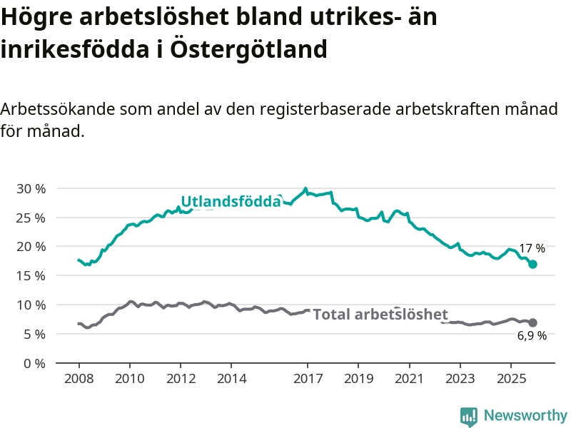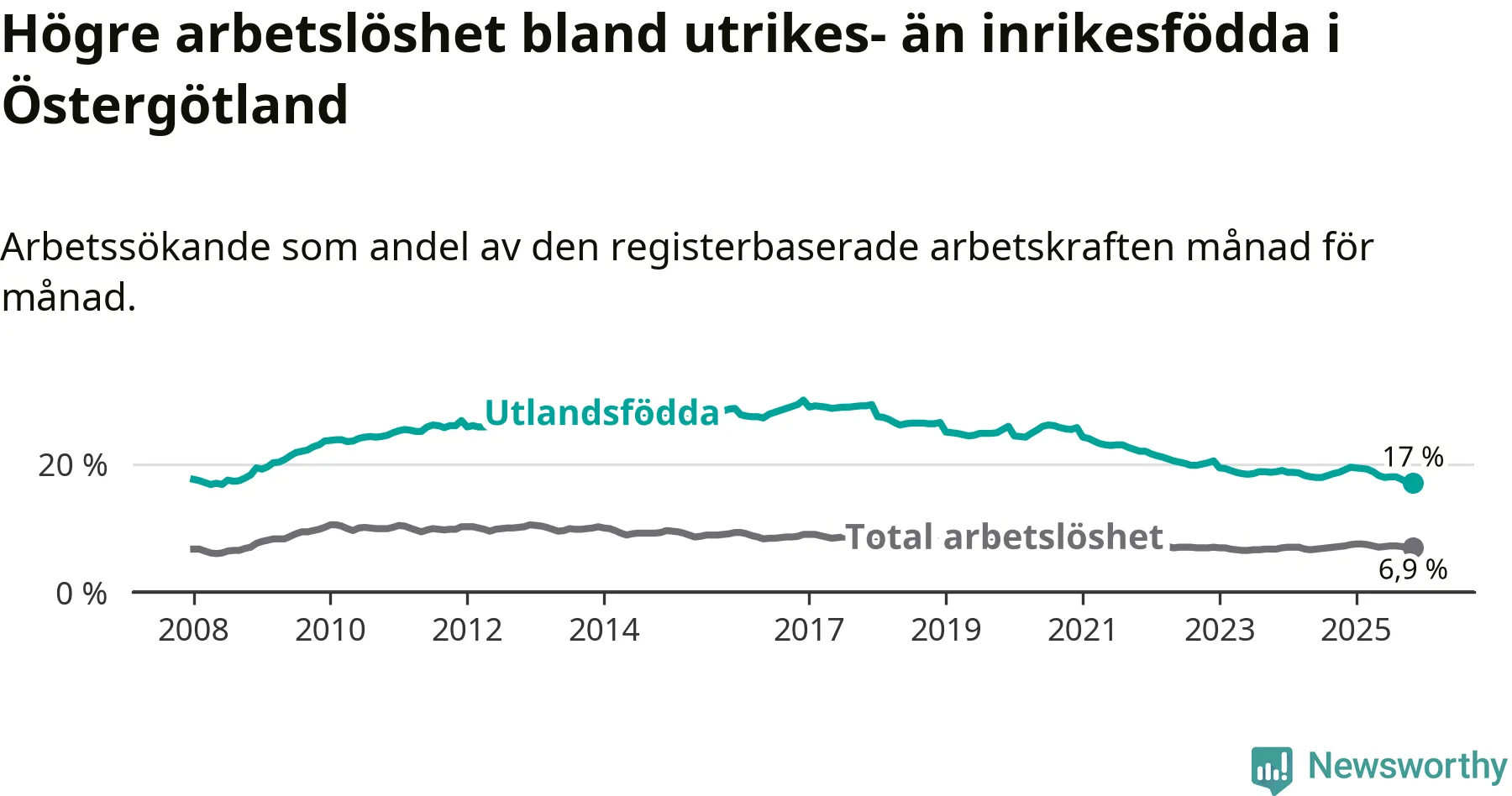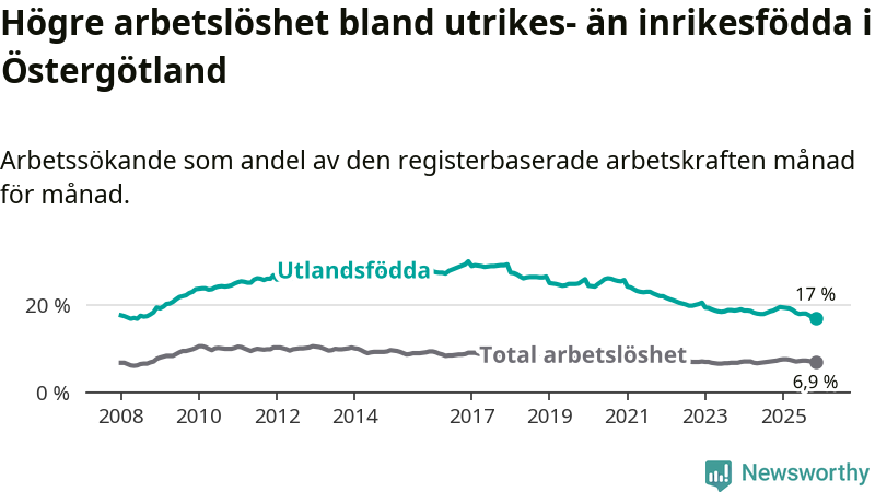 Arbetslösheten bland utlandsfödda var 17,0 procent i Östergötland under november månad, motsvarande 8 401 av 49 418 personer. Det är 2,1 procentenheter färre än vid samma tidpunkt i fjol (−949 om man räknar personer). Den nuvarande arbetslöshetsnivån är den lägsta sedan juni 2008.