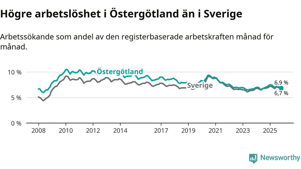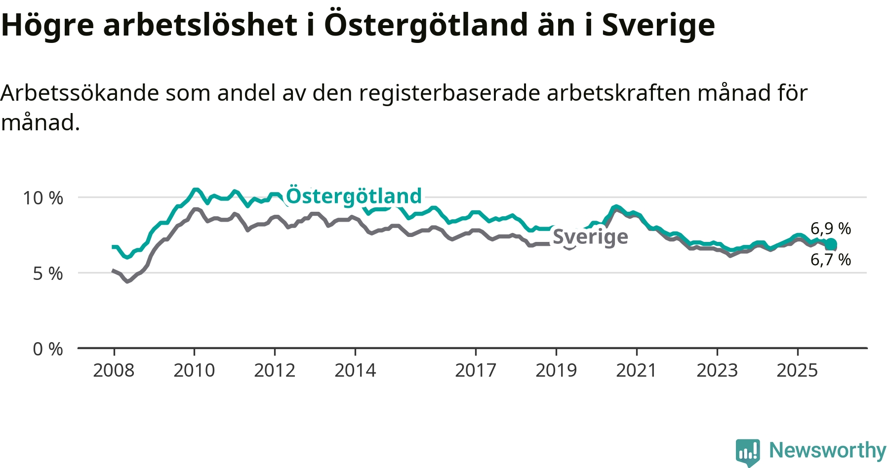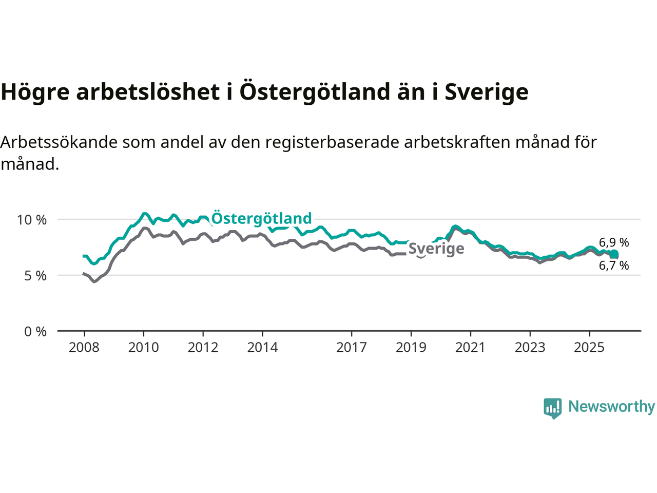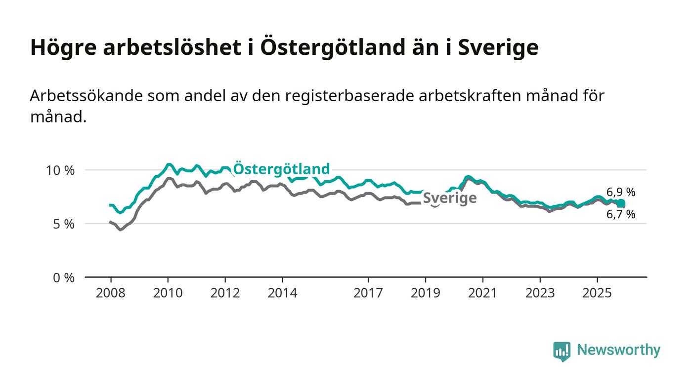 Även om arbetslösheten i Östergötland alltså minskar, så ligger den fortfarande över snittet i hela Sverige (6,9 procent i länet, jämfört med 6,7 procent i hela riket). Norrbotten har den lägsta arbetslösheten i riket (3,8 procent), medan Skåne har den högsta (8,8 procent). För att Östergötland skulle komma ner i samma arbetslöshetsnivå som Norrbotten skulle 7 303 personer behöva sysselsättas.