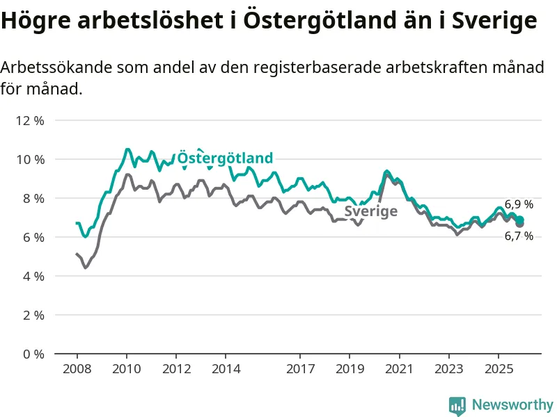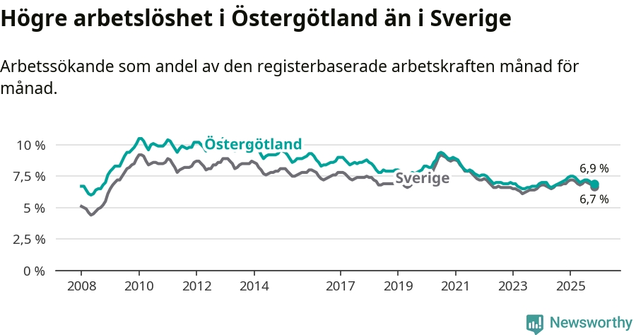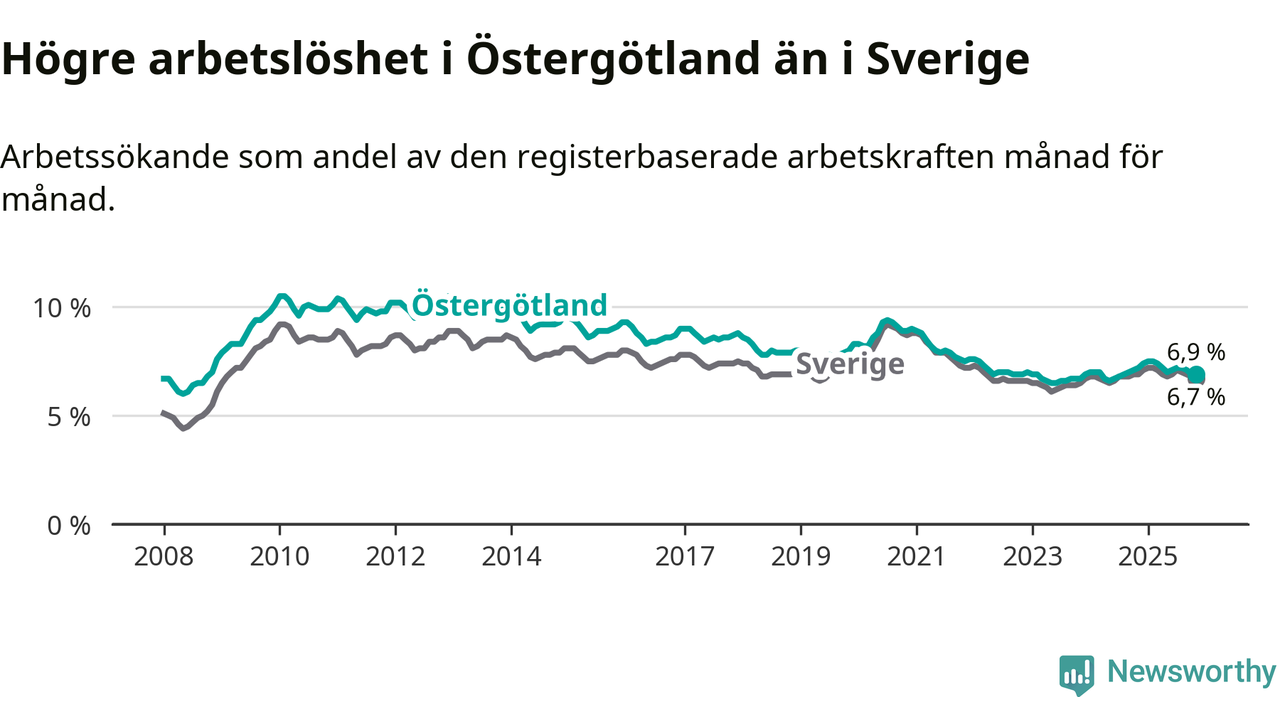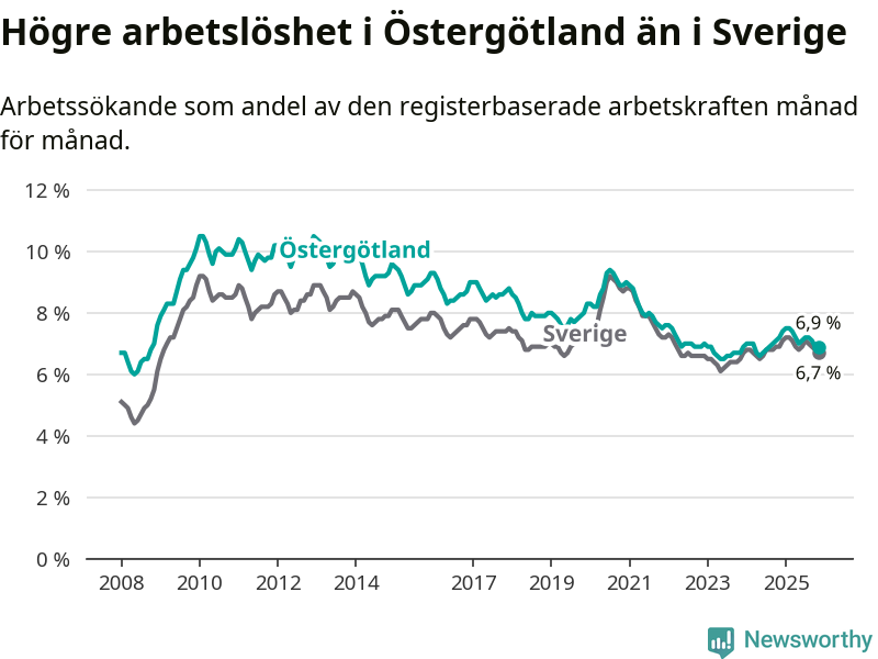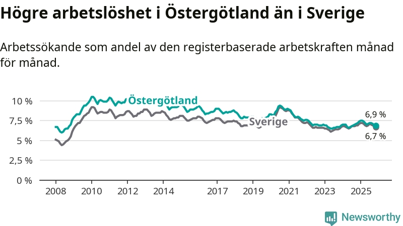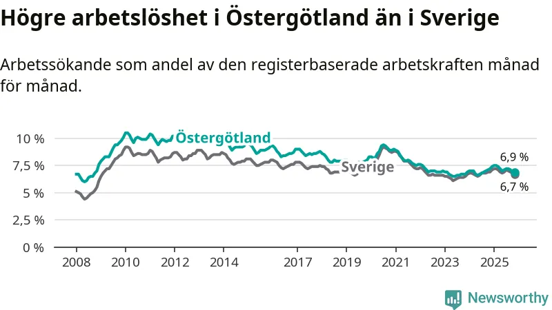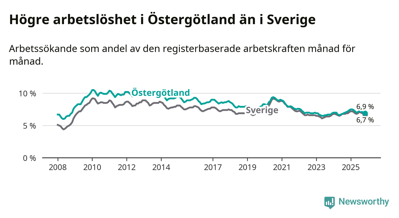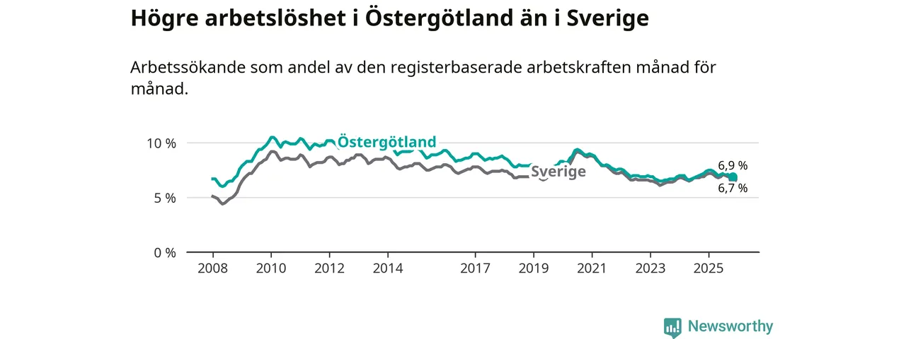 Även om arbetslösheten i Östergötland alltså minskar, så ligger den fortfarande över snittet i hela Sverige (6,9 procent i länet, jämfört med 6,7 procent i hela riket). Norrbotten har den lägsta arbetslösheten i riket (3,8 procent), medan Skåne har den högsta (8,8 procent). För att Östergötland skulle komma ner i samma arbetslöshetsnivå som Norrbotten skulle 7 303 personer behöva sysselsättas.