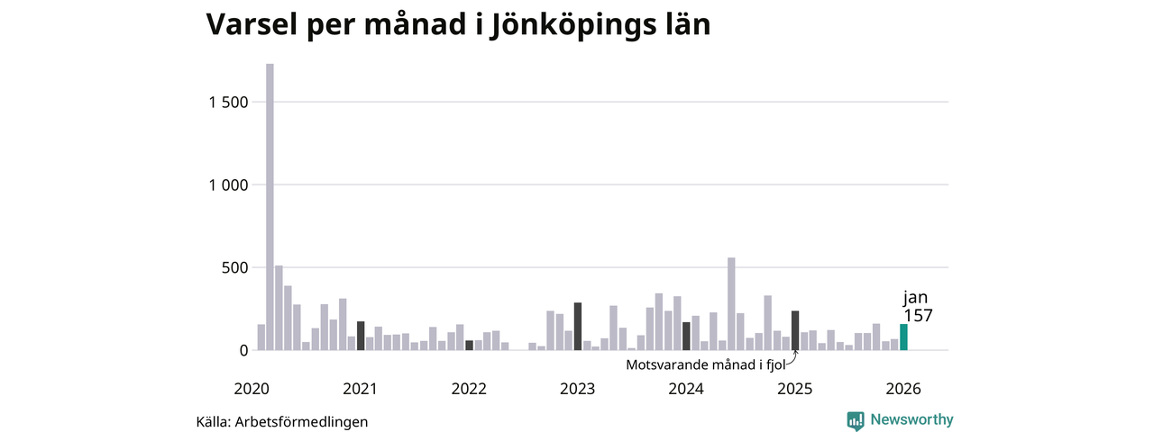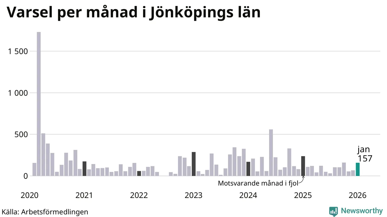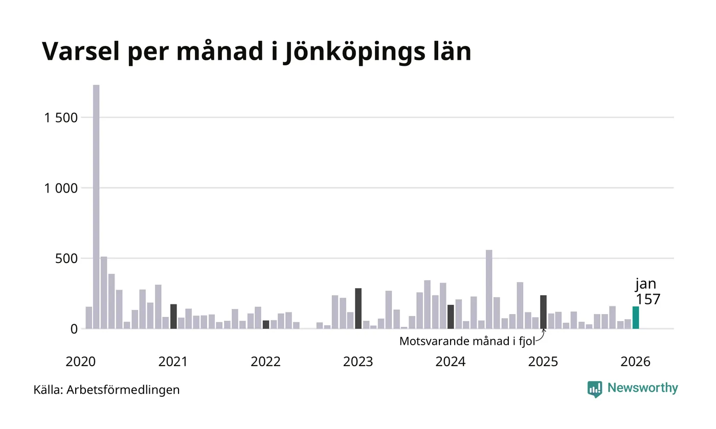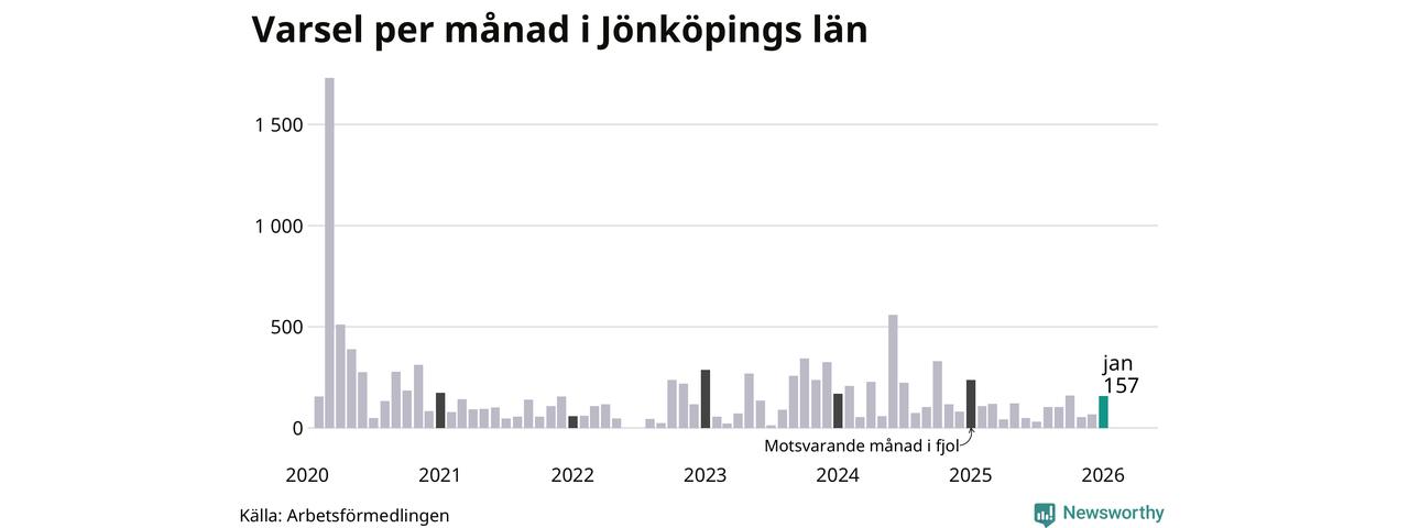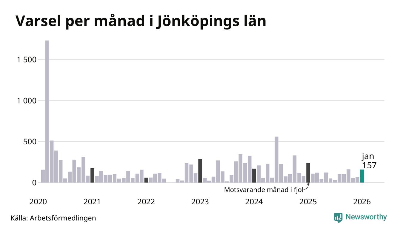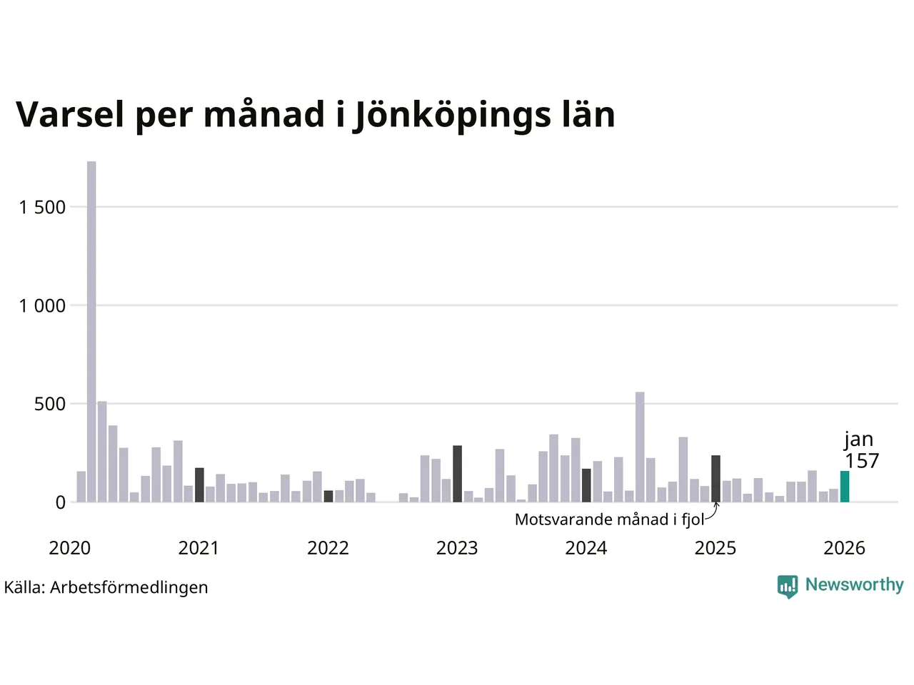157 personer varslades om uppsägning i Jönköpings län under januari 2026. Det är 89 fler än i december. För ett år sedan var antalet varsel 238 i länet. Sett över de tre senaste månaderna har totalt 278 varsel rapporterats i Jönköpings län, vilket är 158 färre än motsvarande period 2025. I början av pandemin, i mars 2020, varslades som mest 1 729 personer under en månad i Jönköpings län.