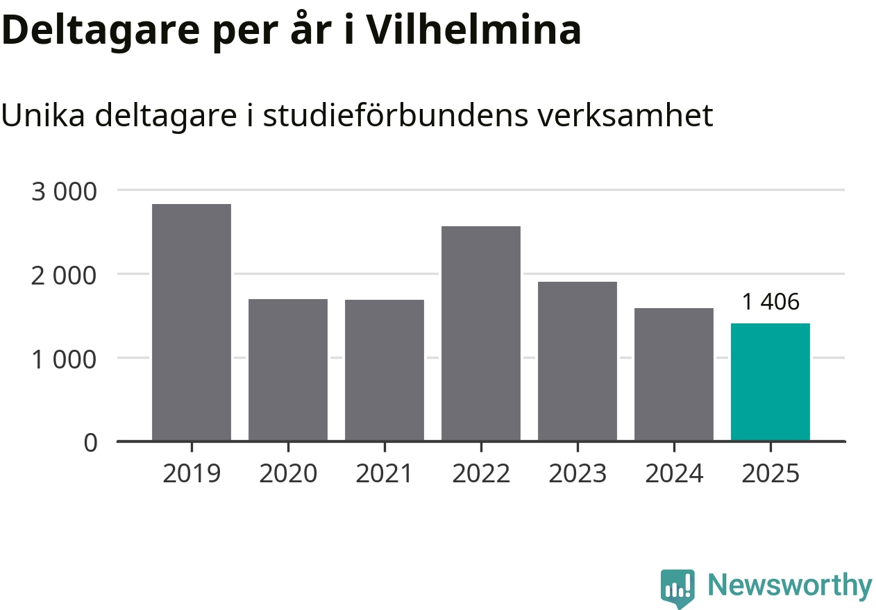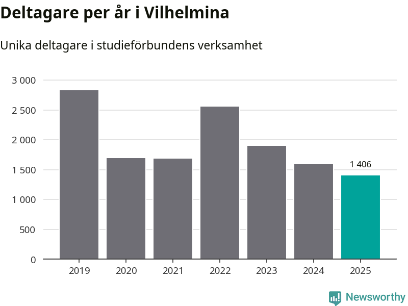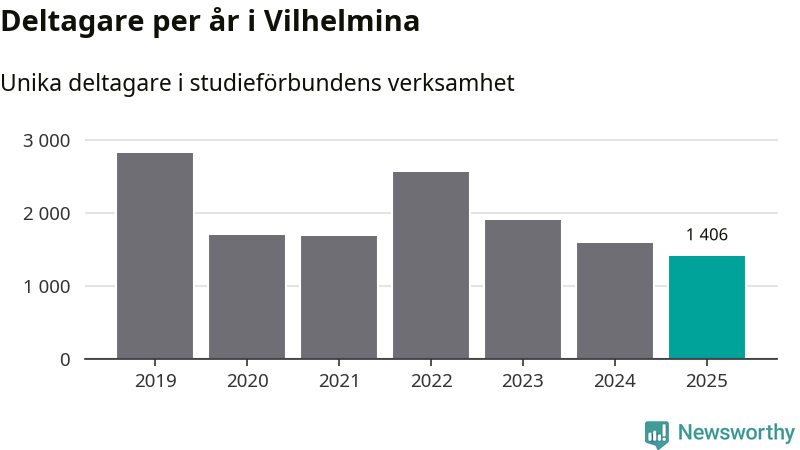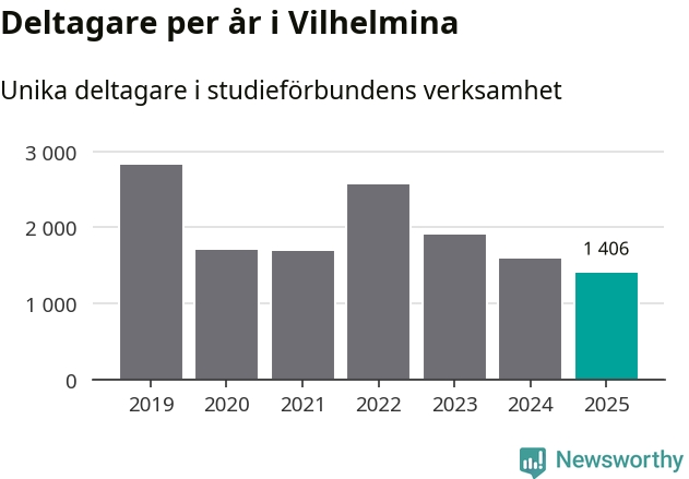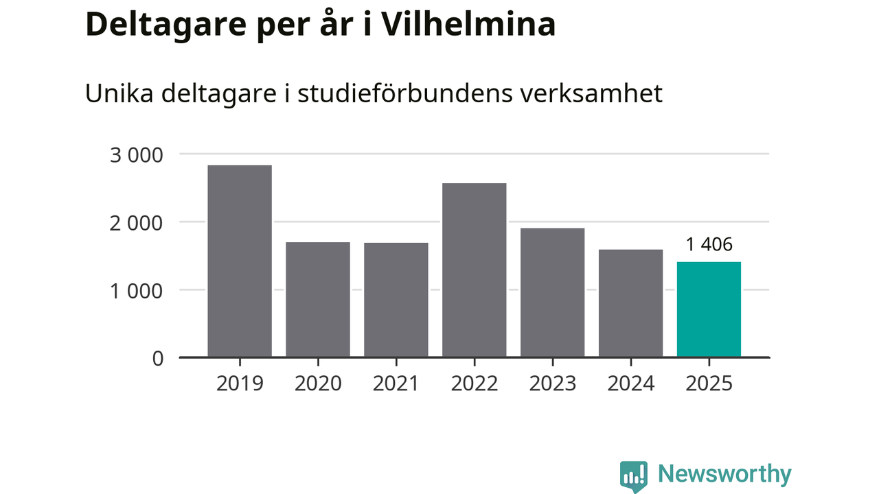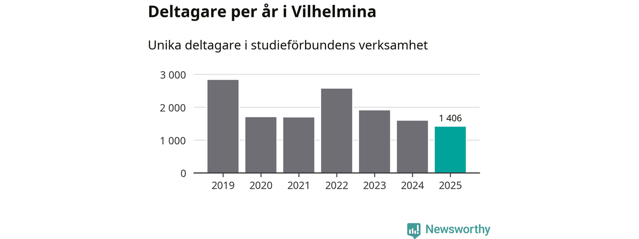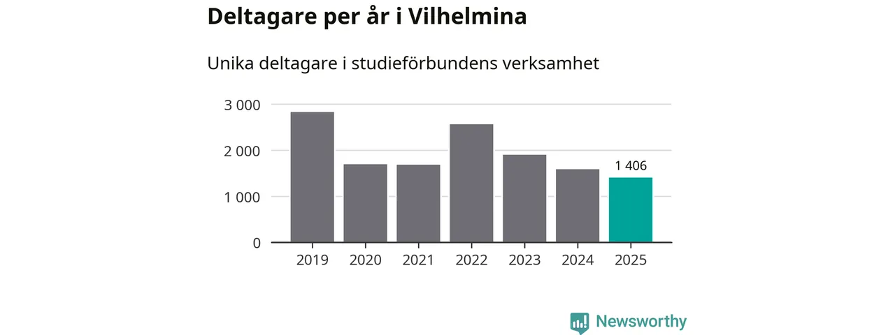 Även sett till unika deltagare är folkbildningen på tillbakagång i Vilhelmina. 2025 deltog 1 406 personer i studieförbundens verksamhet, vilket är en minskning med tolv procent jämfört med året innan. Det innebär att 23 procent av befolkningen i kommunen deltog i studieförbundens verksamhet under 2025. Det är den fjärde högsta andelen i landet och den högsta andelen i Västerbotten.