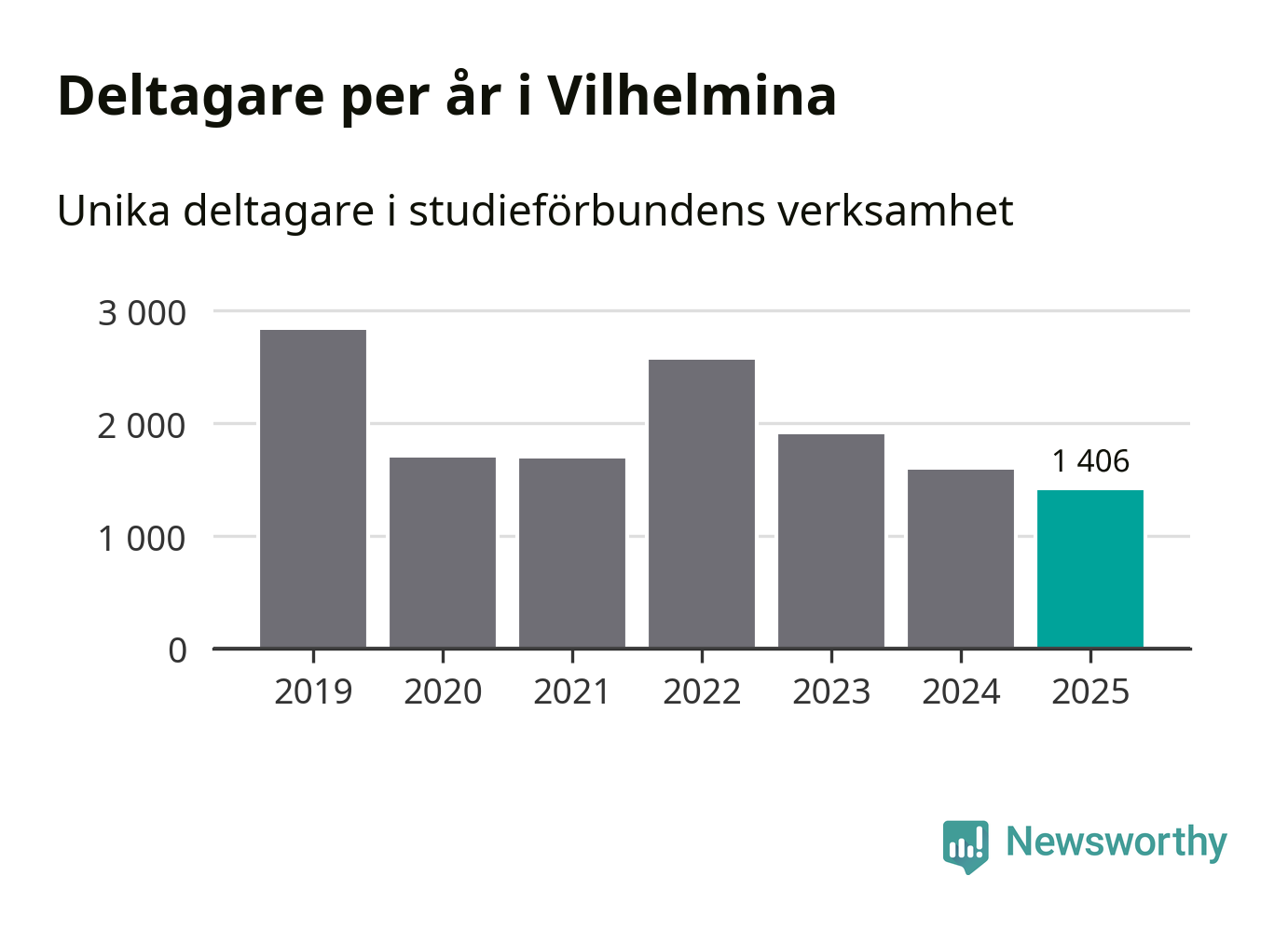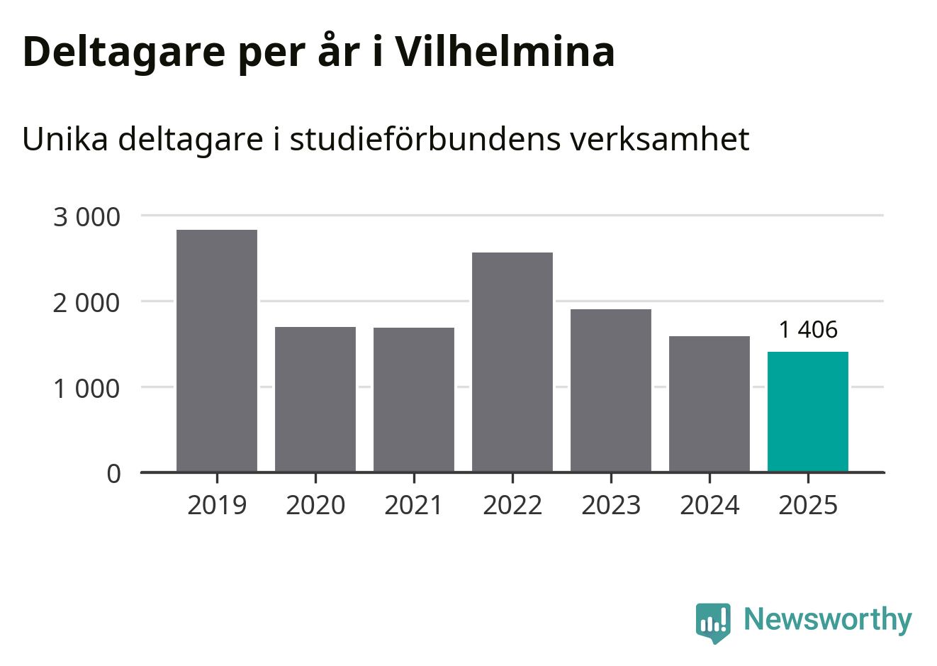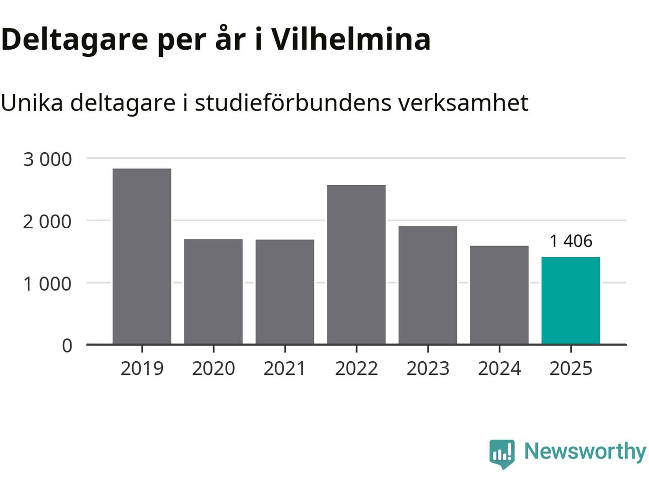 Även sett till unika deltagare är folkbildningen på tillbakagång i Vilhelmina. 2025 deltog 1 406 personer i studieförbundens verksamhet, vilket är en minskning med tolv procent jämfört med året innan. Det innebär att 23 procent av befolkningen i kommunen deltog i studieförbundens verksamhet under 2025. Det är den fjärde högsta andelen i landet och den högsta andelen i Västerbotten.