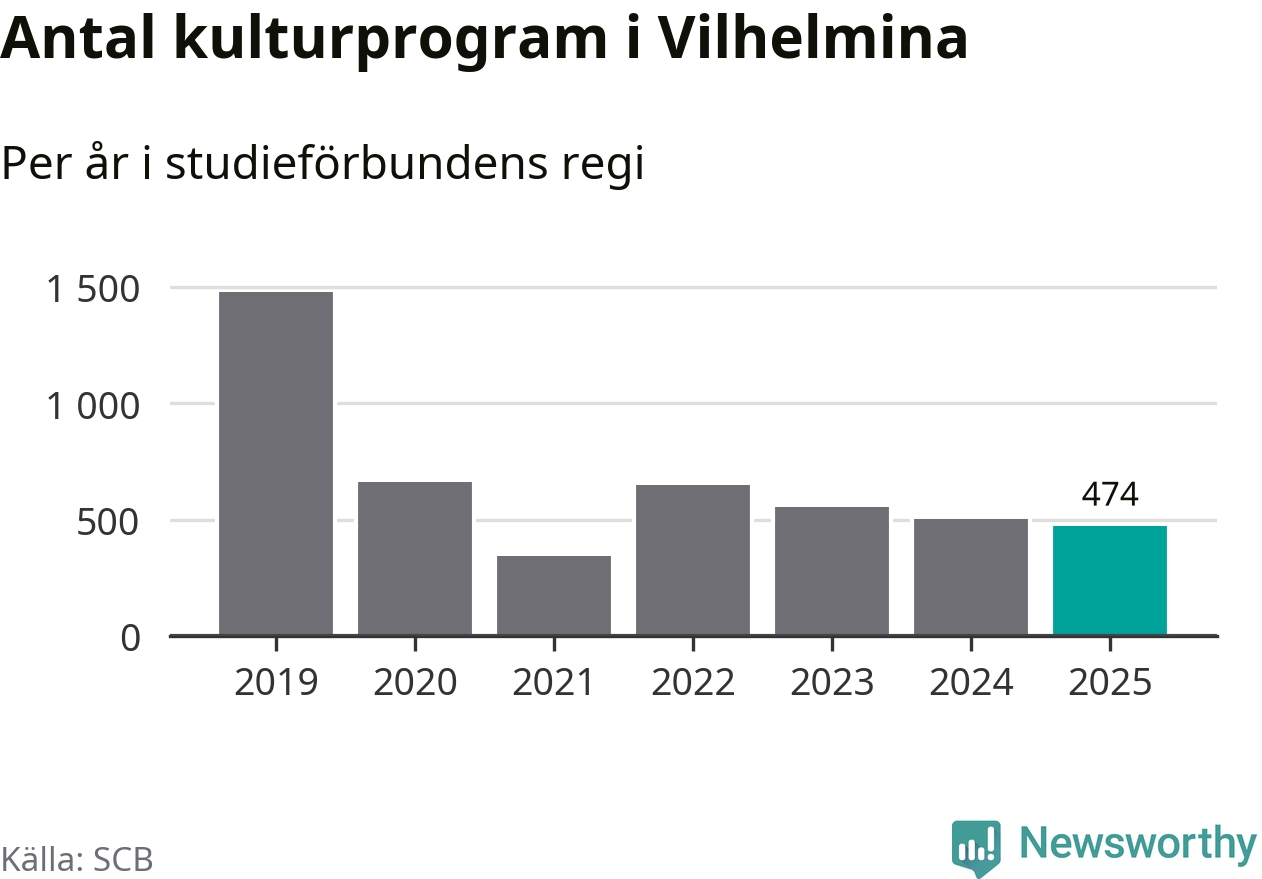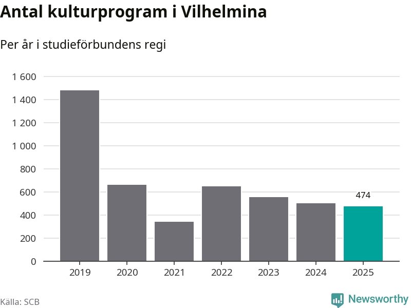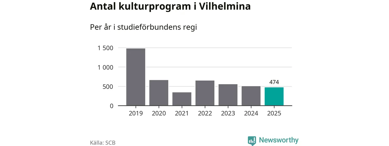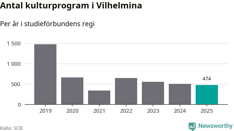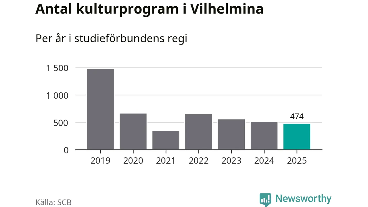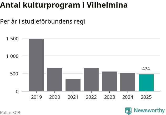 Minskningen är lika stor i Vilhelmina. Förra året hade studieförbunden omkring 5 100 studietimmar i kommunen jämfört med omkring 5 500 året innan. Även antalet kulturprogram i studieförbundens regi minskade, från 501 till 474 stycken.
