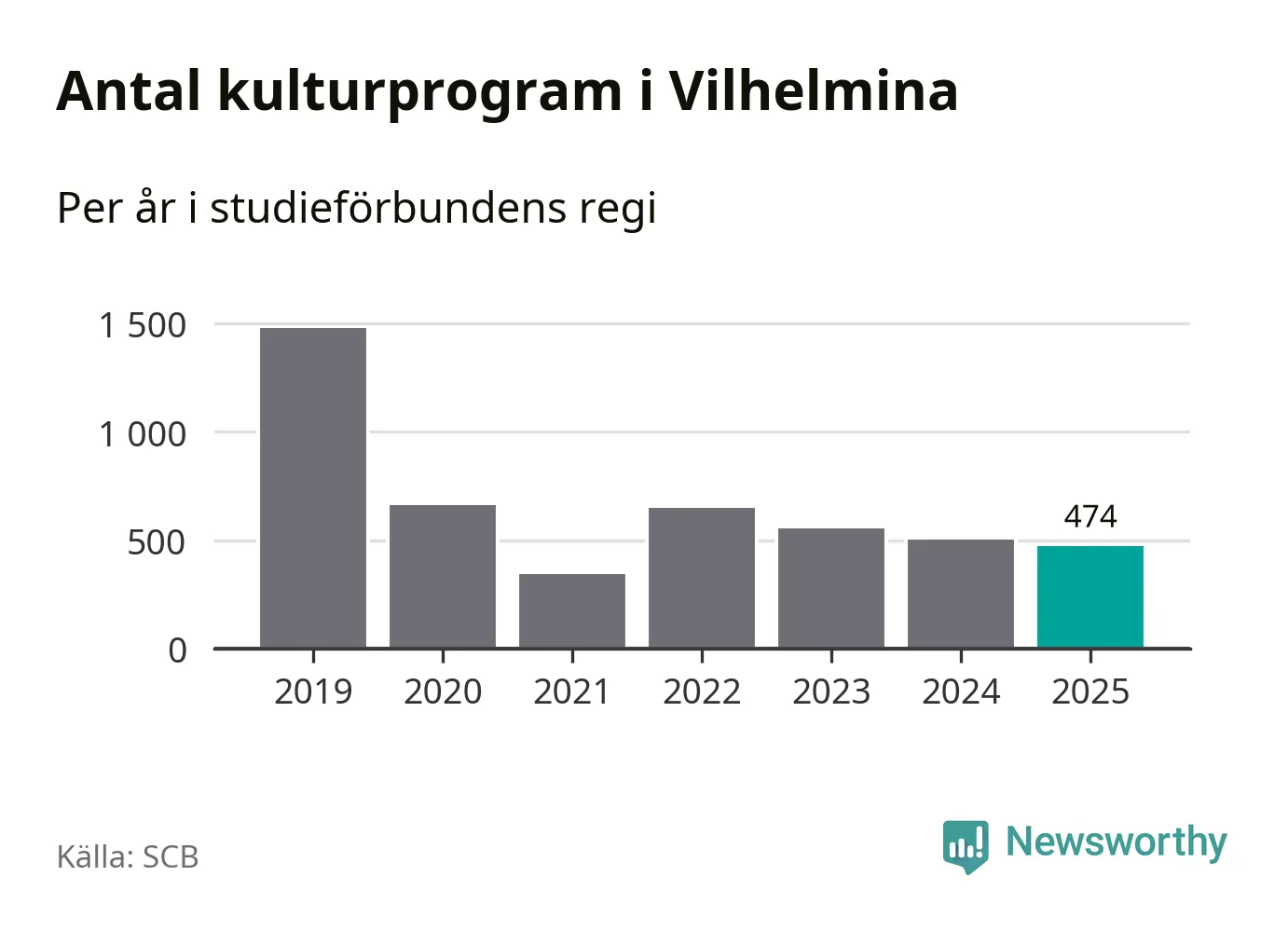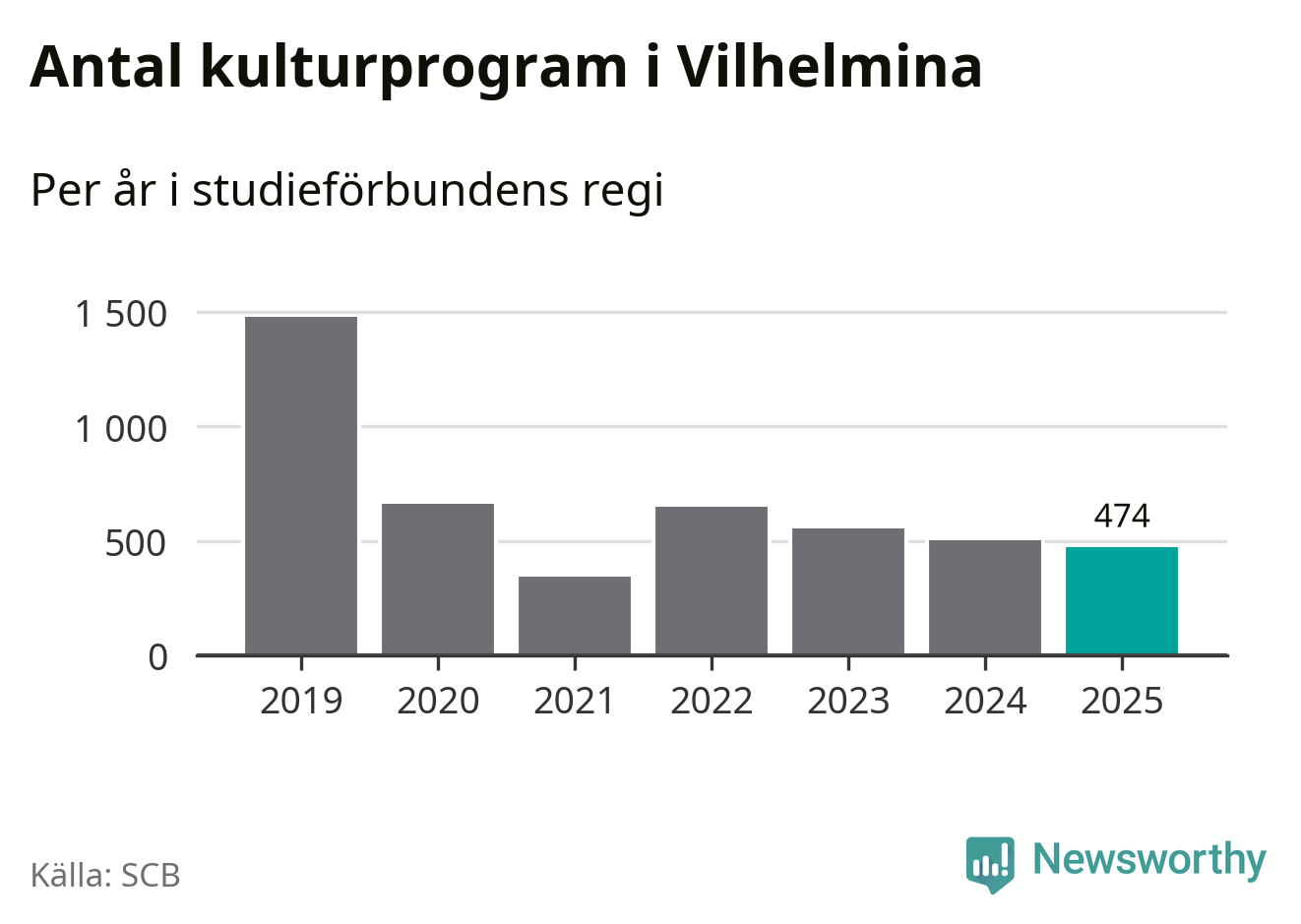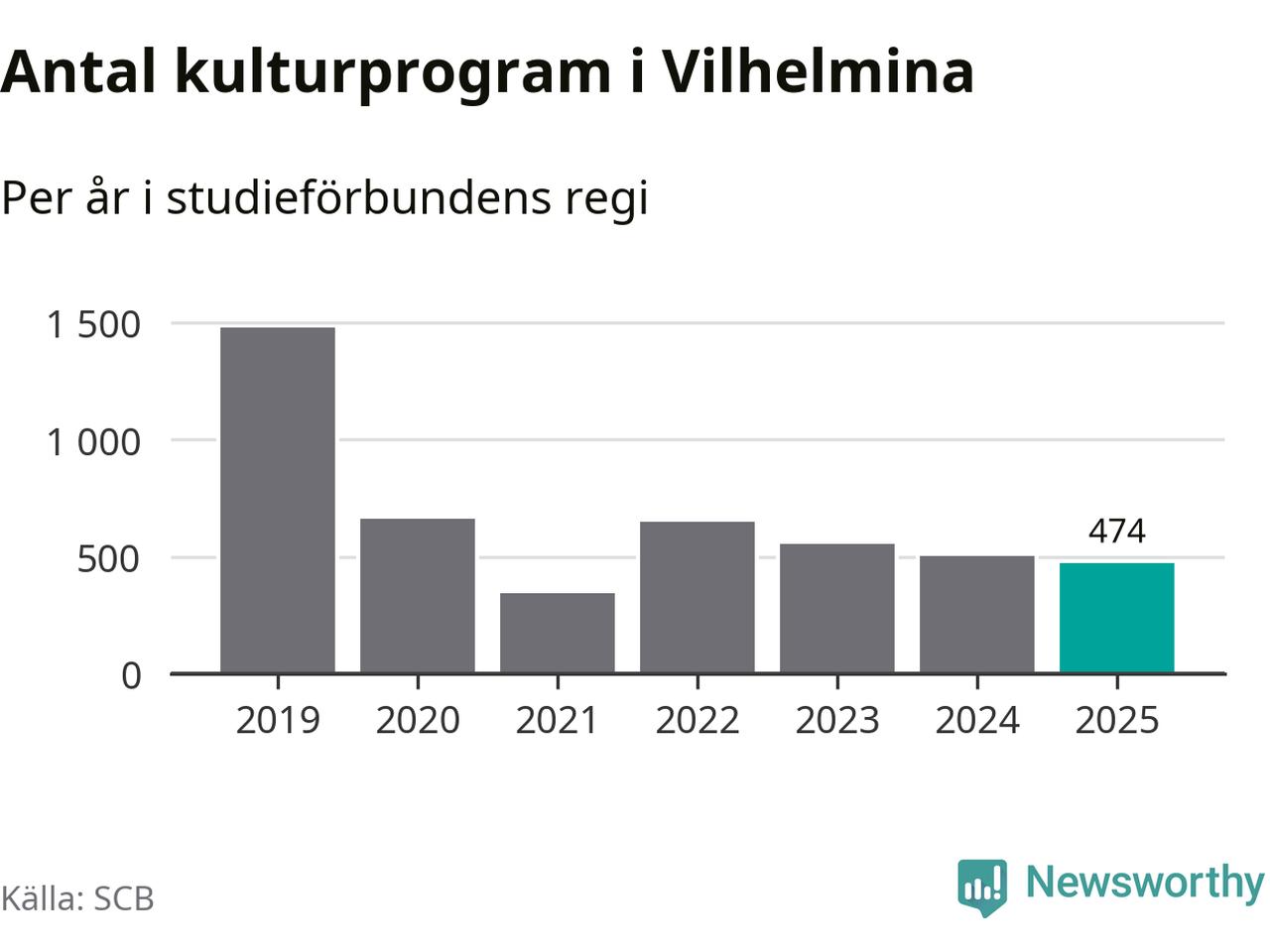 Minskningen är lika stor i Vilhelmina. Förra året hade studieförbunden omkring 5 100 studietimmar i kommunen jämfört med omkring 5 500 året innan. Även antalet kulturprogram i studieförbundens regi minskade, från 501 till 474 stycken.