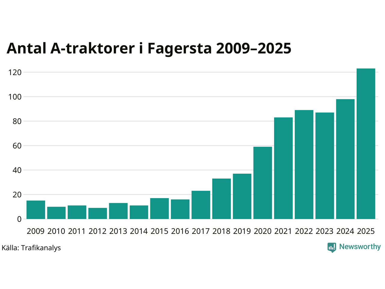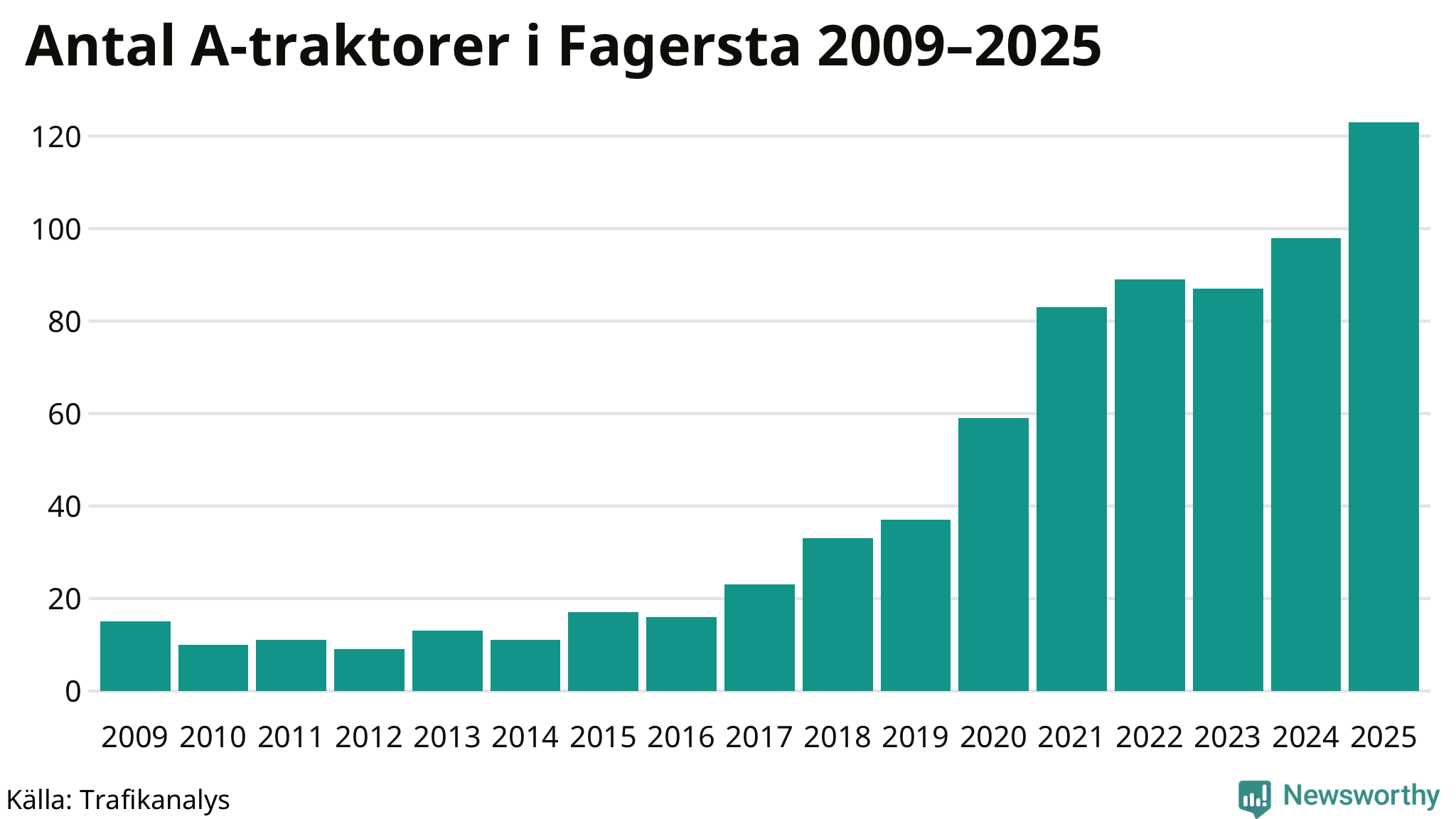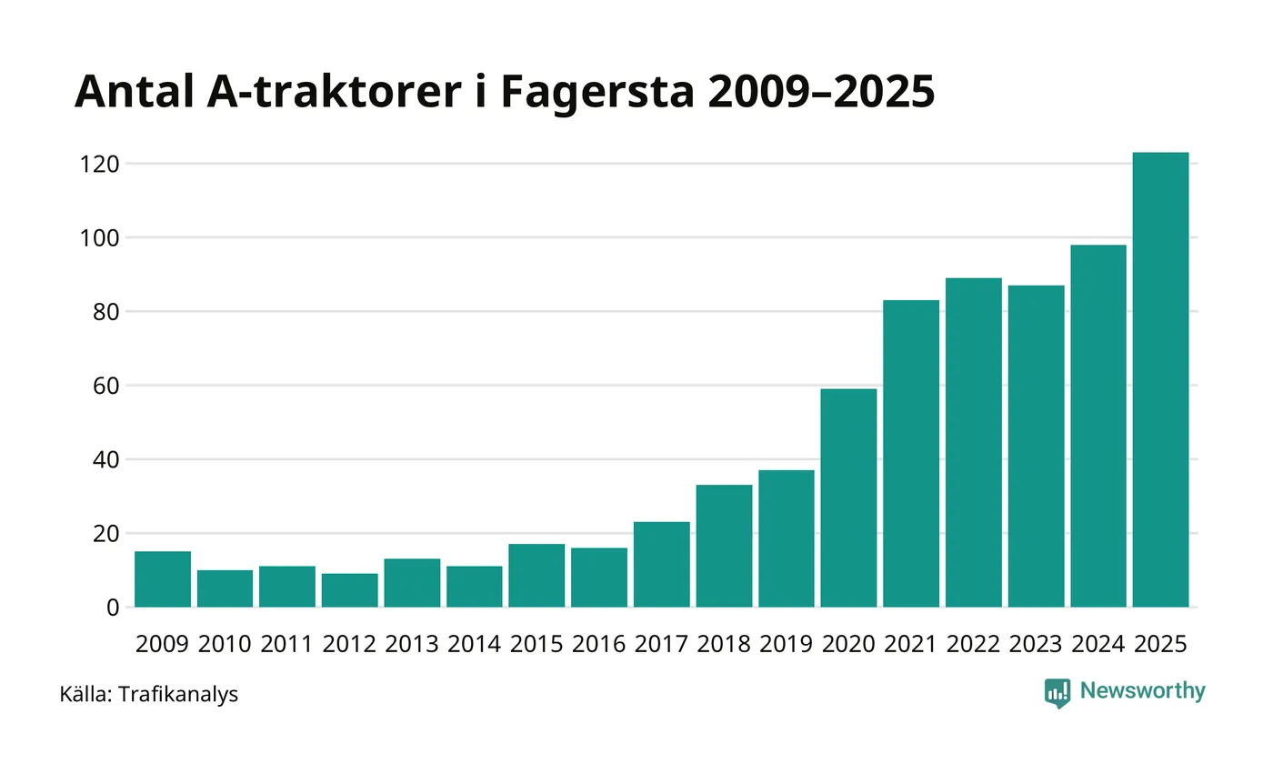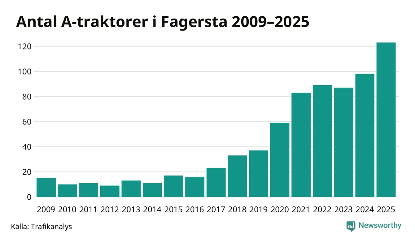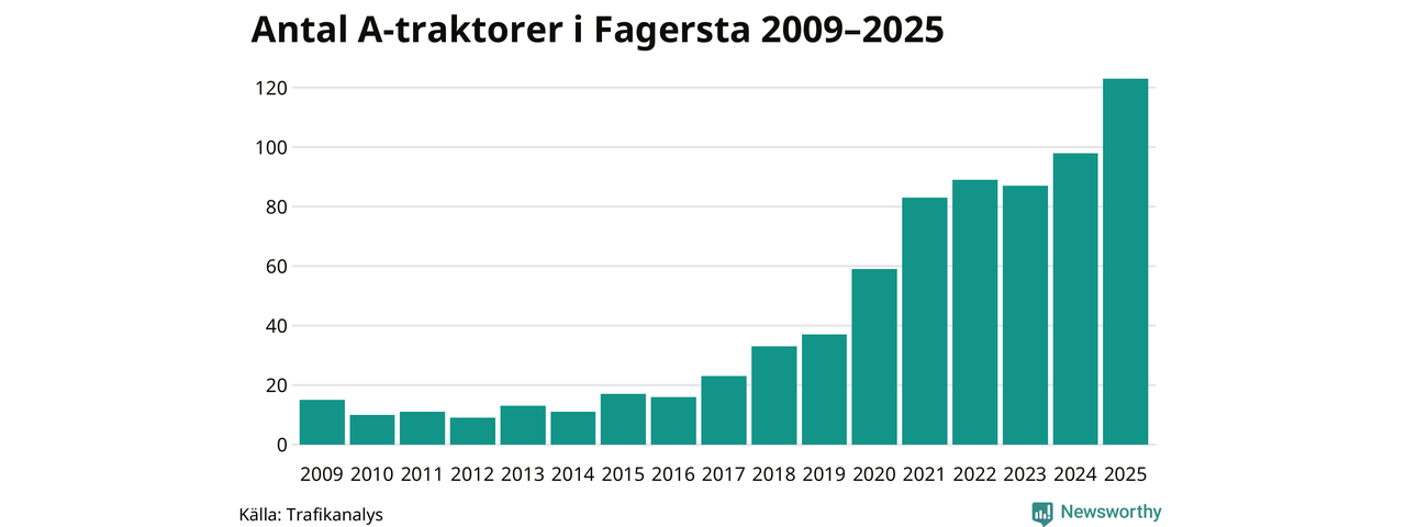 För andra året i rad ökar antalet A-traktorer i Fagersta kommun, visar nya siffror från Trafikanalys. I slutet av 2025 fanns 123 A-traktorer registrerade i kommunen, vilket är 25 mer än året innan – en ökning med 26 procent. Det visar nya siffror från Trafikanalys. Ökningen är den största från ett år till ett annat någonsin i Fagersta kommun i absoluta tal och den näst största ökningen i Västmanlands län i år.