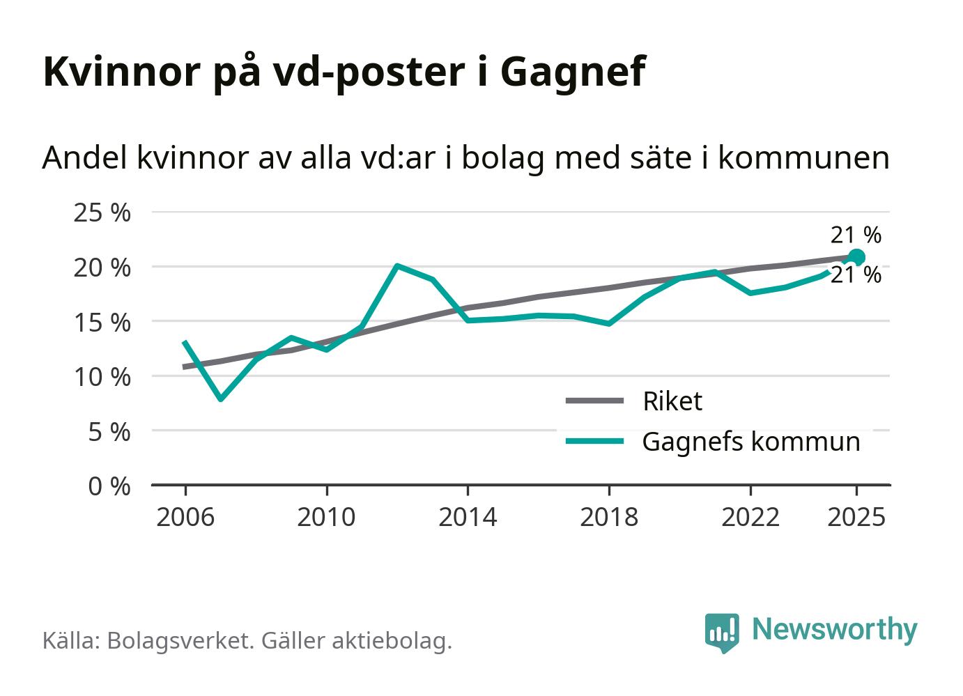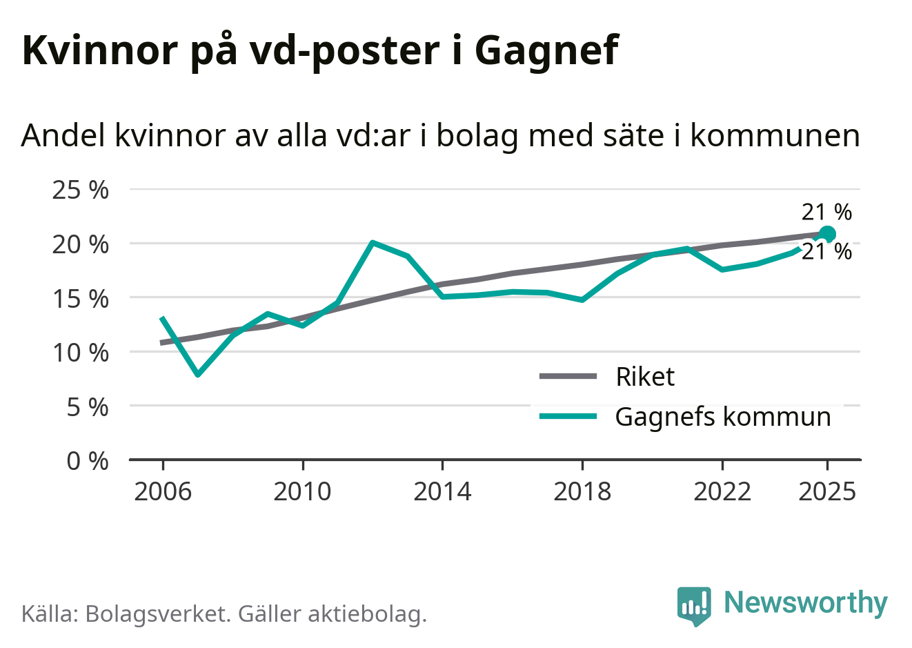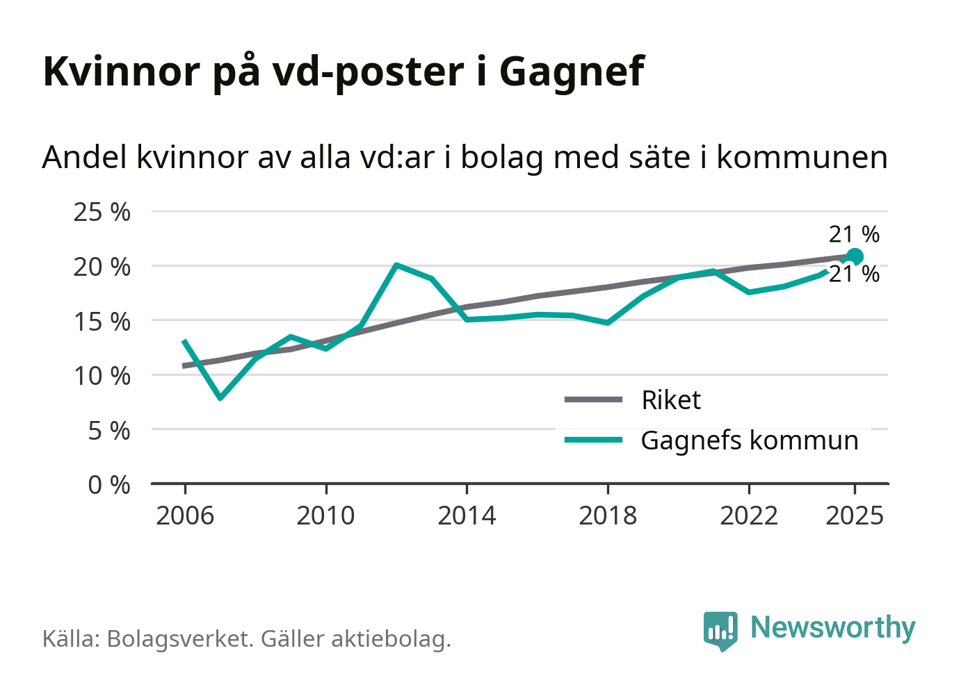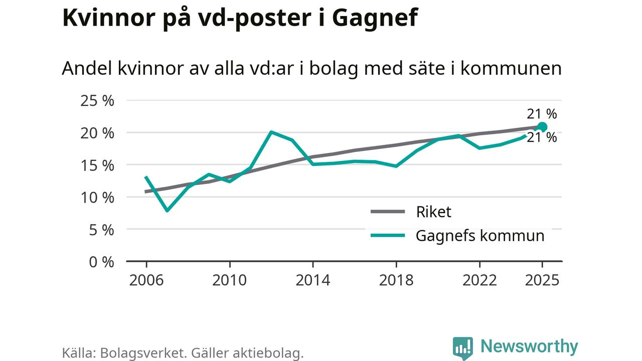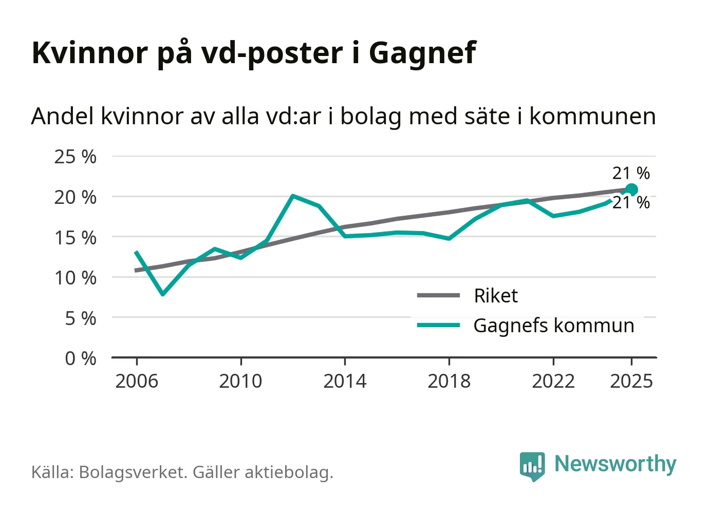 21 procent av aktiebolagen med registrerad vd i Gagnef hade en kvinna på posten vid årsskiftet. Det innebär att på varje kvinnlig vd går fyra män.